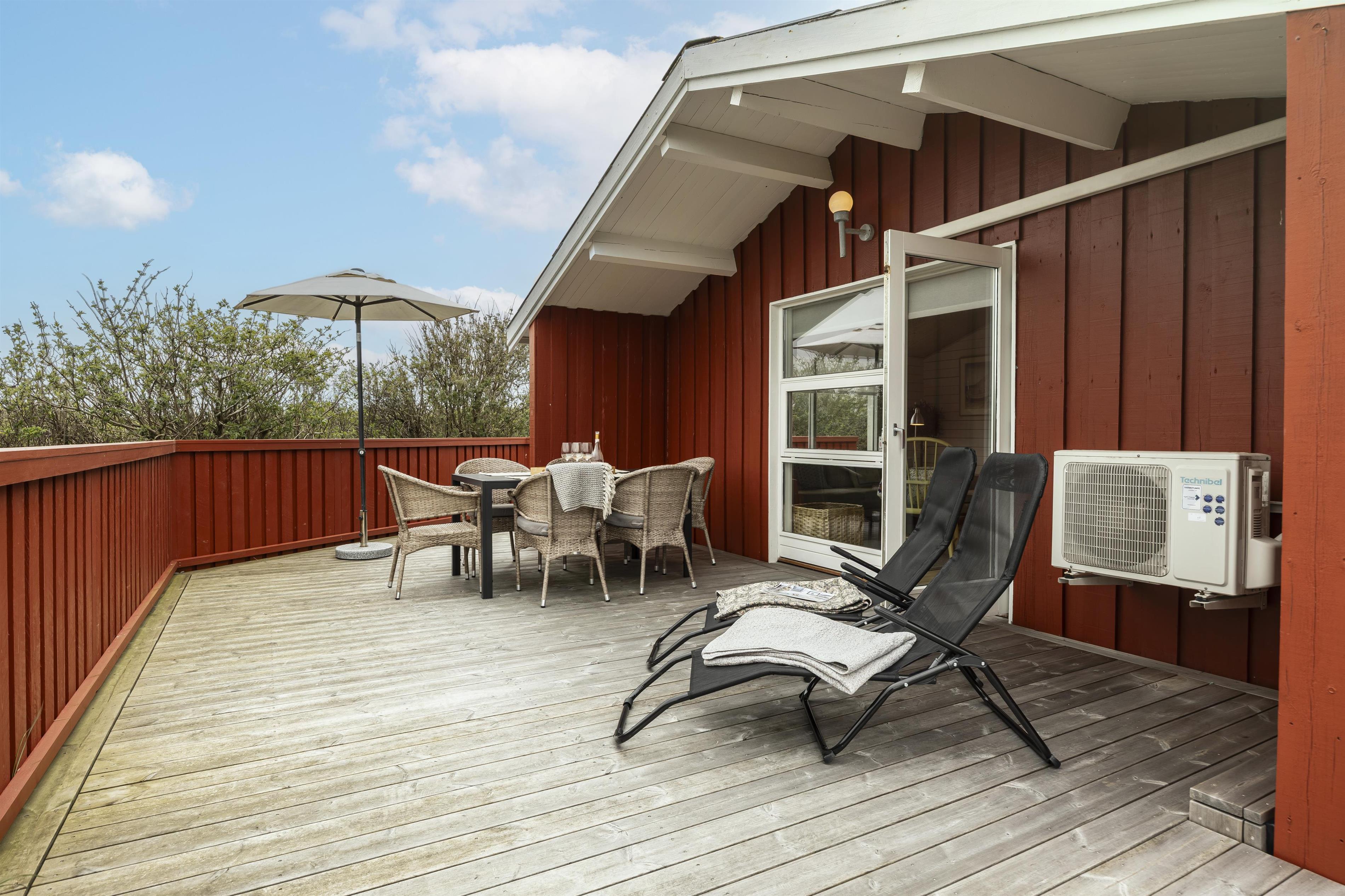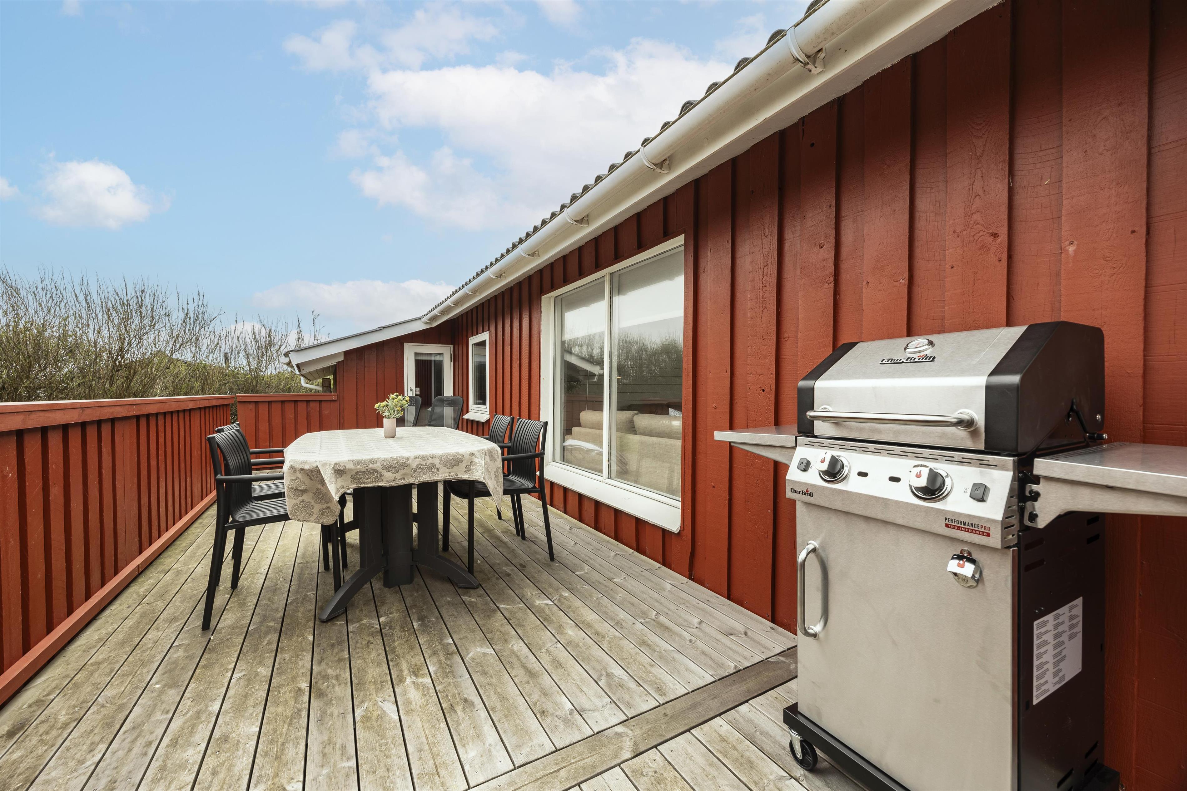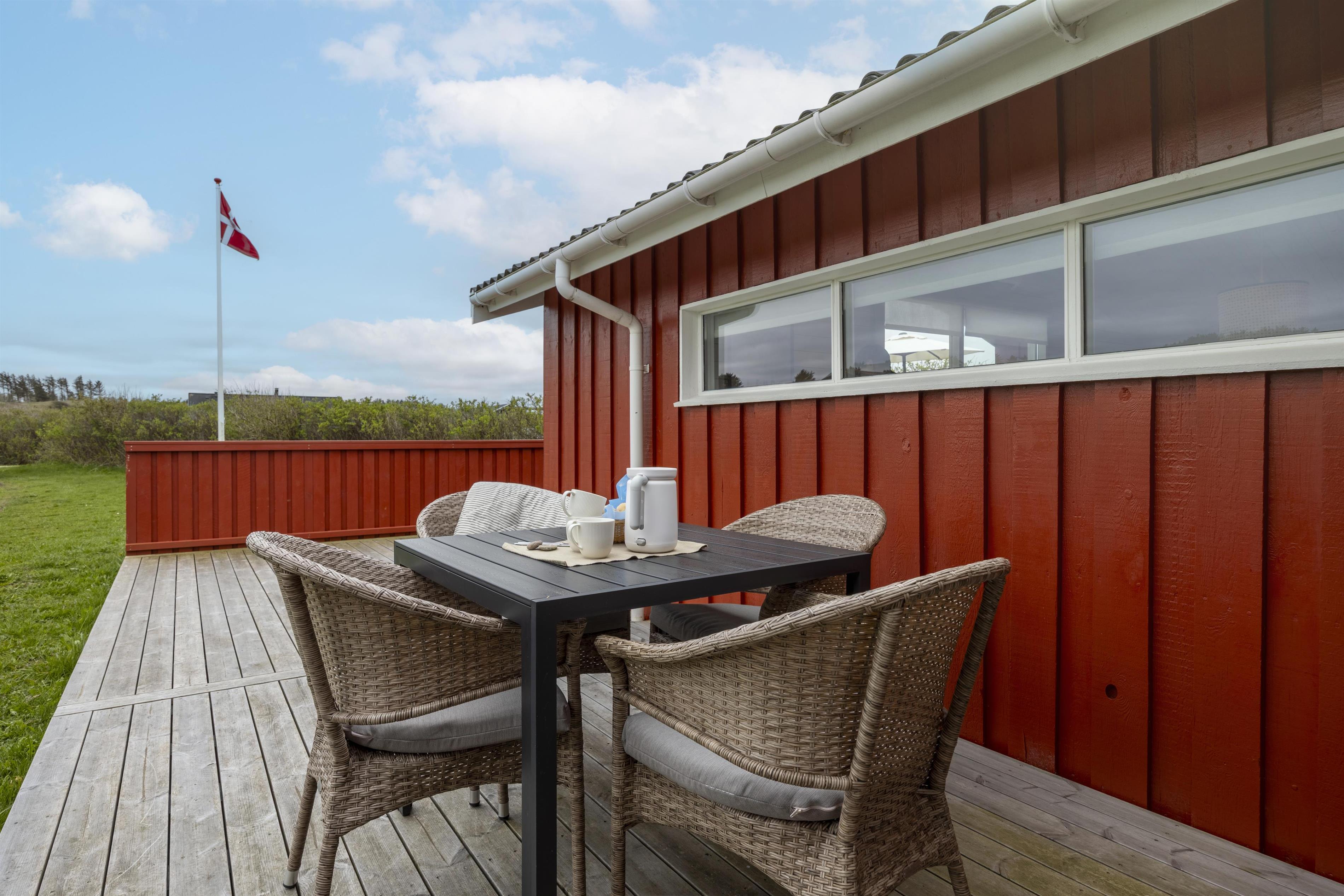 Rundt om huset finder du flere skønne terrasser, hvor solen kan følges hele dagen. Her kan du læne dig tilbage med en god bog, nyde grillmad i aftensolen eller bare slappe af i en liggestol – helt ugeneret. Huset ligger dejligt tilbagetrukket fra vejen, så du får en fredelig ferieoplevelse i fuldstændig ro og med masser af privatliv. Der er på grunden også god plads til boldspil, et slag kroket eller kongespil - kun fantasien sætter grænser.