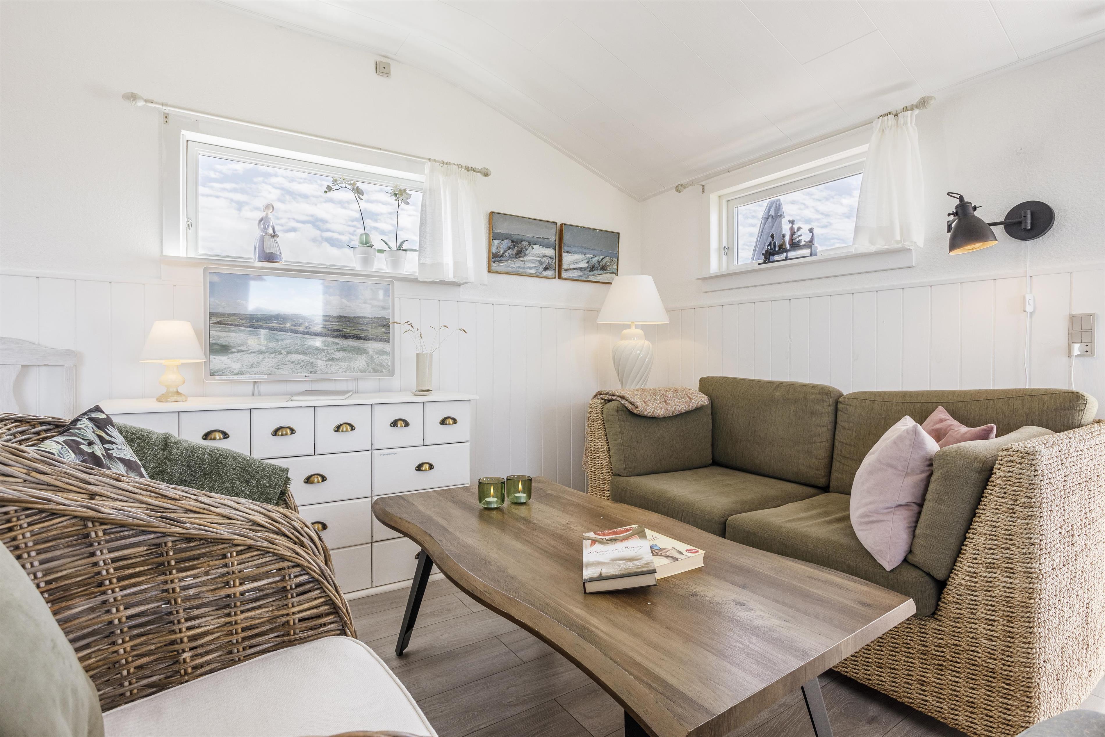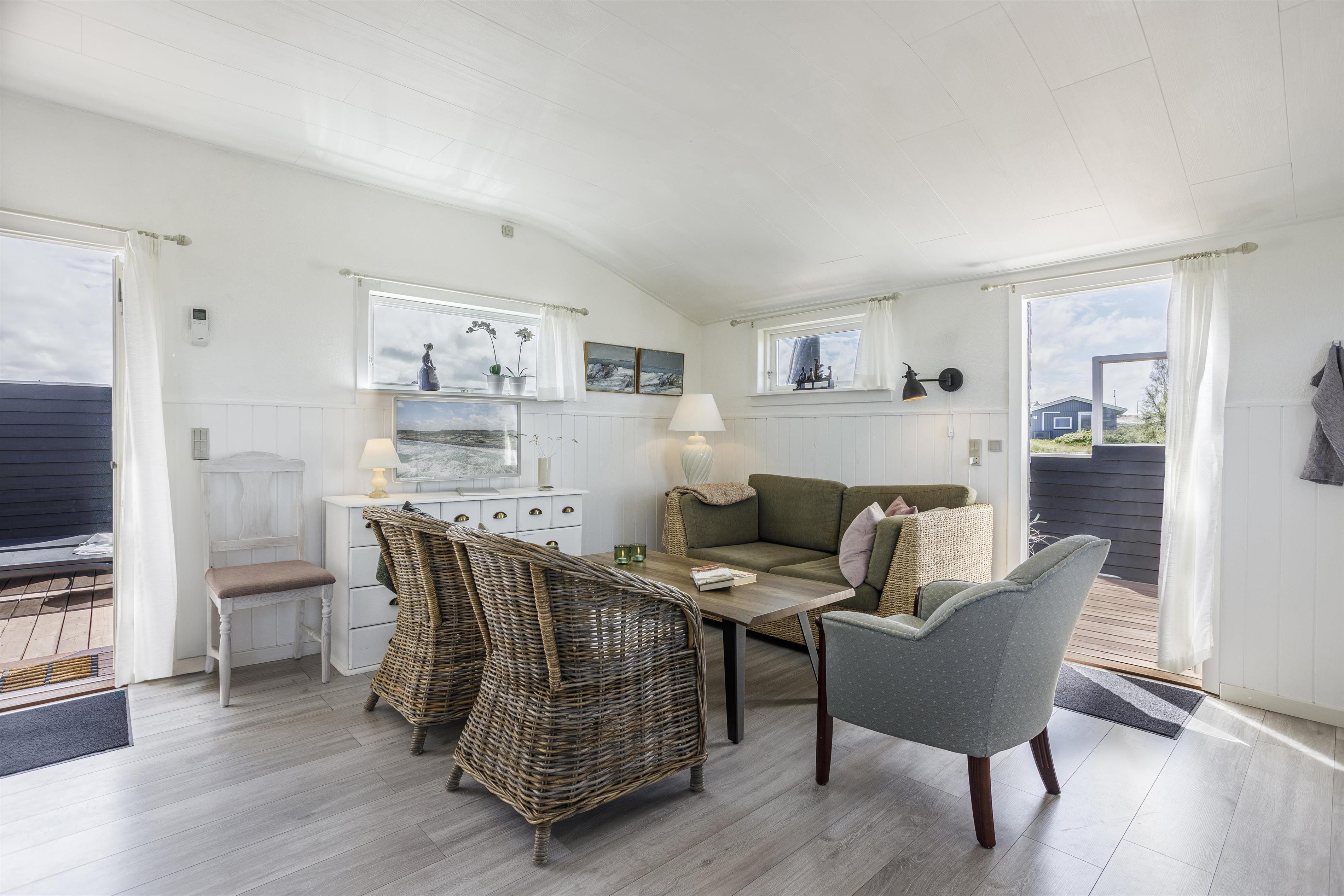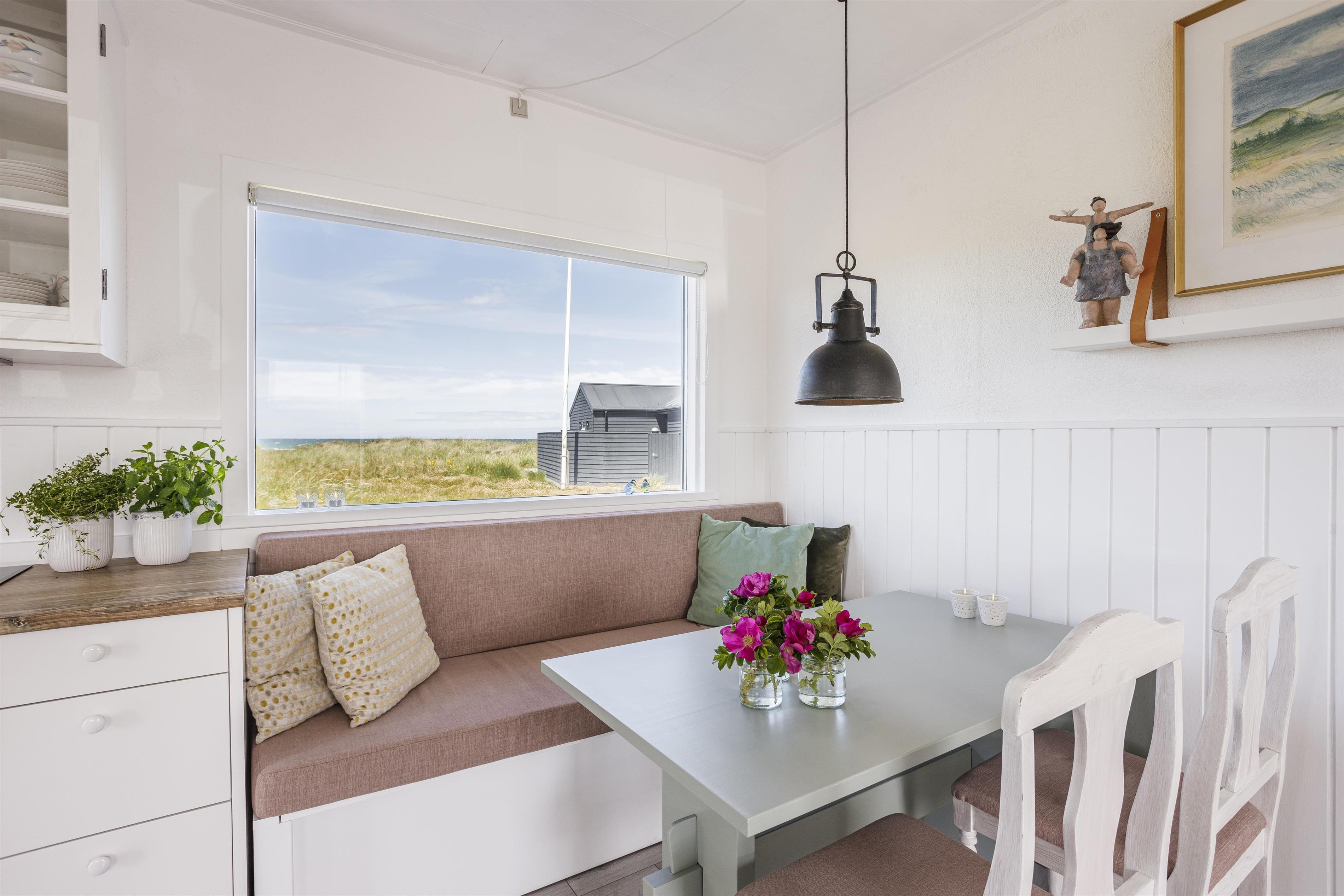 Dette dejlige sommerhus med plads til 4 personer består af et åbent køkkenalrum og stue, hvor I fra spisepladsen kan nyde udsigten til havet. Sengepladserne fordeler sig på to gode soveværelser, som er hyggeligt indrettet og med fine skabsløsninger til opbevaring. Fra det store soveværelse er der udgang til terrasse, så du kan invitere havbrise og fuglefløjt ind. Husets vinduer sikrer et dejligt lysindfald, og indretningen er holdt i sarte farver, som harmonerer smukt med den omkringliggende natur og skaber en behagelig og indbydende atmosfære.
