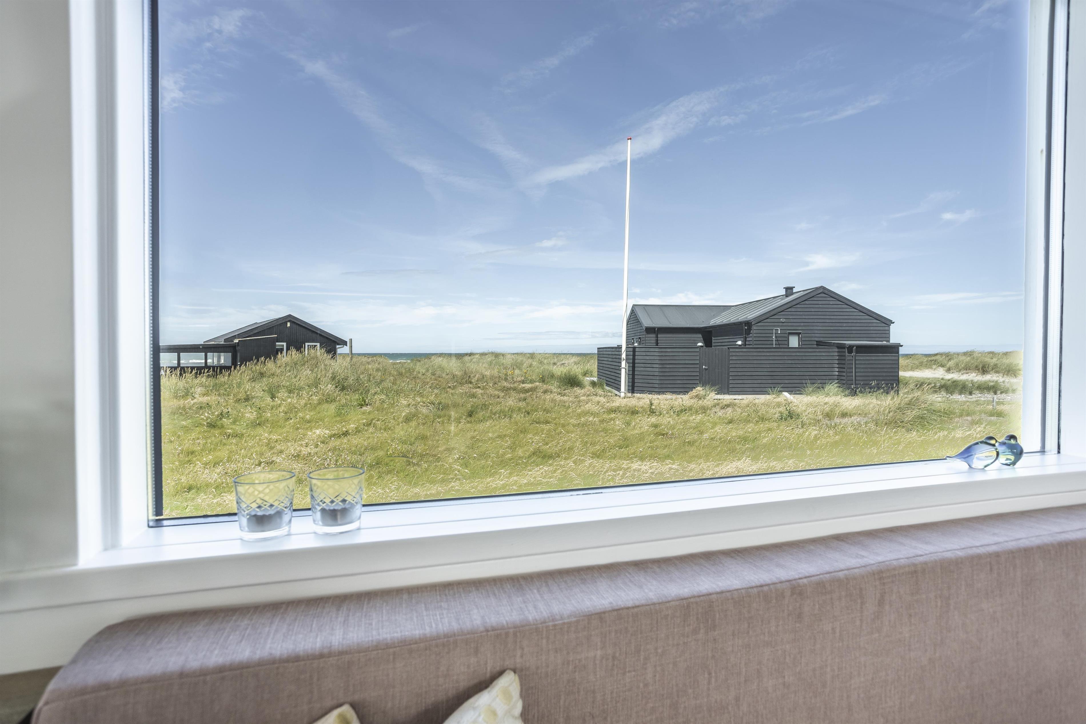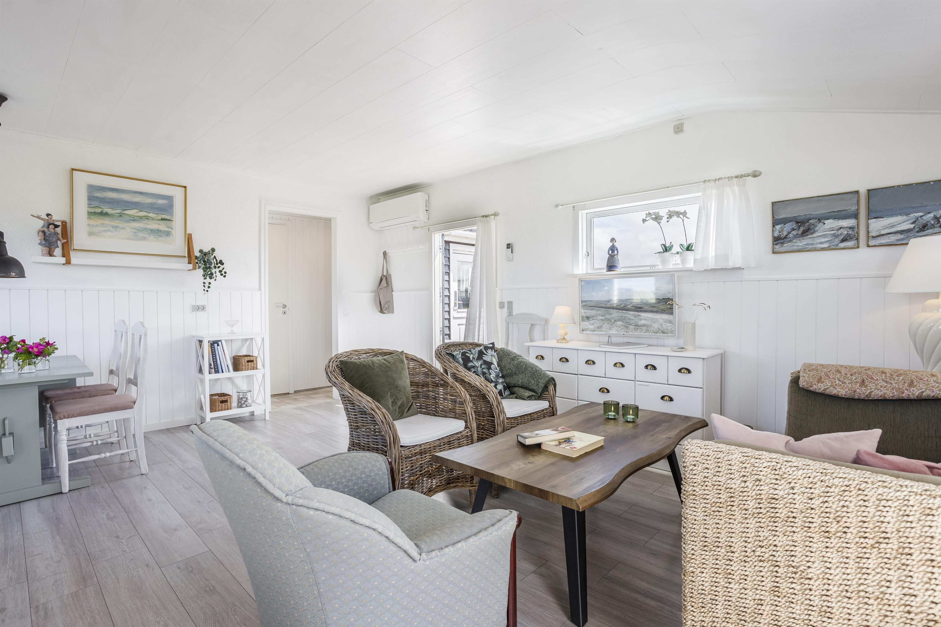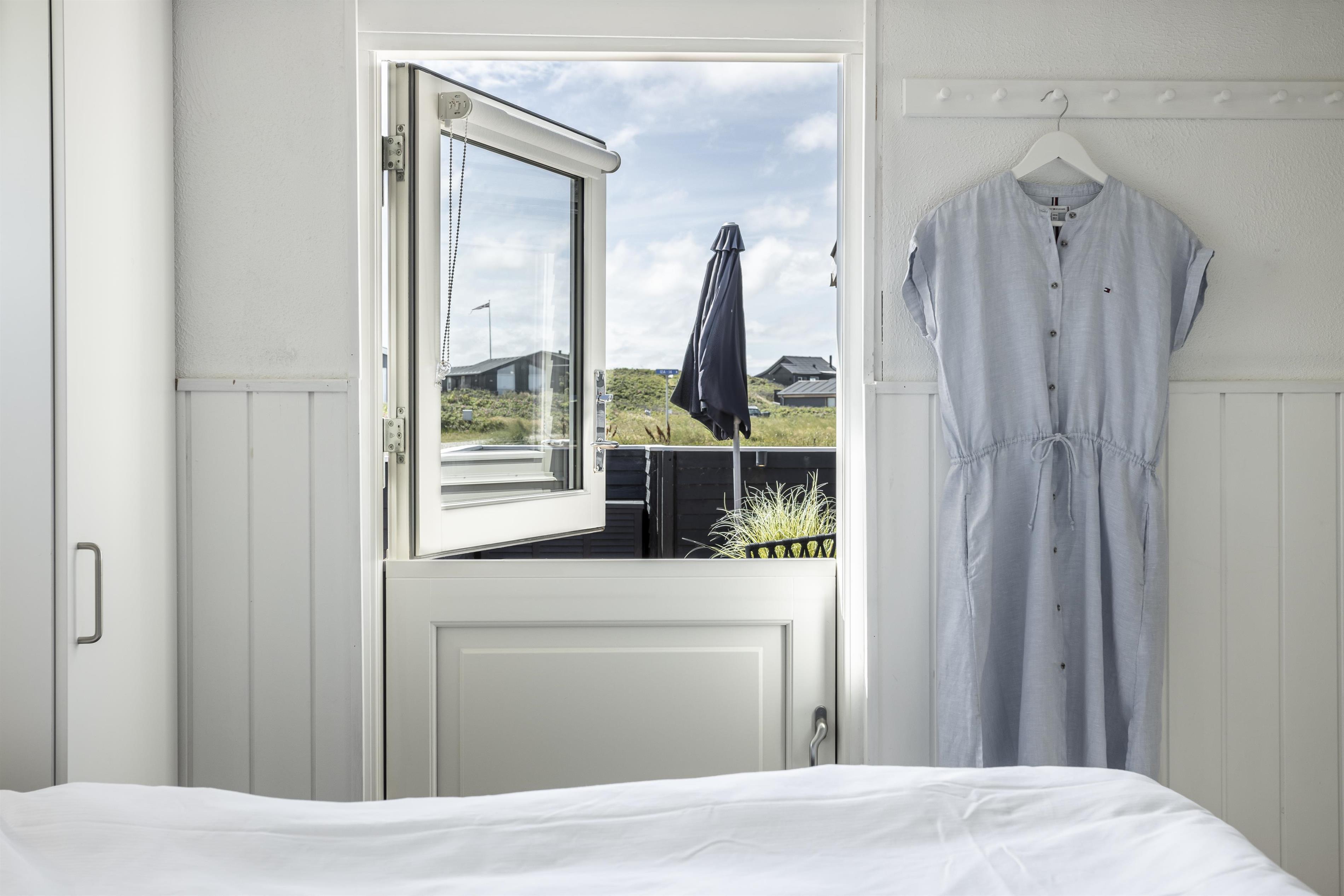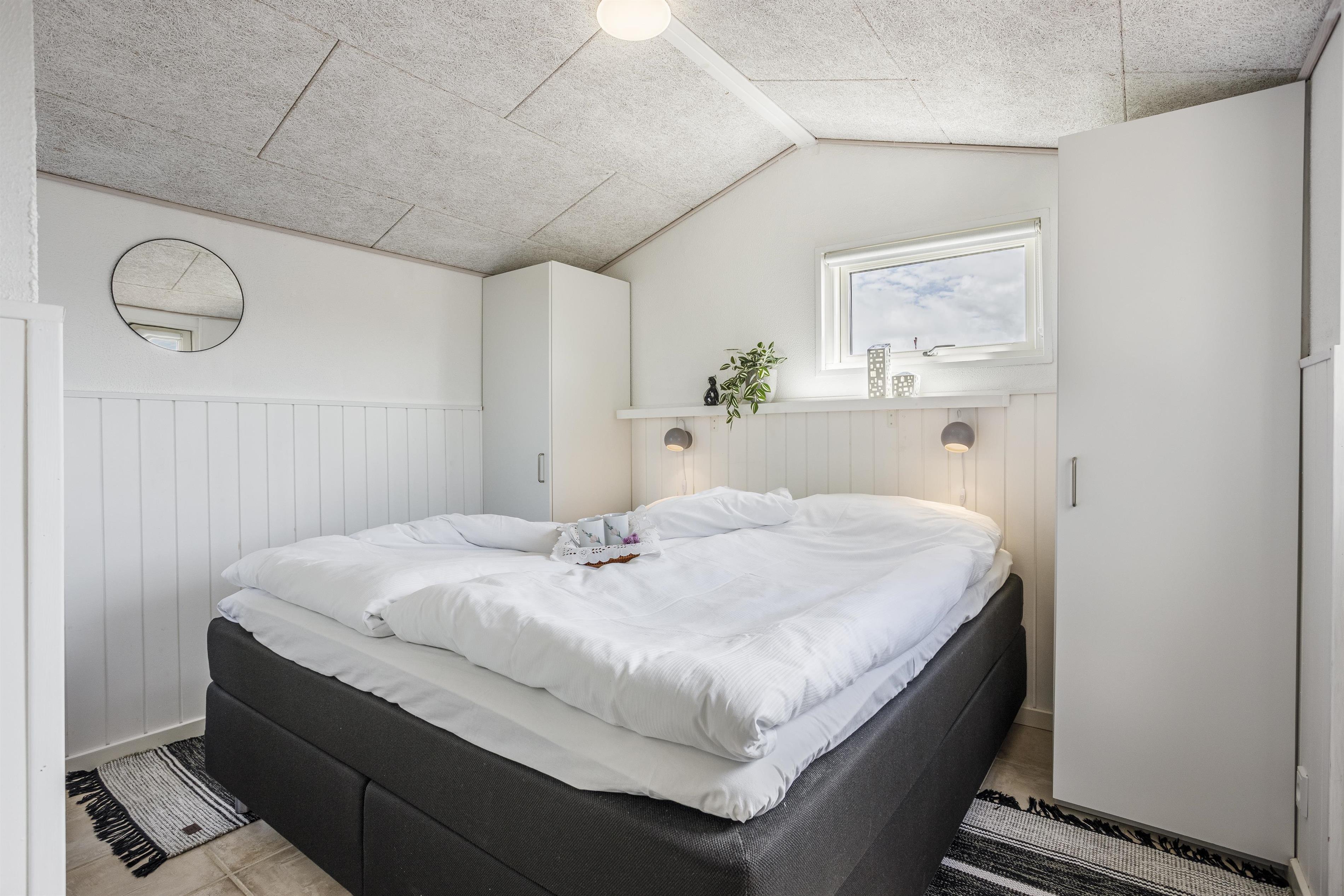 Dette dejlige sommerhus med plads til 4 personer består af et åbent køkkenalrum og stue, hvor I fra spisepladsen kan nyde udsigten til havet. Sengepladserne fordeler sig på to gode soveværelser, som er hyggeligt indrettet og med fine skabsløsninger til opbevaring. Fra det store soveværelse er der udgang til terrasse, så du kan invitere havbrise og fuglefløjt ind. Husets vinduer sikrer et dejligt lysindfald, og indretningen er holdt i sarte farver, som harmonerer smukt med den omkringliggende natur og skaber en behagelig og indbydende atmosfære.