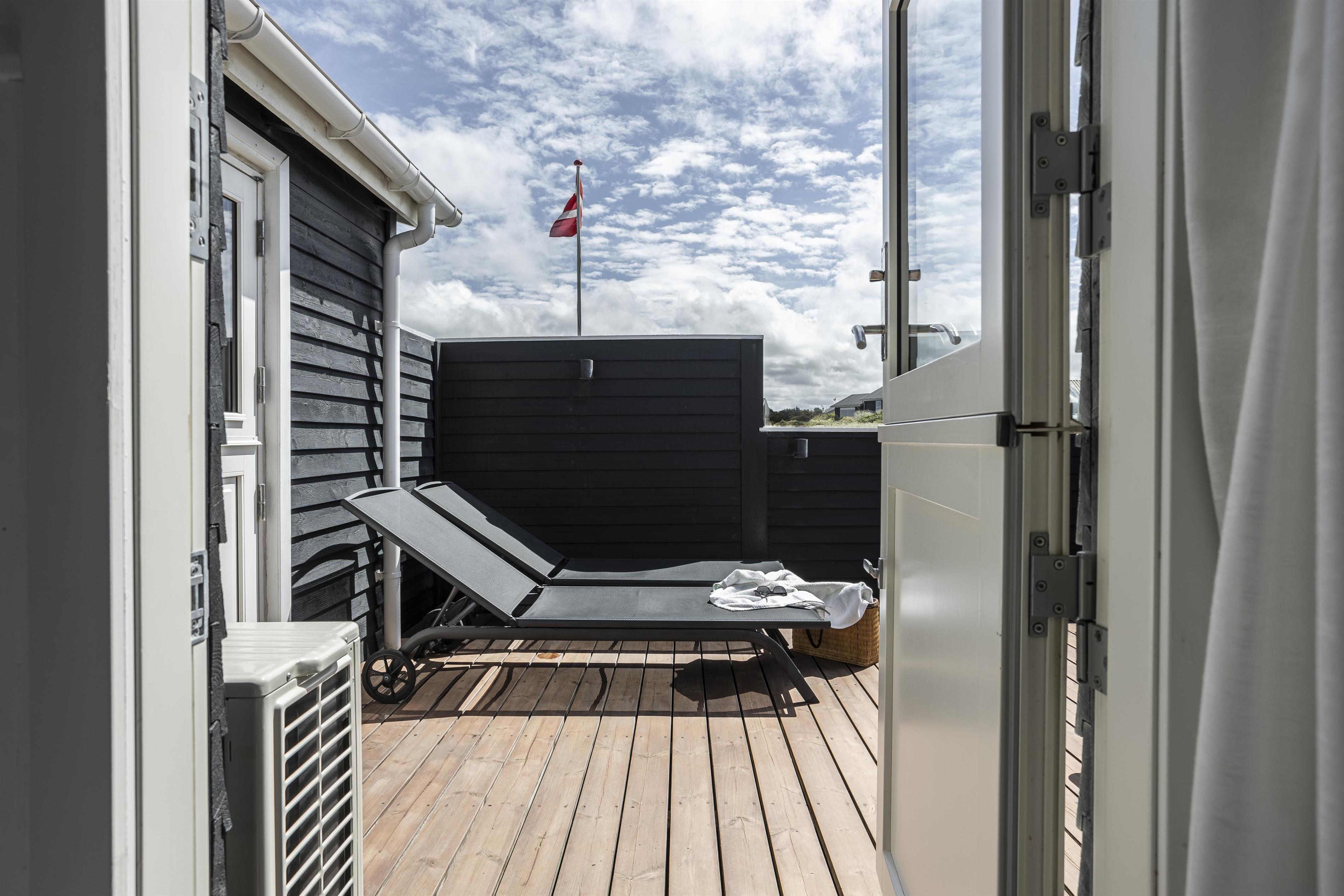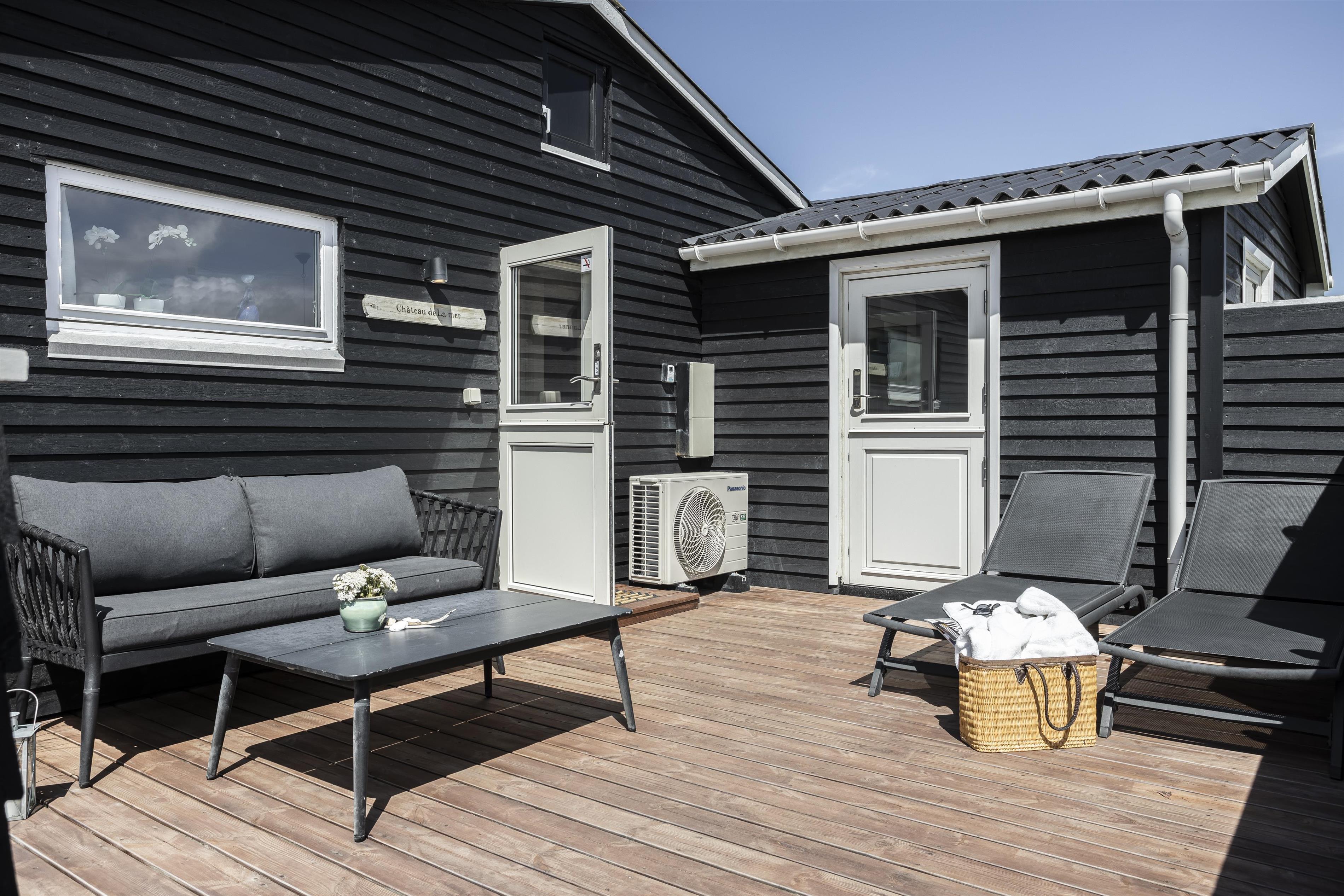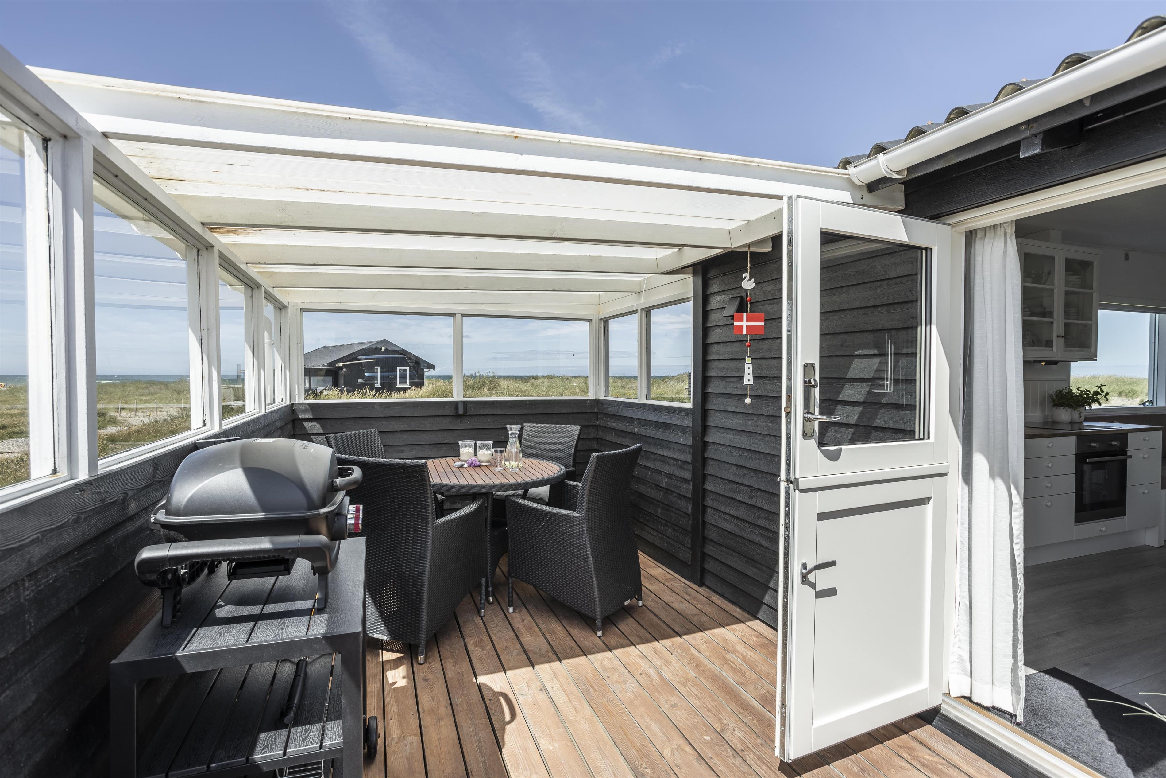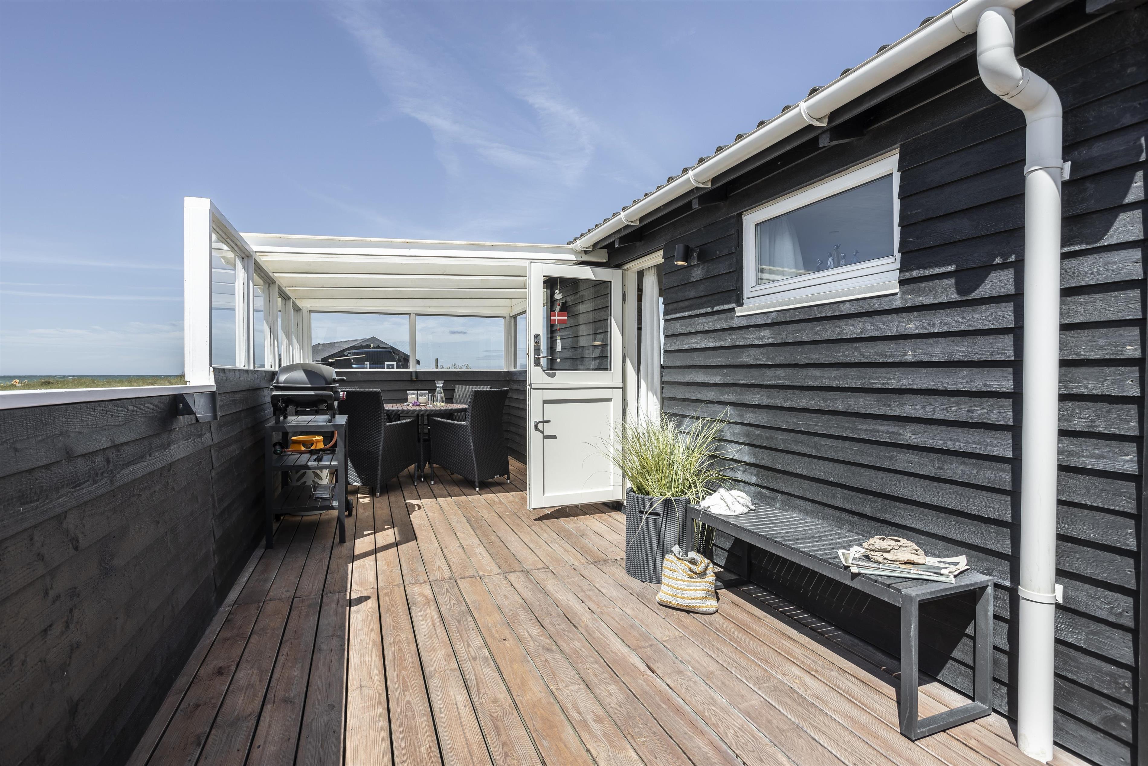 Sommerhuset ligger på en stor naturgrund og byder på flere skønne terrasser. Den ene er overdækket, og er derfor oplagt, når duggen falder, eller hvis vejret viser sig fra en drilsk side. Efter en afslappende feriedag kan I glæde jer til, at dagen går på hæld og himlen farves i den mest utrolige farvepalette - ikke to solnedgange er ens, men hver og en er fantastisk.