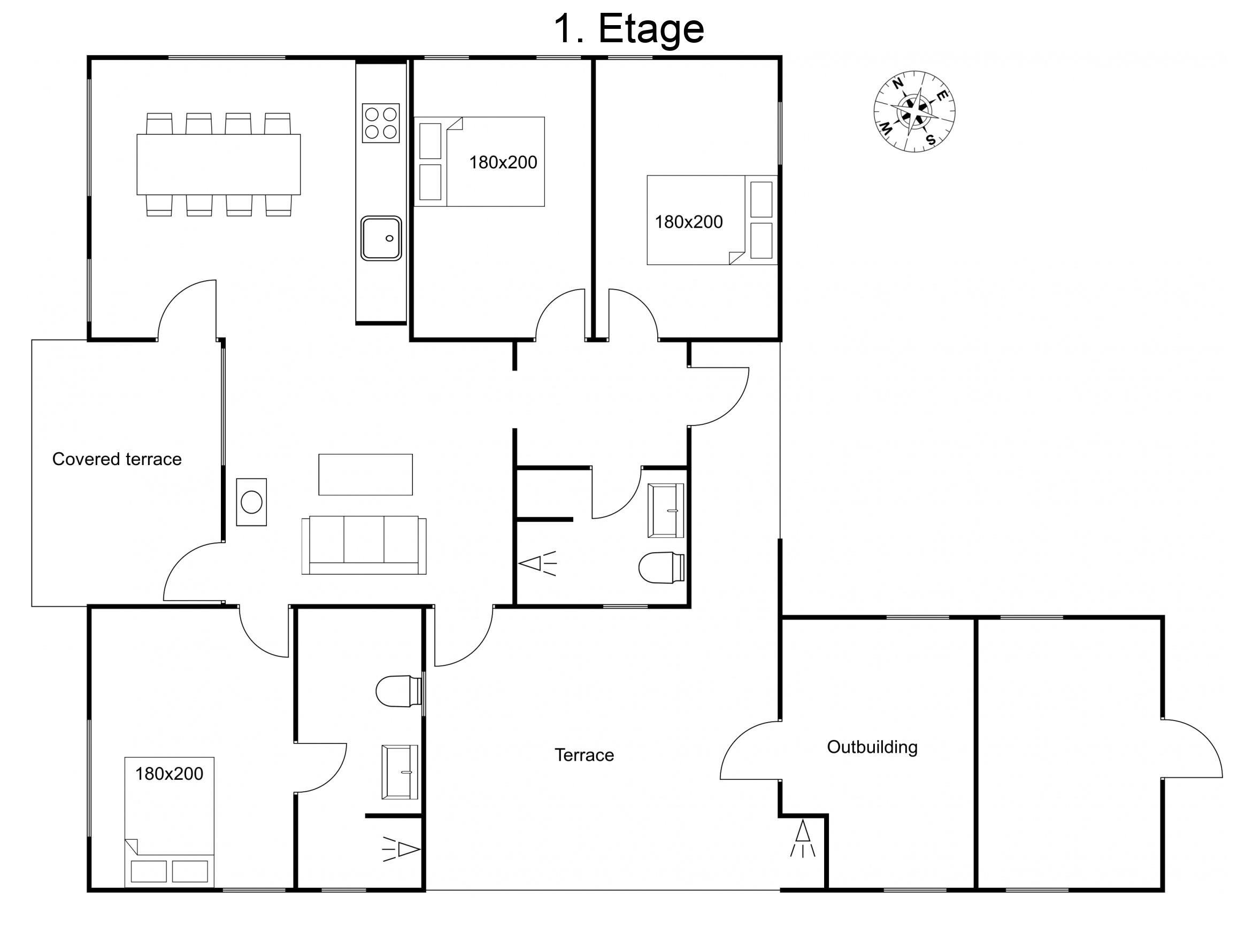 Huset byder på to dejlige terrasser, hvor den ene er omkranset af en lav væg, så I kan solbade eller nyde et dejligt måltid i læ og ganske ugeneret. Den anden terrasse er vest-vendt og overdækket, så her vil det være oplagt at trække ud til aften og nyde en lækker grillaften til synet af den mest betagende solnedgang i horisonten. I finder også en udendørs bruser ved huset, så når I har været en tur på stranden, kan I skylle sand og saltvand af kroppen. Langs grundens nordskel, finder I en lille sti, som fører direkte ned til stranden.