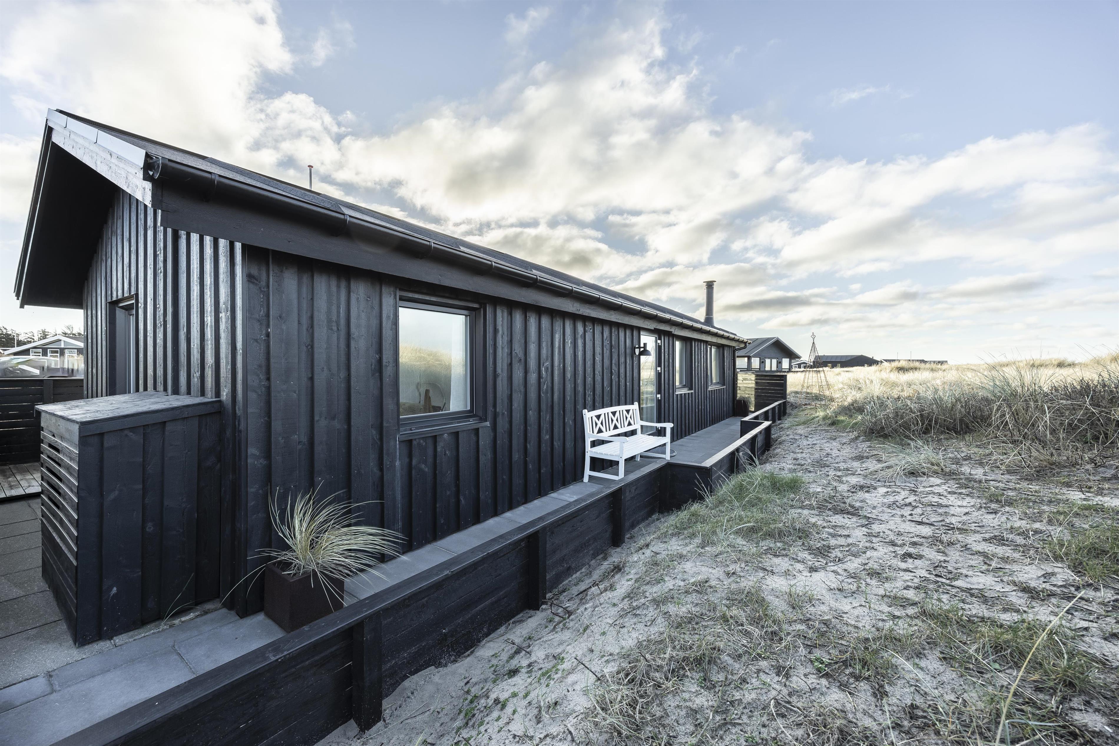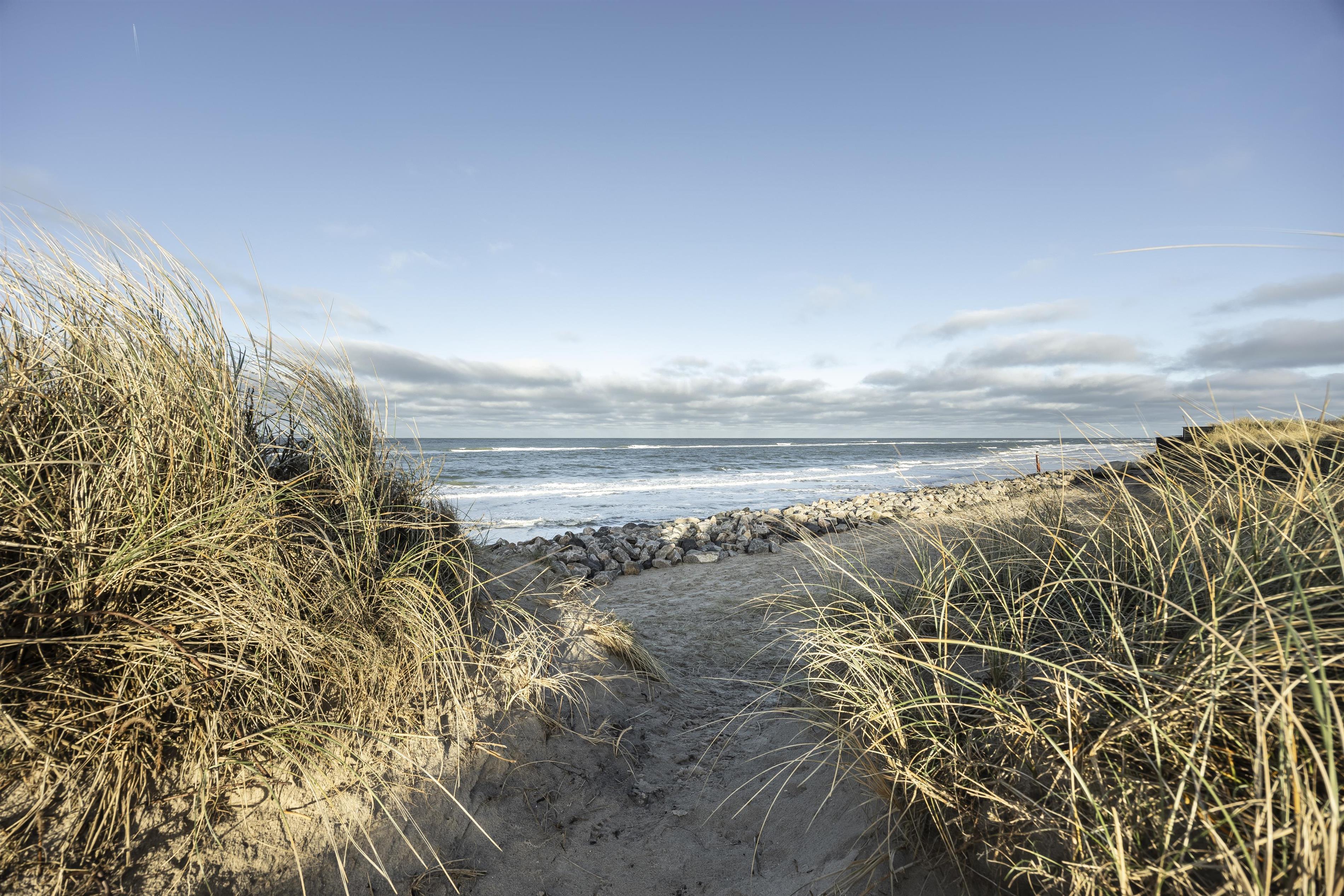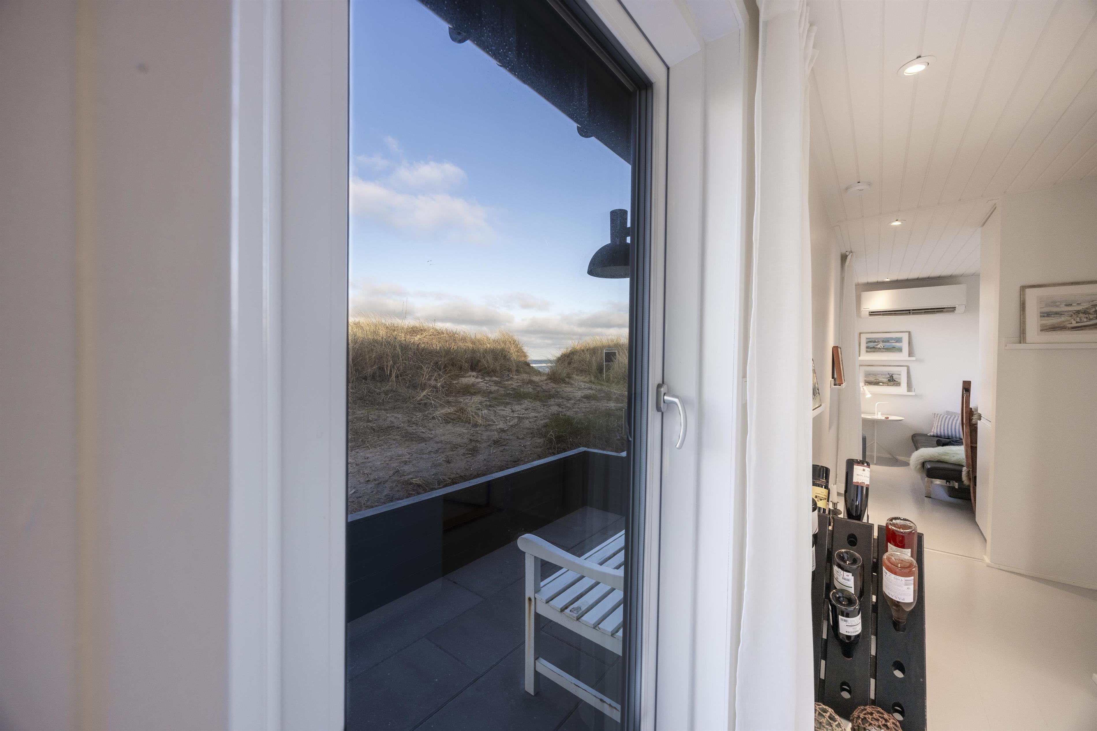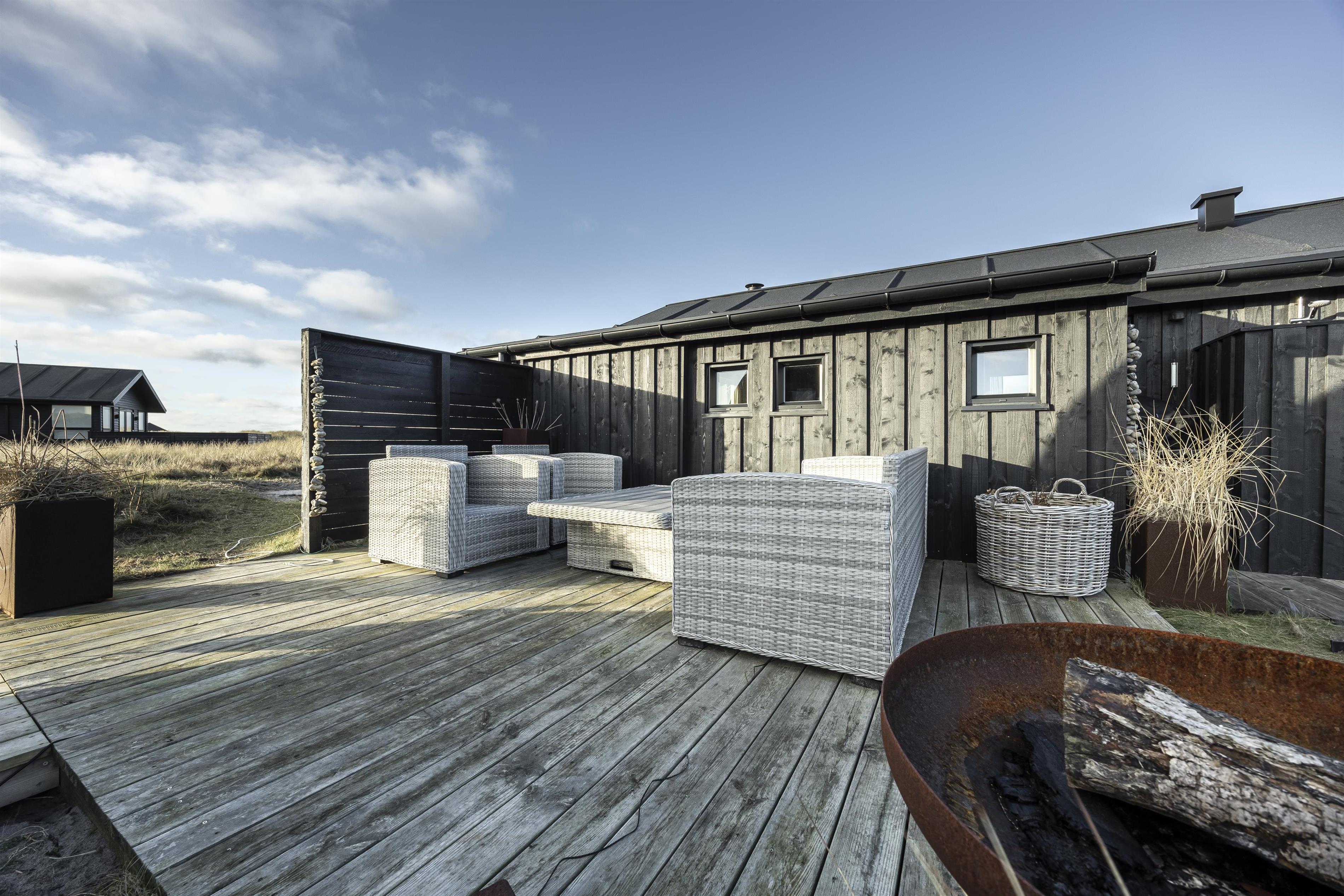 Fra stuen kan I åbne den store skydedør og træde ud på en skøn terrasse, som er omkranset af et lavt stakit. Herfra kan I nyde alle jeres måltider med lyden af havets brusen fra den anden side af klitten og ikke mindst opleve solnedgangen fra trappe-terrassen.