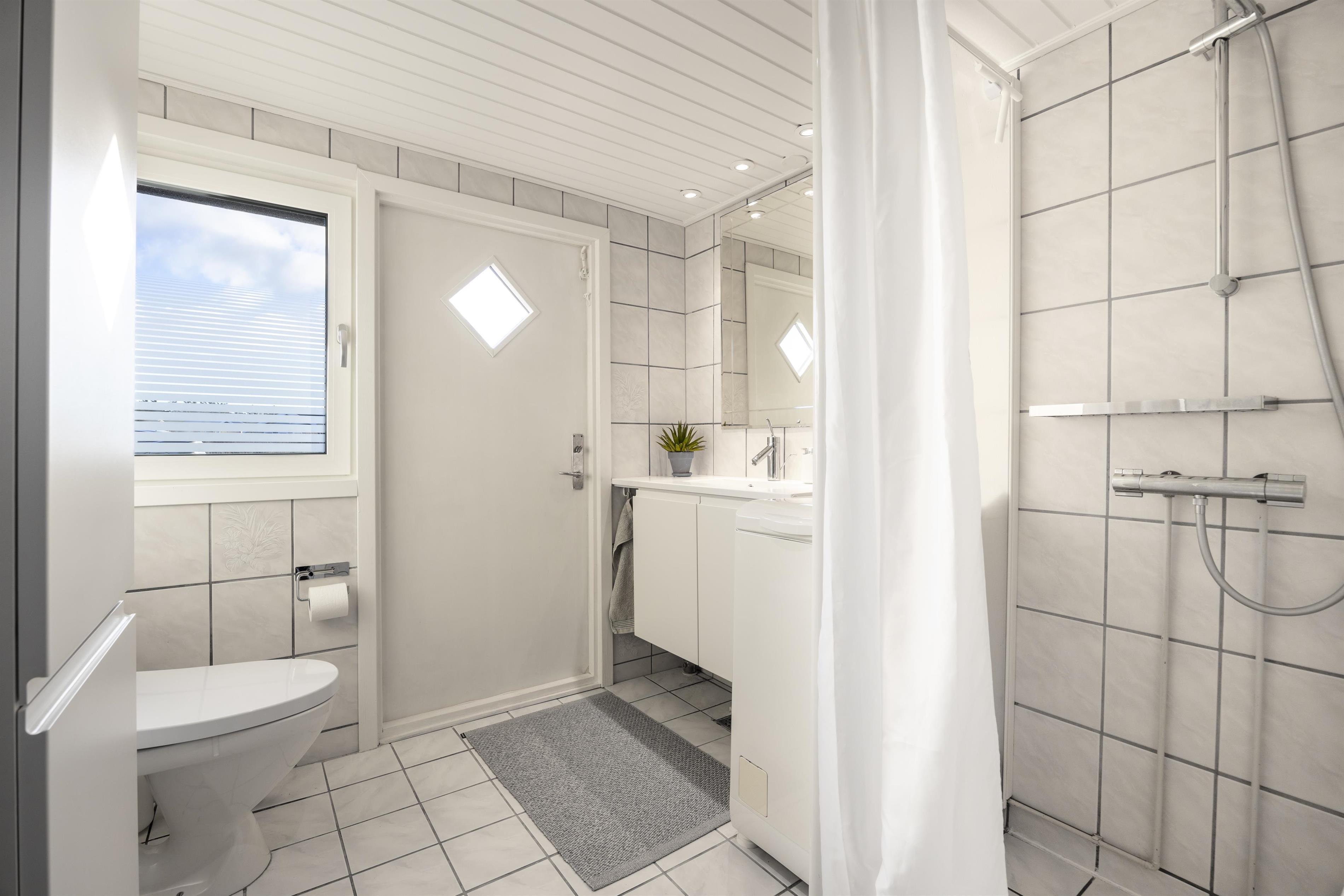 Fra opholdsrummet er der adgang til en lille gang, som fører til et mindre soverum med en enkeltseng, et soveværelse med dobbeltseng og et skønt og lyst badeværelse med bruseniche og en håndklædetørrer. Fra soveværelset og badeværelset har I udgang til den østvendte terrasse og udebruseren.