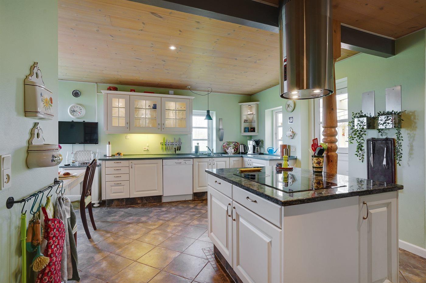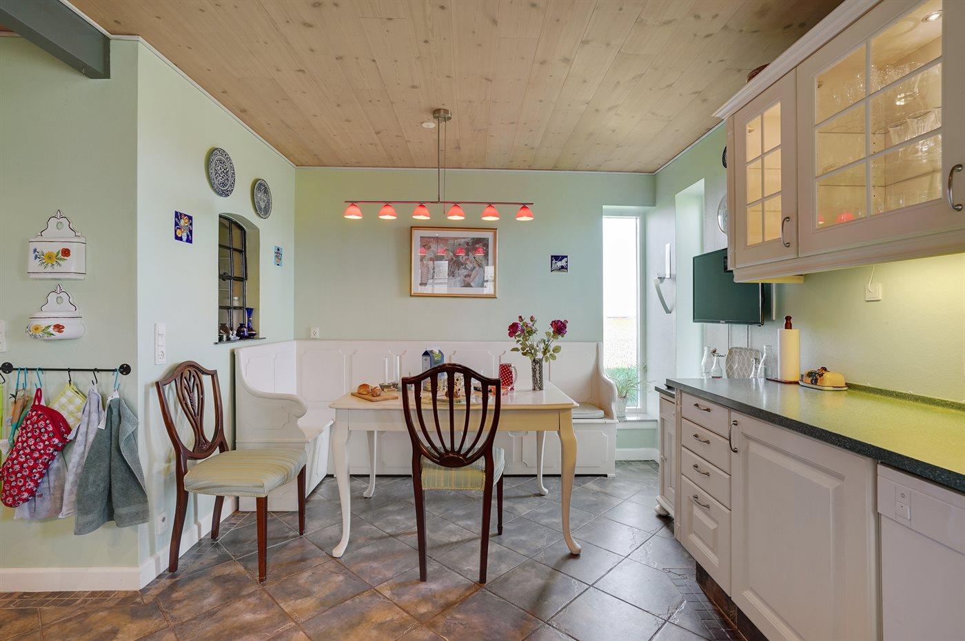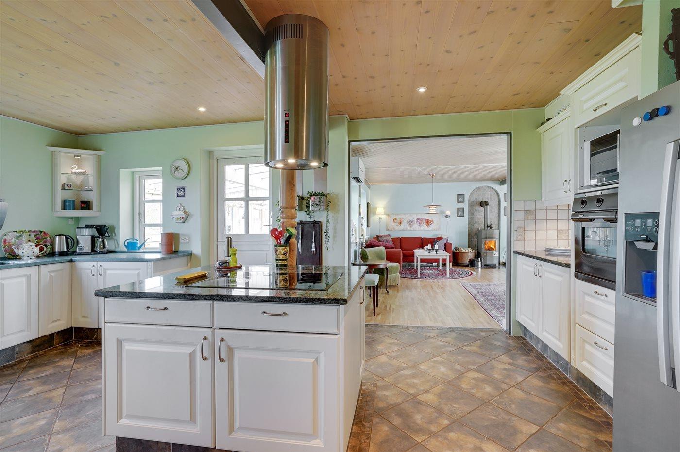 Køkkenet er udstyret med 1 amerikansk køleskab. Der er 4 keramiske kogeplader, miniovn, varmluftovn, mikrobølgeovn samt opvaskemaskine Der er gulvvarme i køkkenet.