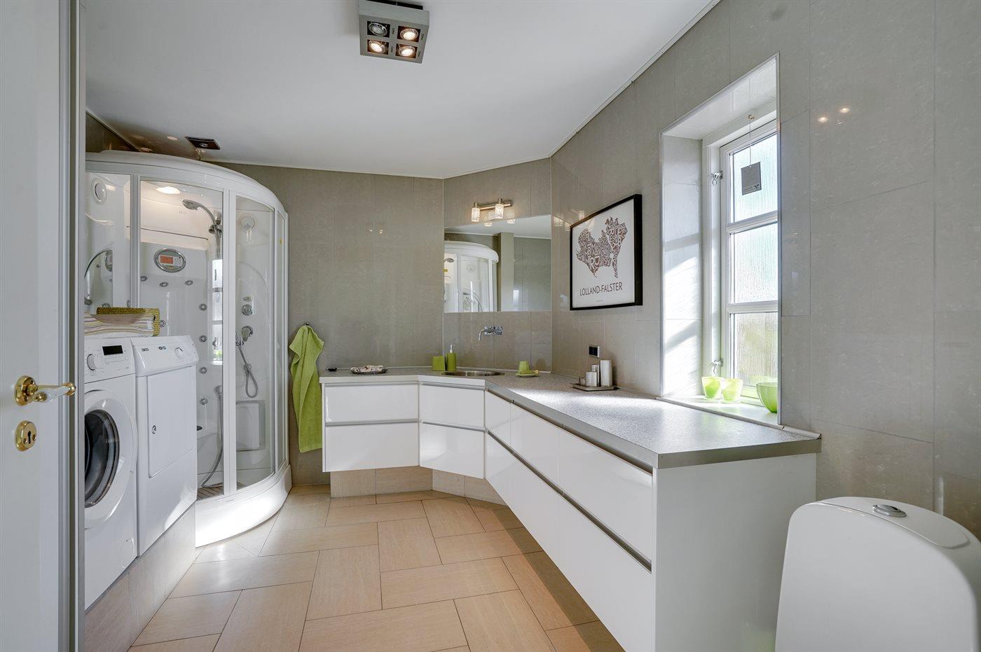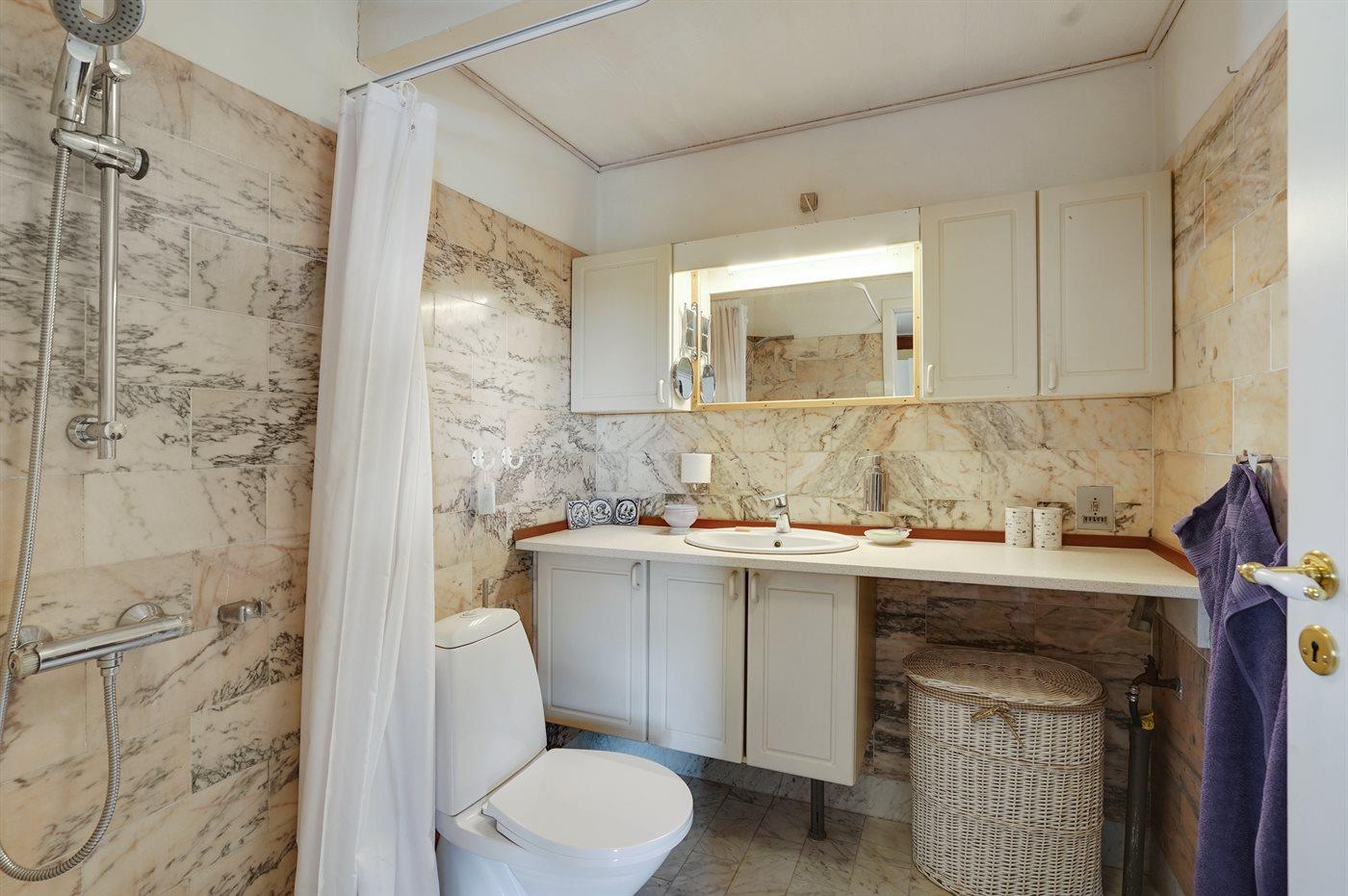 Der er 3 badeværelser med bruseniche og 3 toiletter. Der er gulvvarme på 1 badeværelse.