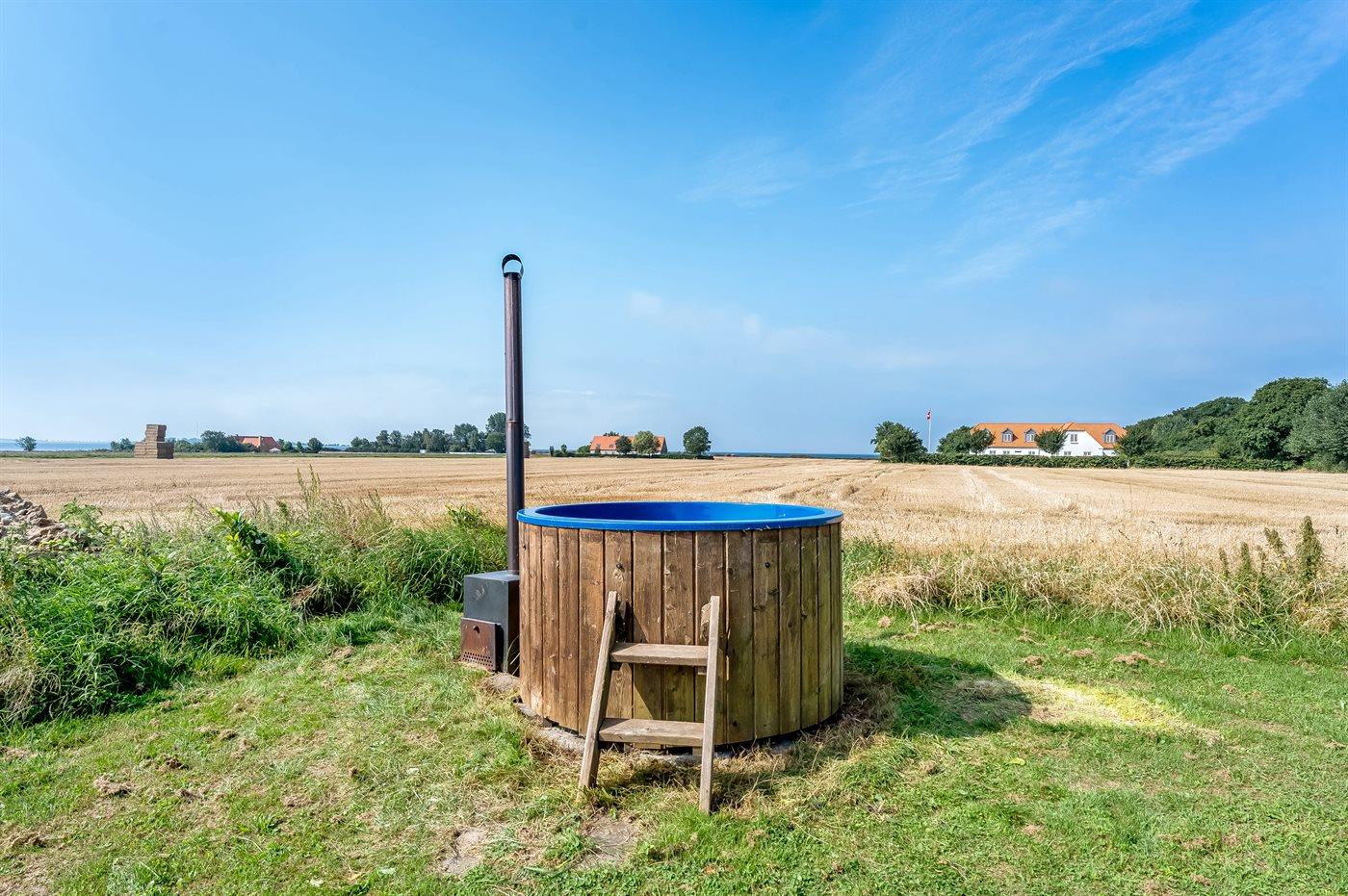 I det ene hjørne af grunden kan hoppe i vildmarksbadet med udsigt til havet, og nyde det varme vand. Måske med et glas vin på kanten og under stjernehimlen.