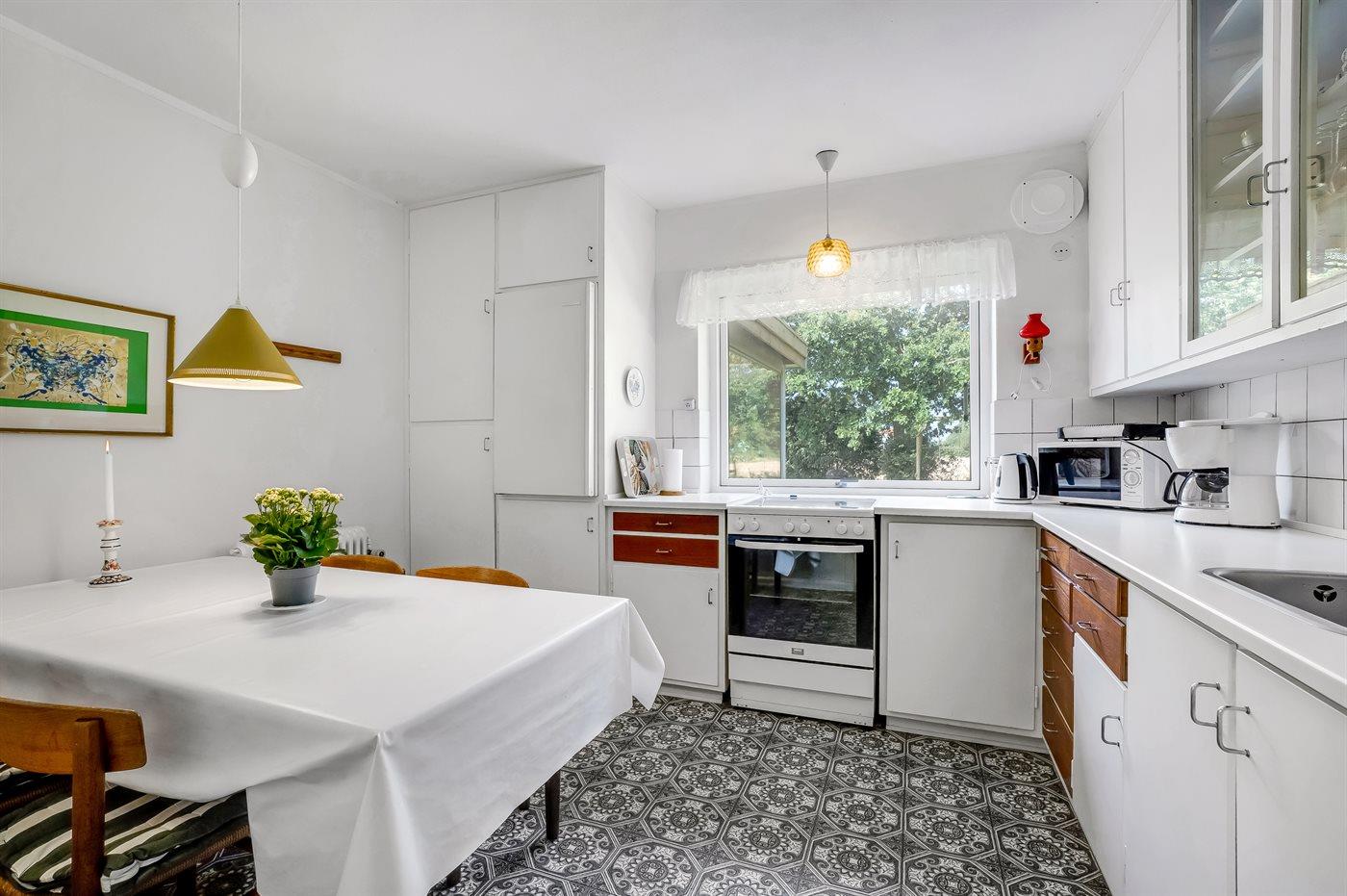 Køkkenet er udstyret med 1 køleskab. Der er 4 keramiske kogeplader, varmluftovn, mikrobølgeovn samt opvaskemaskine.