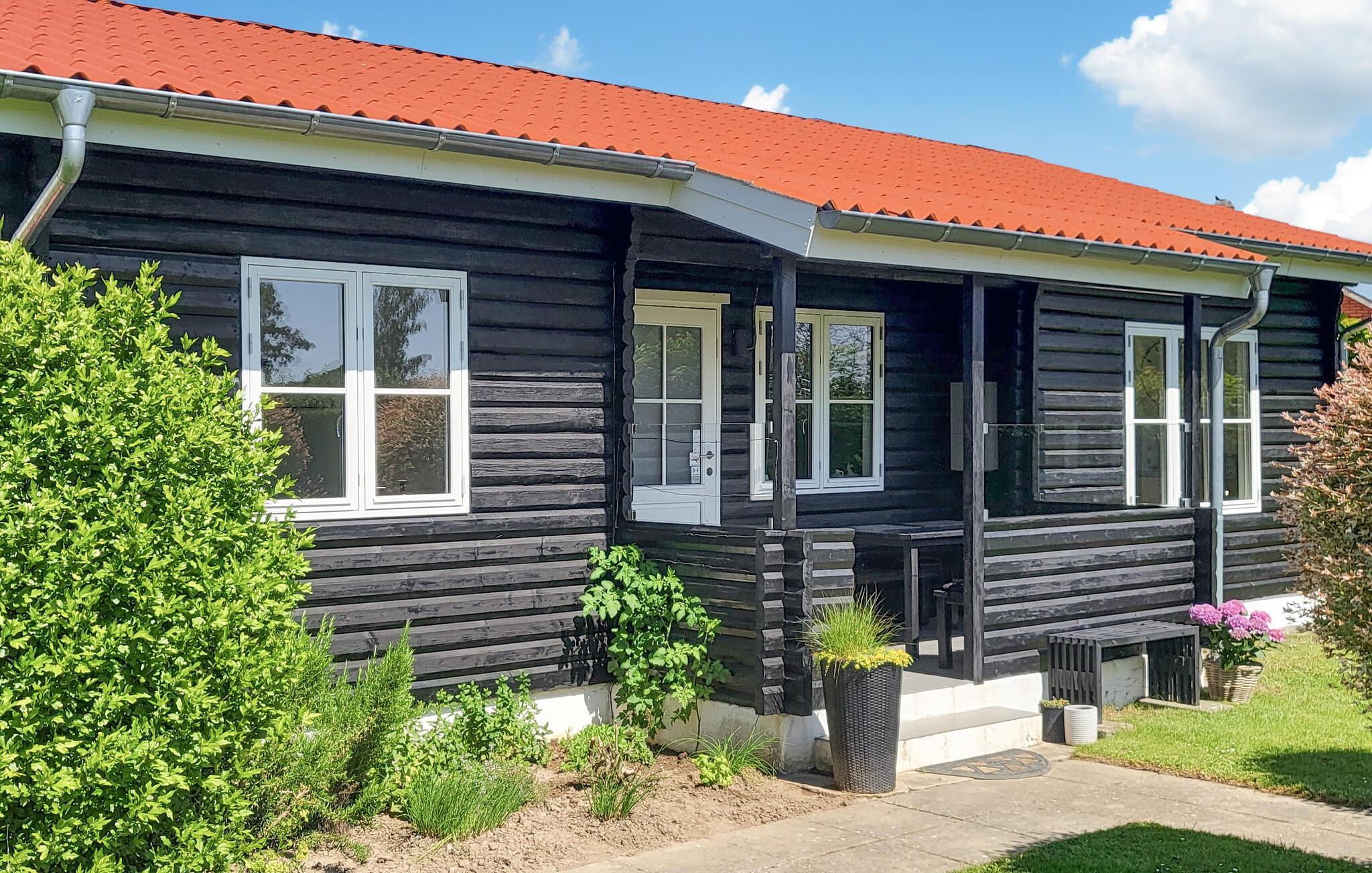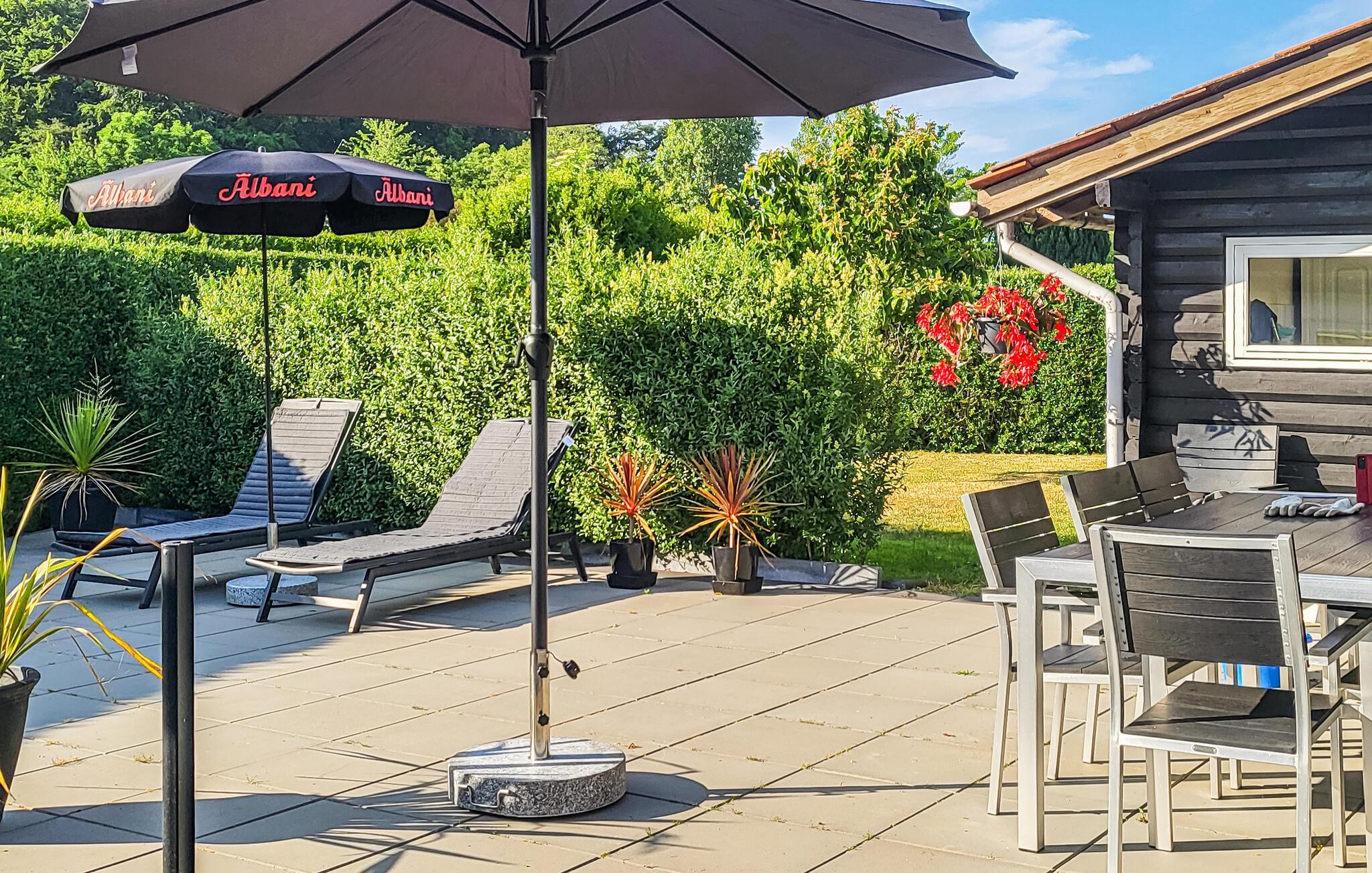 Indbydende træhus ved Naldmose Strand med stor terrasse, krolf-bane og tæt på børnevenlig strand.