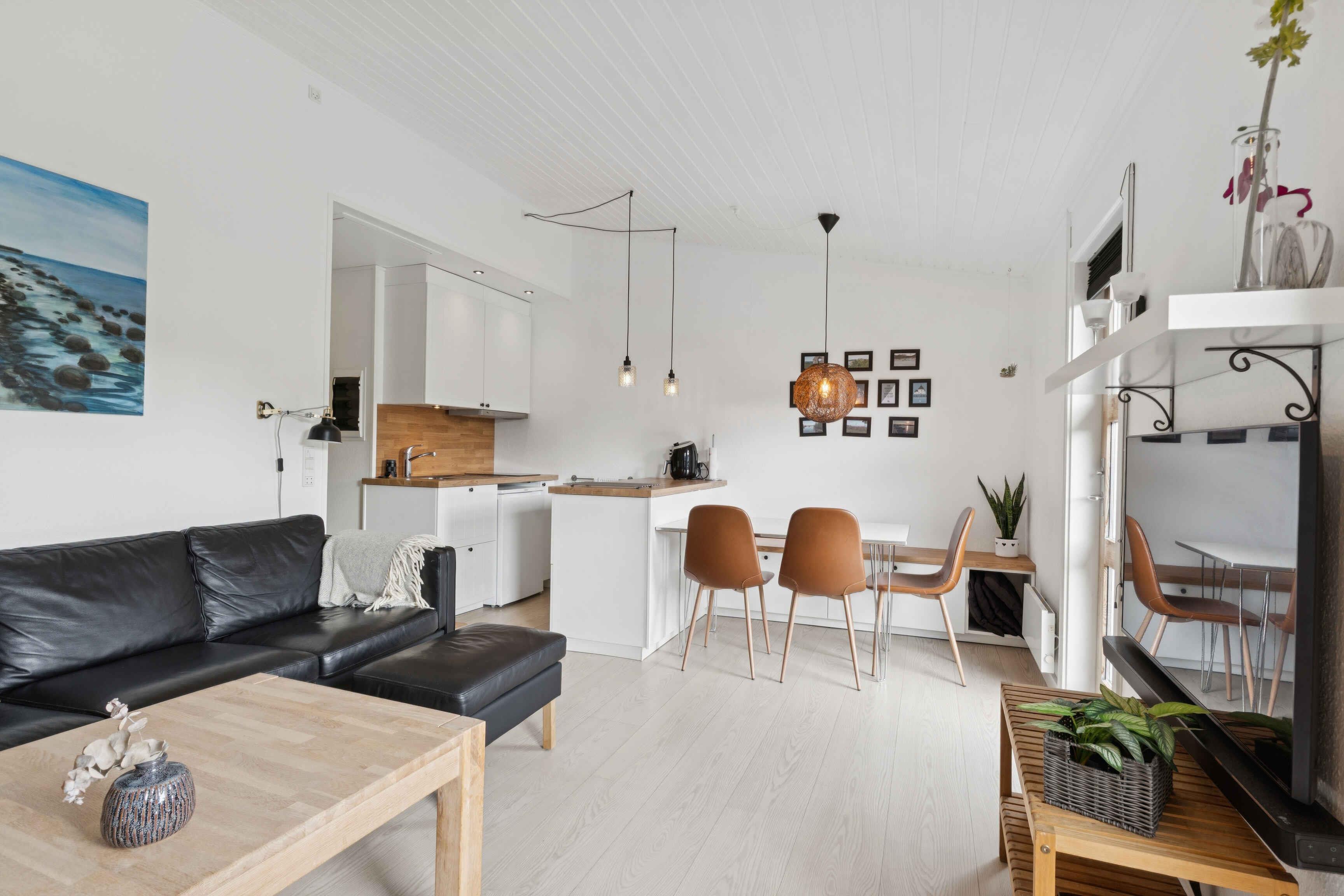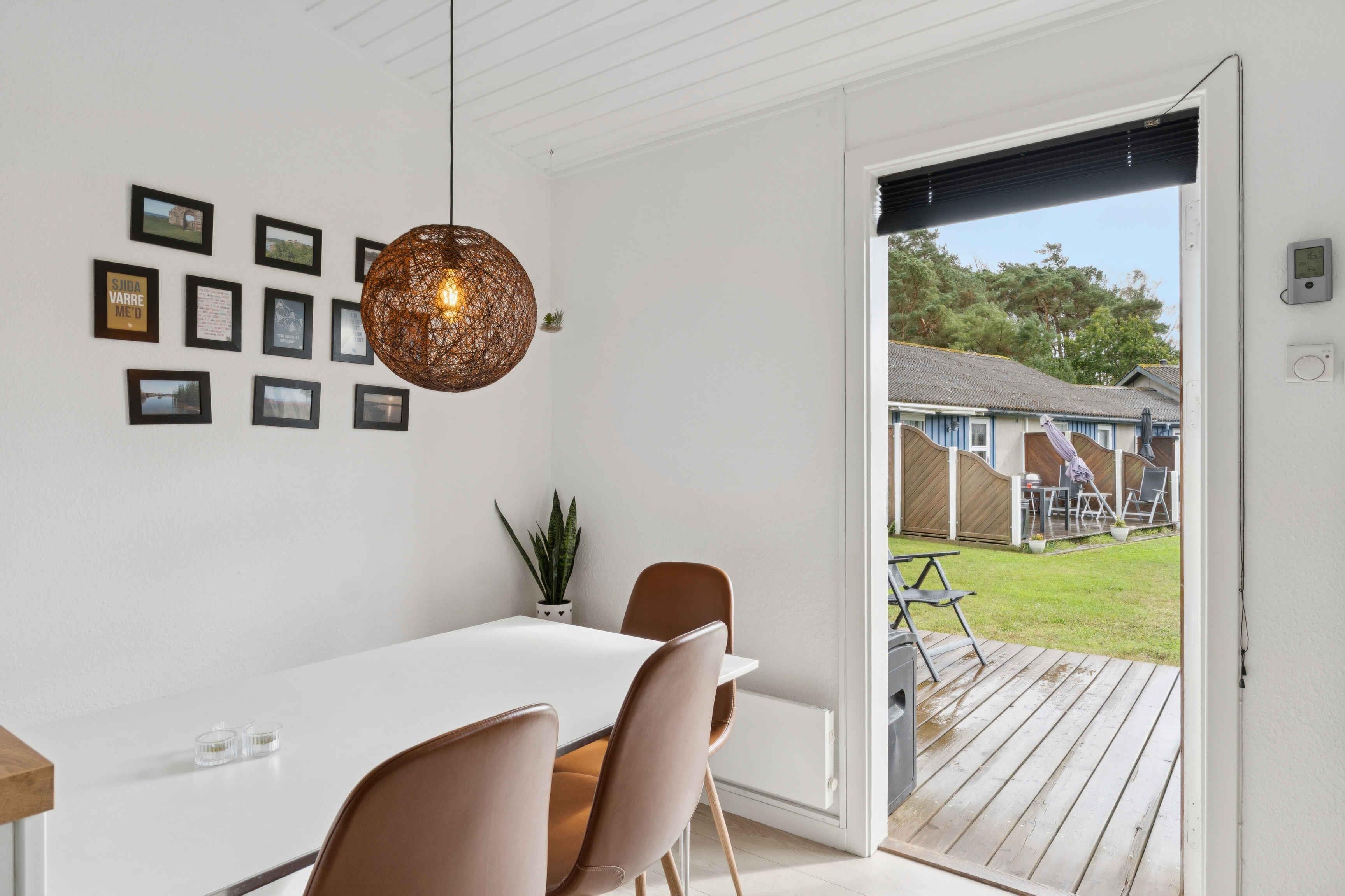 Lejligheden ligger fredeligt placeret i naturskønne omgivelser nær Dueodde Strand – en af Bornholms mest populære badestrande. Her er kun 200 meter til vandet, hvilket gør det nemt at tage en dukkert eller gå en tur langs kysten. Boligen er 42 m² og har plads til fire personer. Den rummer et soveværelse med dobbeltseng samt en dobbeltopredning i alkoven i stuen. Indretningen er lys og moderne, og stuen har direkte udgang til en møbleret terrasse med grill. Som gæst har du adgang til ferieparkens fælles faciliteter: indendørs og udendørs swimmingpool, sauna, motionsrum, tennisbane, petanquebane og legeplads. Den indendørs pool er åben fra april til oktober, mens den udendørs kan benyttes i sommerperioden. Området omkring ferieboligen byder på mange ferieoplevelser. Dueodde Strand er kendt for sit hvide, bløde sand og lavt vand – ideelt for både børn og voksne. Klitterne inviterer til gåture, og i nærområdet findes cykelruter og stier i skov og klit. Nærliggende byer som Nexø og Snogebæk har gode spisesteder, røgerier, lokale butikker og sommerliv. Der er også mulighed for at besøge kunsthåndværkere og markeder i området. Alt sammen i kort afstand fra lejligheden. Lejligheden egner sig til par og familier, der søger ro, strandliv og adgang til gode faciliteter. Udlejning sker ikke til ungdomsgrupper.