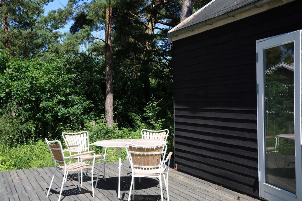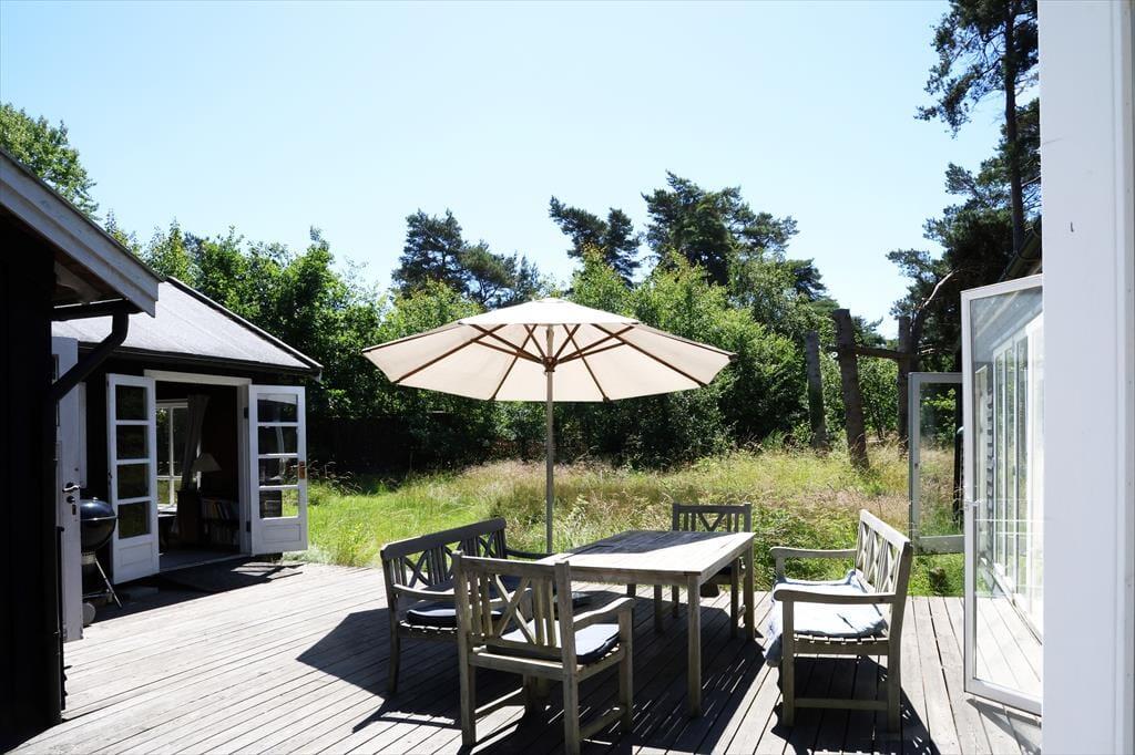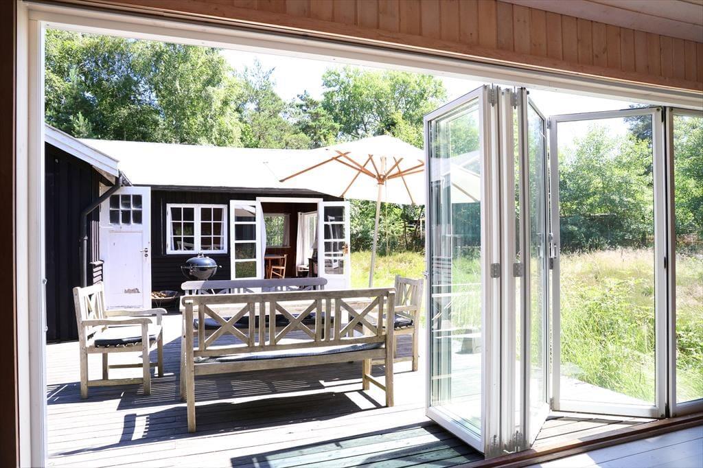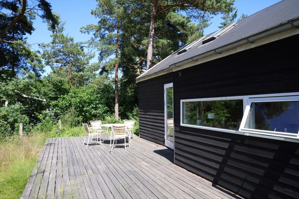 Udendørs kan den helt fantastiske naturgrund nydes. Det er her skuldrene falder ned og roen sænker sig i kroppen til fuglekvidder og insekternes summen. Der er masser af lyng, træer og buske på grunden som kan nydes fra terrasserne. Den store træterrasse er mødestedet imellem de 2 huse, og her er der masser af plads til at spise om bordet, og ligge at slikke sol med en god bog. For enden af vejen går en lille sti ned til den skønneste sandbadestrand, her er stranden børnevenlig både som badevand, men også til leg da der er god plads til at bygge sandslotte.