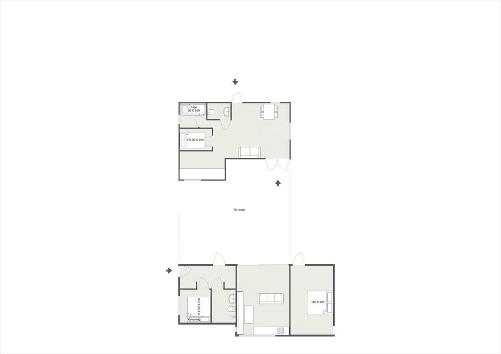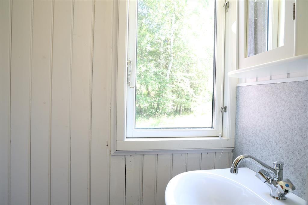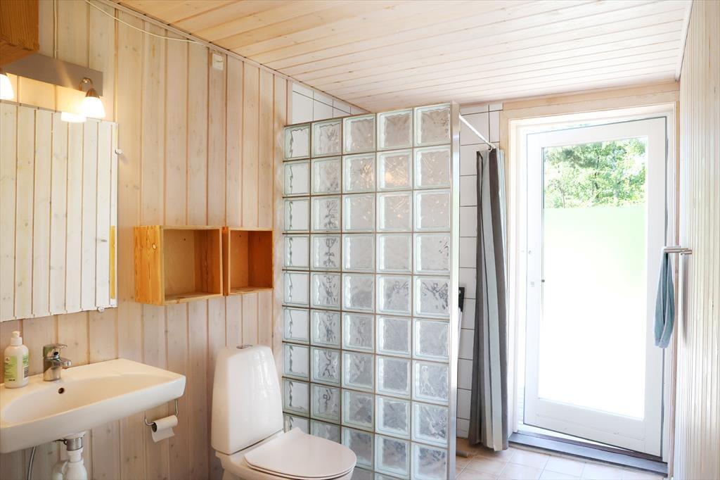 Sommerhuset er indrettet kørestolsvenligt med brede døre og stor bruseniche, samt en fast kørestolsrampe op til terrassen.