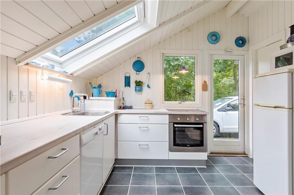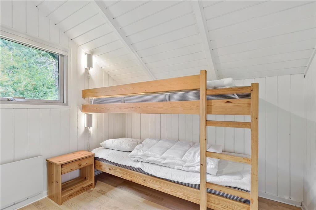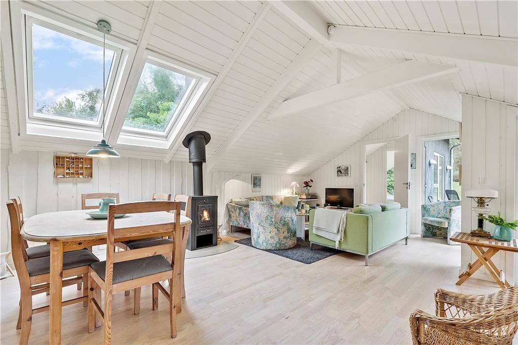 Det flotte træhus fremstår overalt med lyse farver og gode lysindfald fra de store vinduer. Når aftenen falder på, kan du fra spisebordet se stjernerne på nattehimmelen gennem ovenlysvinduerne.