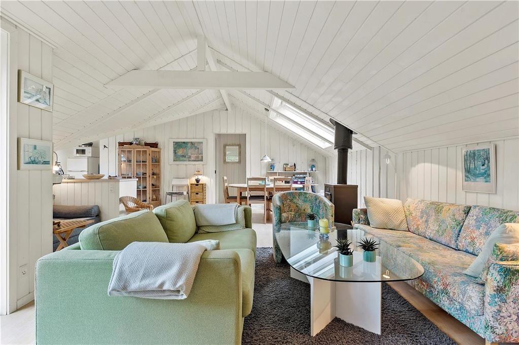 Du vil hurtigt finde dig godt til rette i den aflange stue med det hyggelige sofaområde og fint kik til haven. Find et spil frem og sæt jer ved spisebordet eller sofabordet og få nogle hyggelige timer. Er det koldt udenfor, har I heldigvis brændeovn til hurtigt at give varmen.