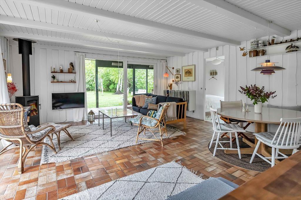Sommerhuset fremstår lyst og indbydende. Sommerhusets hjerterum er opholdsstuen og spisestuen i et, hvor mange gode stunder kan nydes med en god middag, eller med en spændende bog i sofaen imens du lytter til knitren fra brændeovnen. I det store, skønne åbne køkken er det perfekt at tage en hyggestund med dine børn eller børnebørn, for at bage boller, som I sammen kan nyde på den virkelig hyggelige overdækkede del af terrassen. I huset er der 3 gode soveværelser og et dejligt badeværelse.