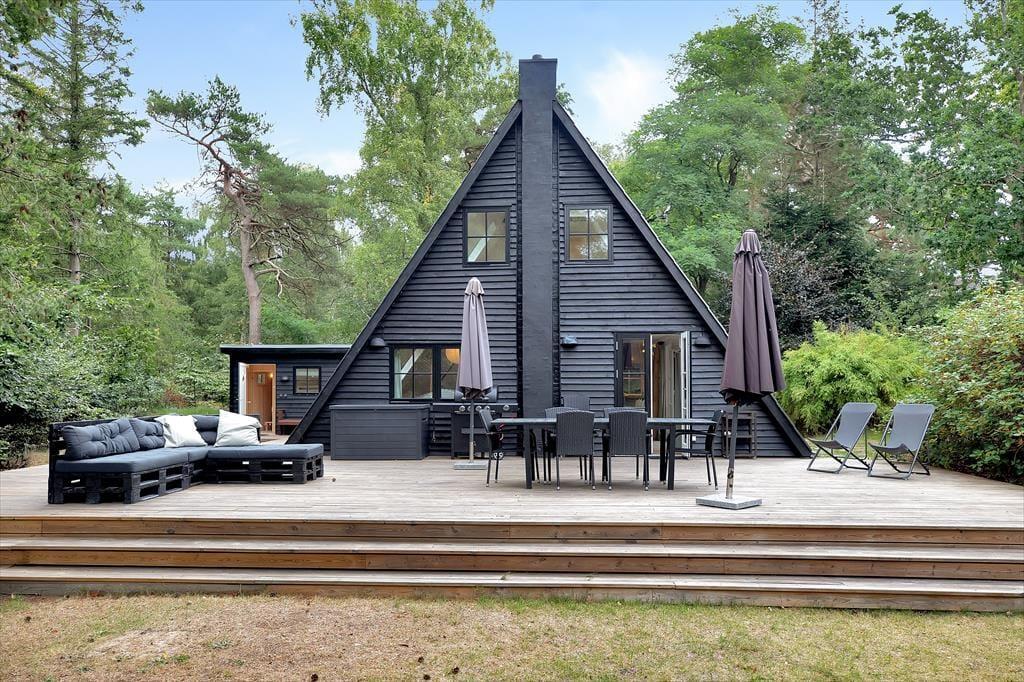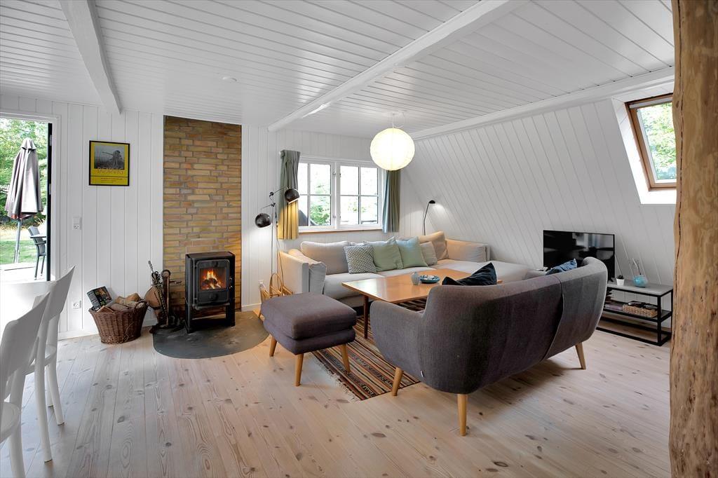 Huset, der er i 2 etager, indeholder i stueplan kombineret spise- og opholdsstue med brændeovn og varmepumpe samt lækkert køkken med opvaskemaskine. Der er udgang til stor flot træterrasse med udsigt til den hyggelige have hvor rådyrene krydser jævnligt.Derudover er der i stueplan badeværelse med brus. På 1. sal er 3 soveværelser, alle med dobbeltsenge samt 1 sovesofa til 2 i det ene. NB! Trappen til 1. sal er lidt stejl.