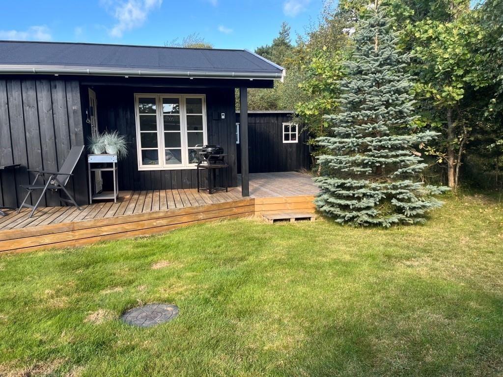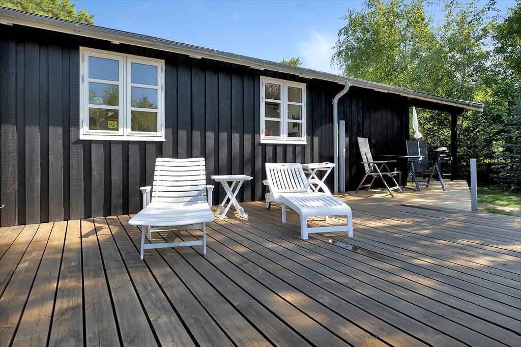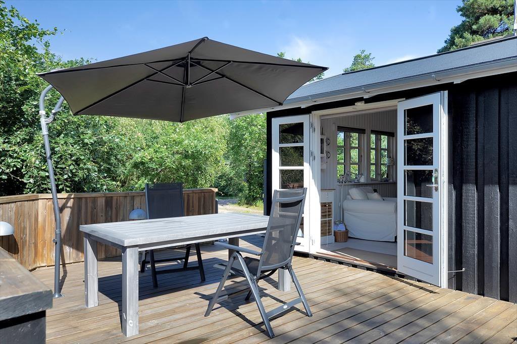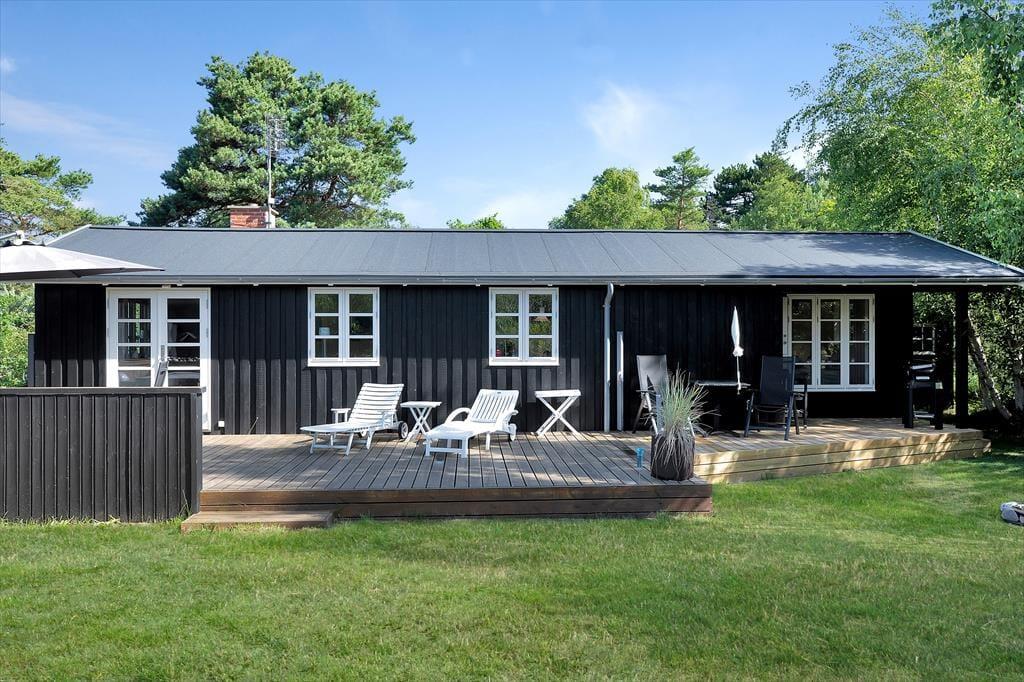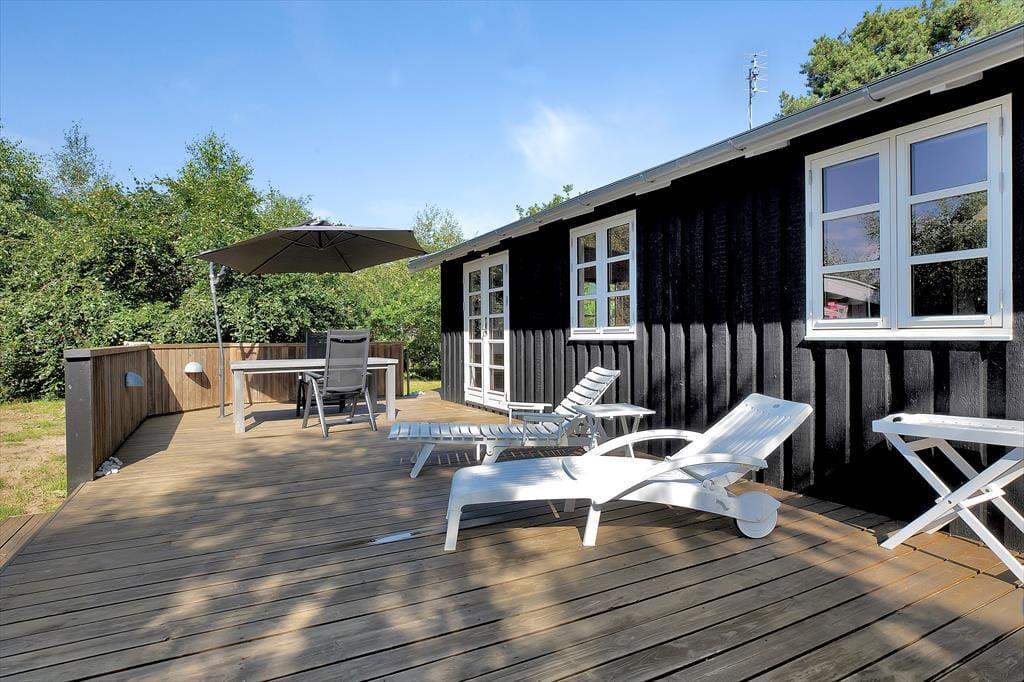 Sommerhus tæt på strand med udebruser og stor terrasse.