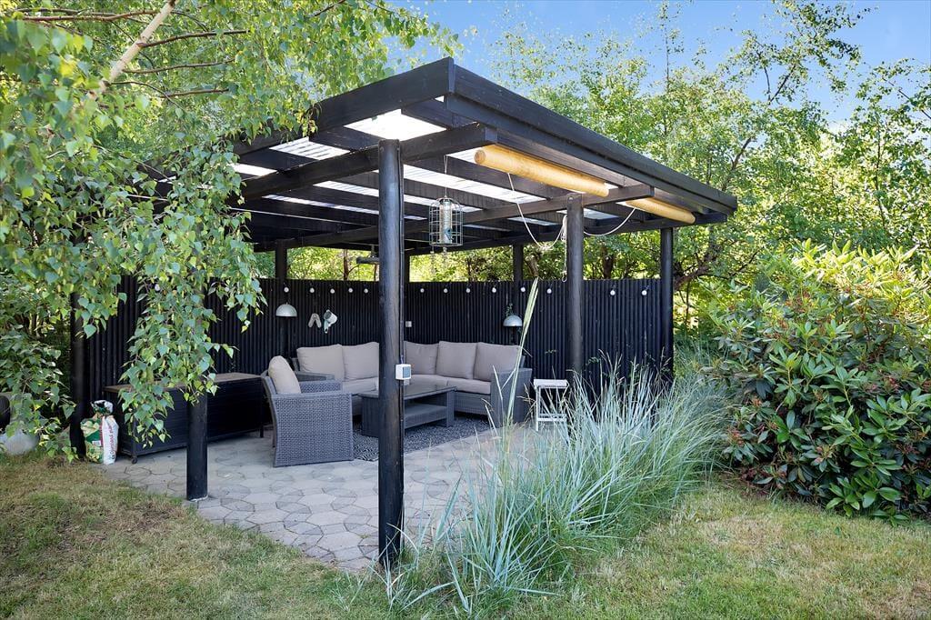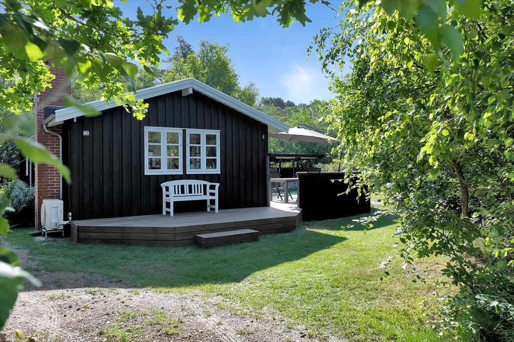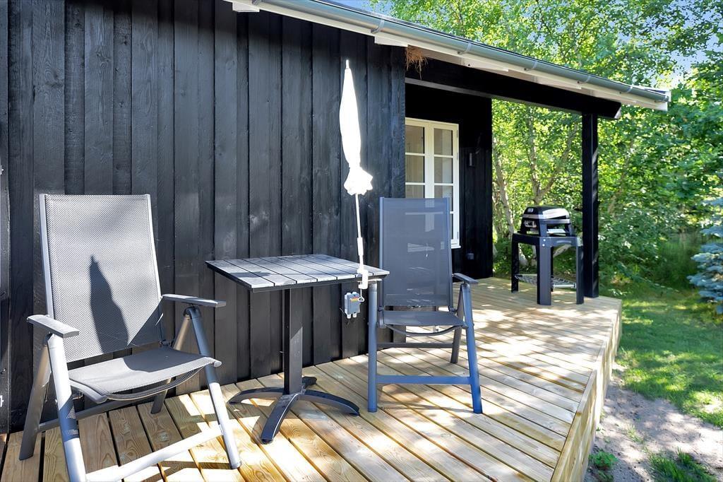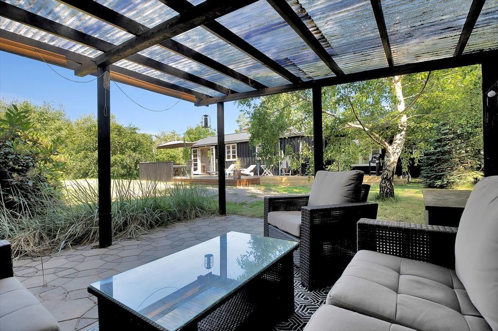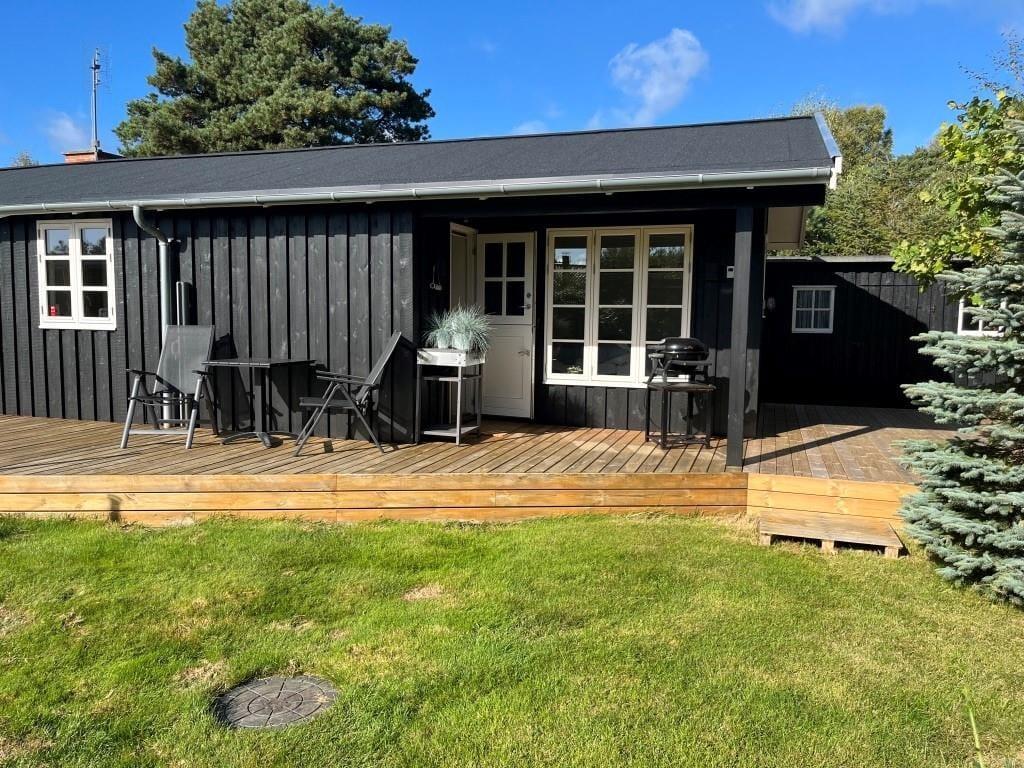 Sommerhus tæt på strand med udebruser og stor terrasse.