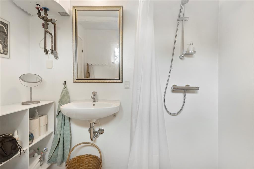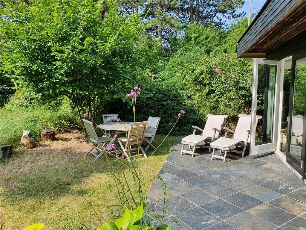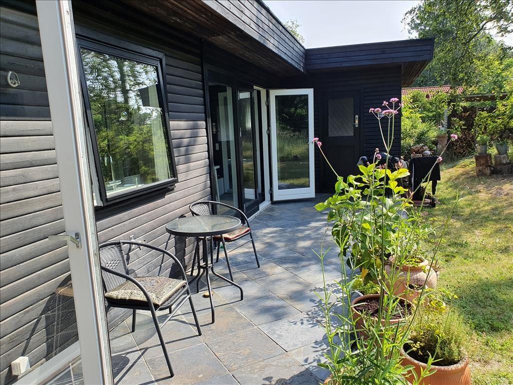 Huset indeholder desuden hyggeligt køkken og spiseplads, igen med store panoramavinduer og udsigt til haven, hvor rådyrene jævnligt krydser. Der er desuden flot badeværelse med toilet og brus. Her er ikke forstyrrende tv.