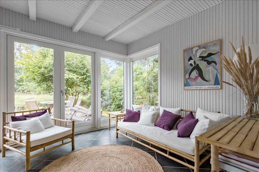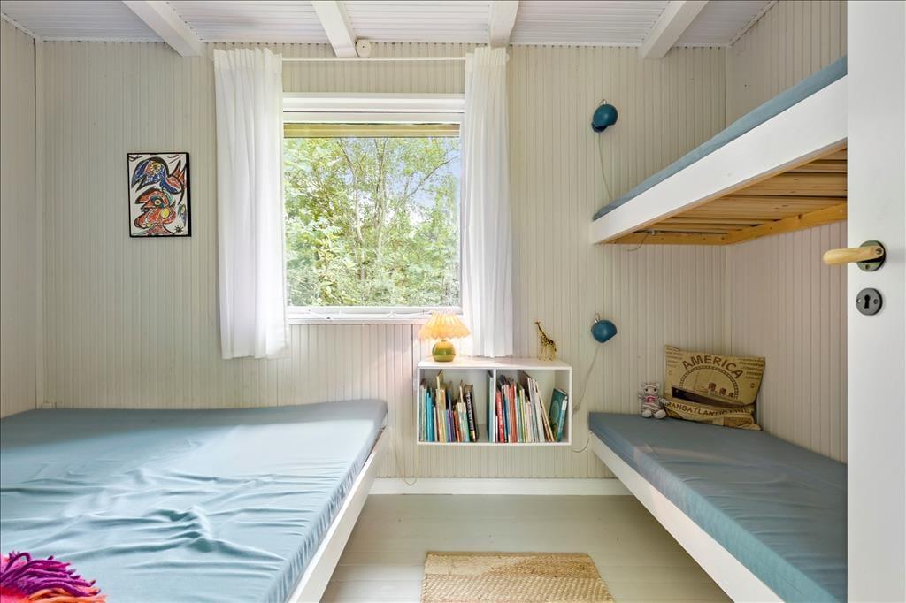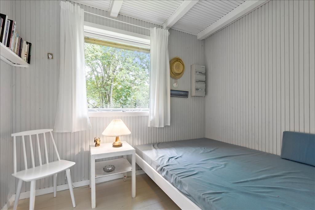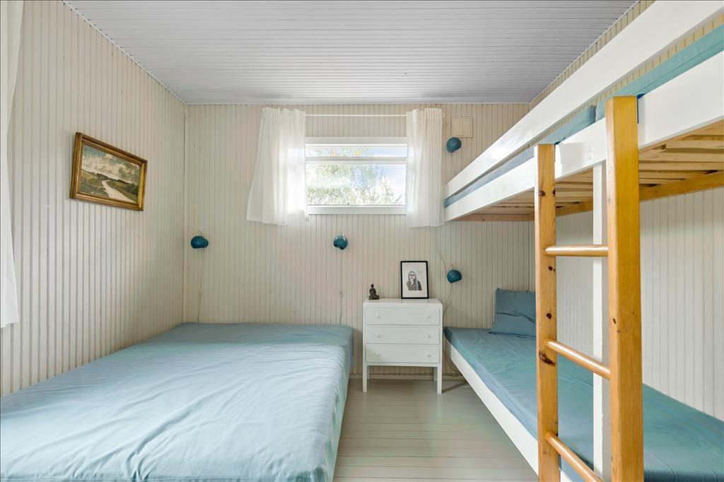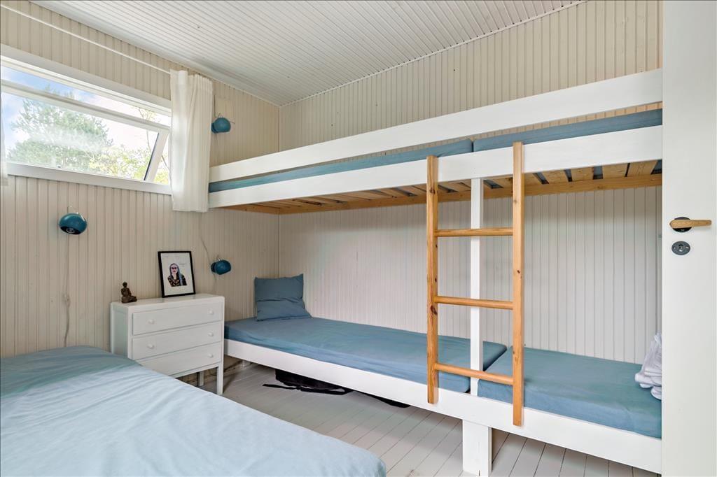 Huset er lyst rummeligt og indeholder stue med store panoramavinduer og udgang til den hyggelige terrasse. Der er 3 gode soveværelser med i alt 3 dobbeltsenge (180x200, 140x200, 140x200) samt 2 køjesenge. Bemærk, at der ingen skabsplads er, men derimod knager samt bokse under senge.
