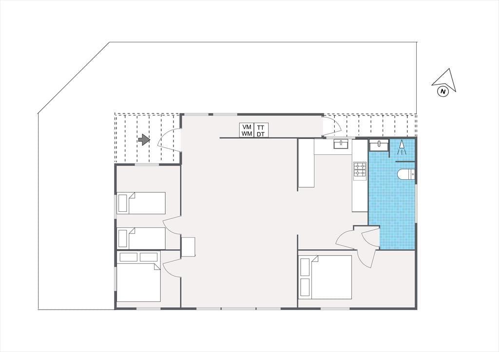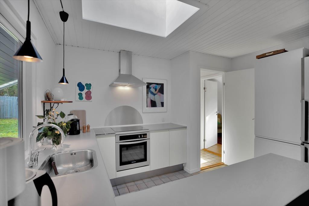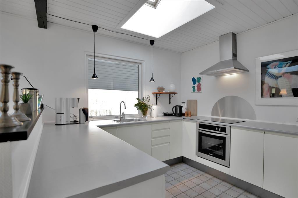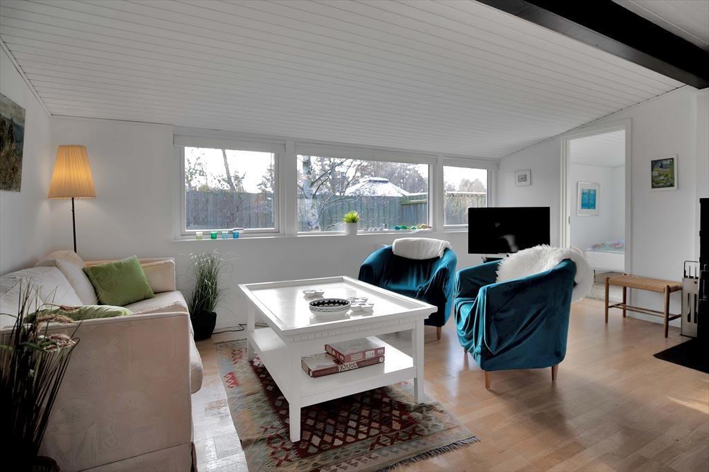 Huset indeholder stor stue med spiseplads til 6. Der er brændeovn og TV samt en masse spil til hyggelige aftener. Derudover er der 3 gode værelser med dobbeltsenge og god skabsplads. Køkkenet er åbent og indeholder bl.a. opvaskemaskine. Det fine badeværelse er med brus. Vaskemaskine og tørretumbler er placeret i entreen. Fra stuen er der udgang til den dejlige have, hvor rådyrene jævnligt krydser og hvor der er flere dejlige terrasser både overdækkede og åbne.