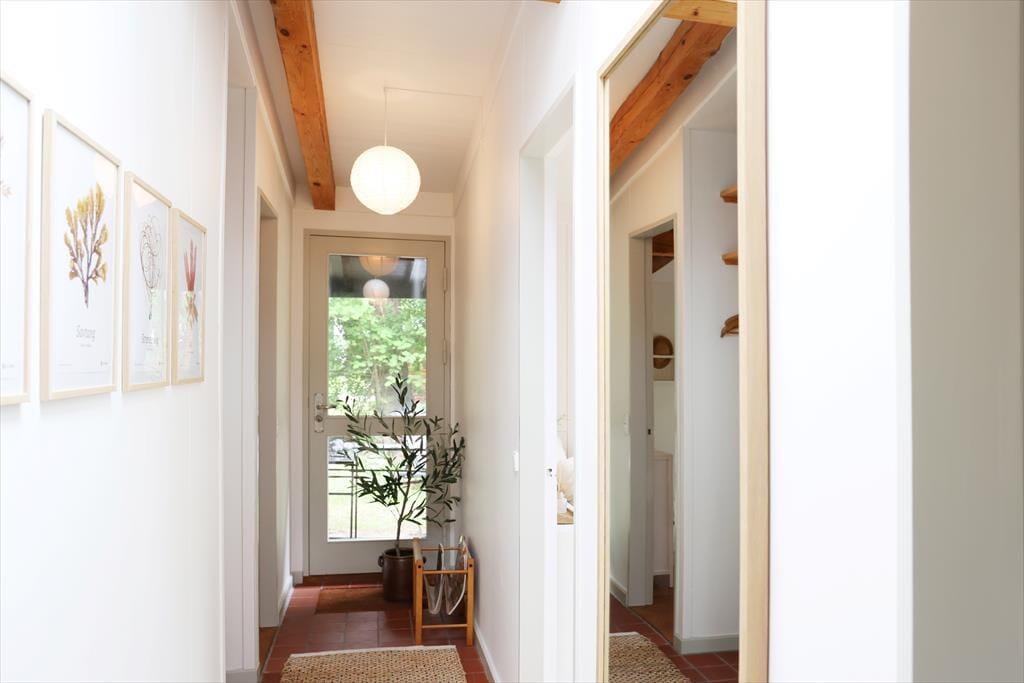 Sommerhuset er beliggende i et roligt område, så der er rig mulighed for at sidde i ro og mag og nyde en god frokost på terrassen. Den store terrasse med udgang fra stuen er sydvest-vendt så kommer masser af sol eftermiddag og aften. Udendørs kan timerne gå for børnene med at klatre i træer, lege gemmer eller fanger, og når det bliver tid til en dukkert, så er den rigtig gode sandstrand kun få minutters gang fra huset.