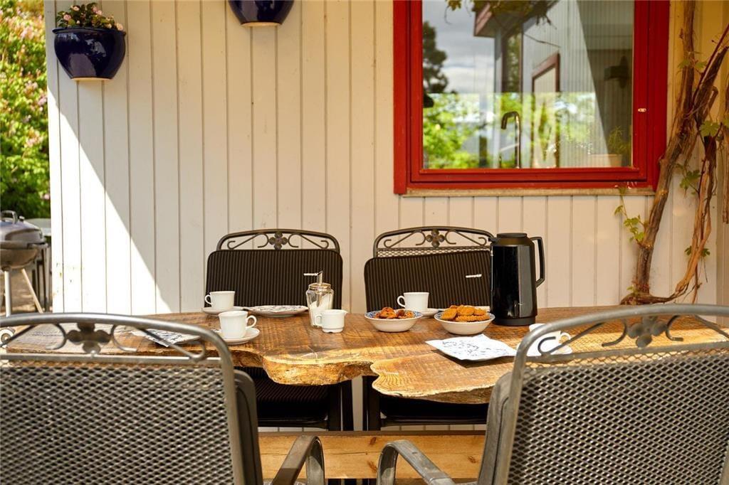 Sommerhuset ligger tilbagetrukket på den store grund, med terrasse mod øst, syd og vest. Fra stuen er direkte udgang til terrasse ud mod den store have. Derudover har sommerhuset også en rigtig hyggelig overdækket terrasse, hvor man sidder ugeneret. Her vil mange timer med hygge kunne tilbringes - også når duggen er faldet.