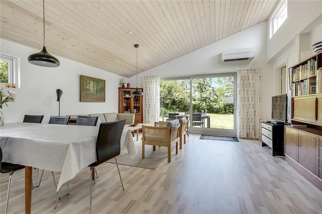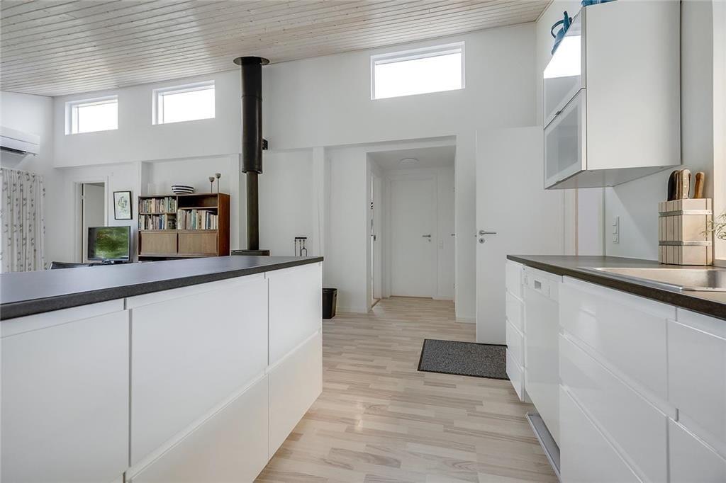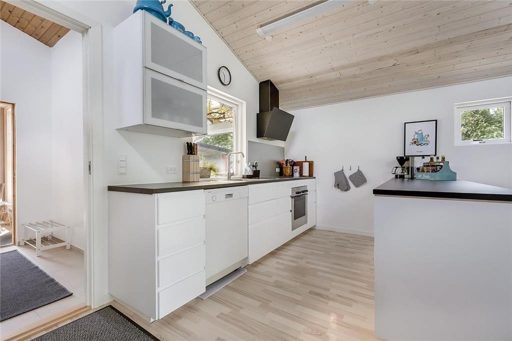 Lad dig ikke narre af et lidt kedeligt 80-er udseende udenpå! Bortset fra forstuen, som er bygget i 2004, er hele huset nyrenoveret. Derfor træder man ind i lys og smuk stue med loft til kip og godt lysindfald, hvor man er i direkte forbindelse med køkkenet. Køkkenet er veludstyret med opvaskemaskine. Badeværelset er ligeledes lyst og rart og har både vaskemaskine og tørretumbler. Derudover er der gæstetoilet. Et godt og rummeligt sommerhus, hvor moderne bekvemmelighed er kombineret med retro-hygge.