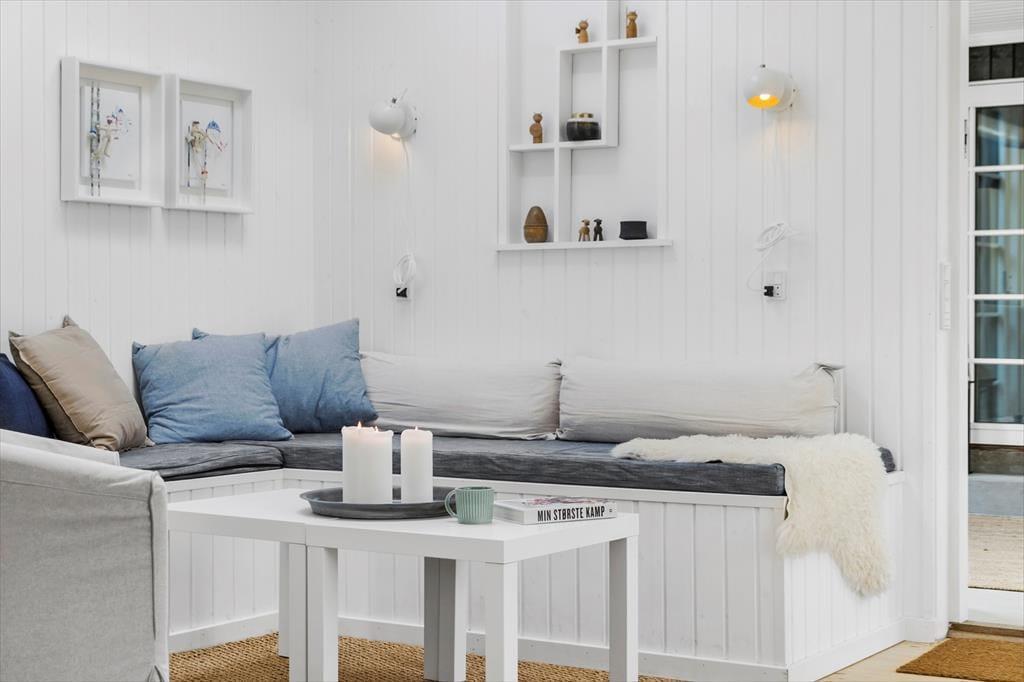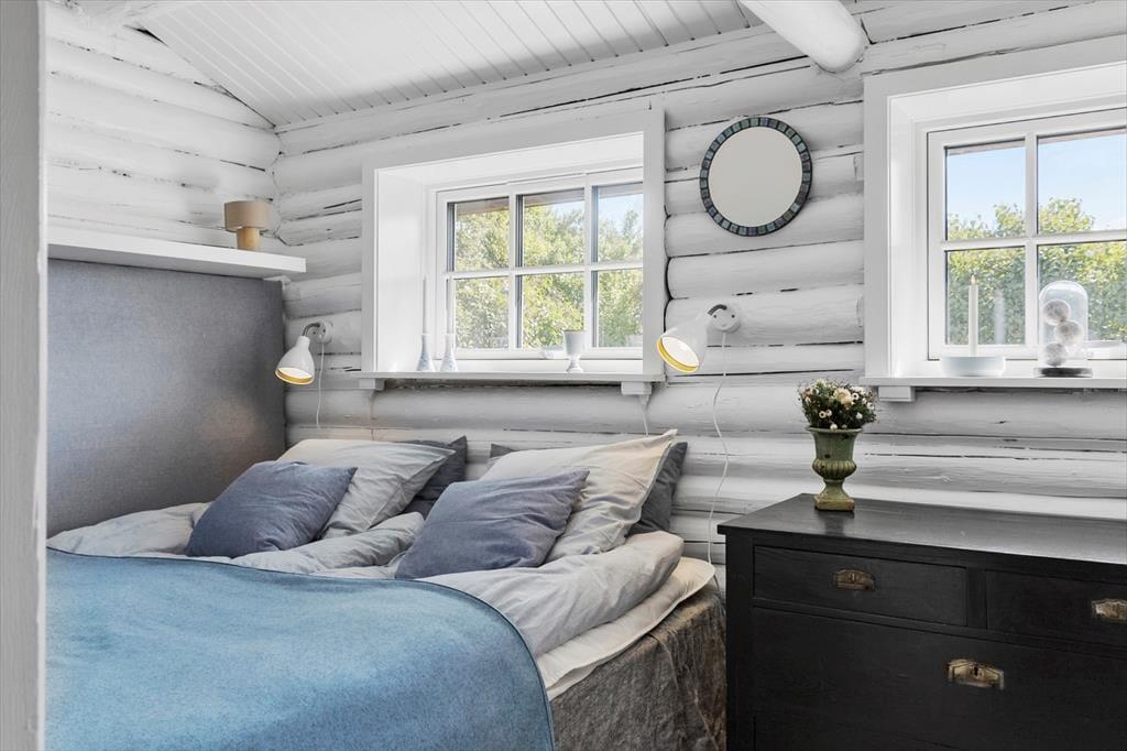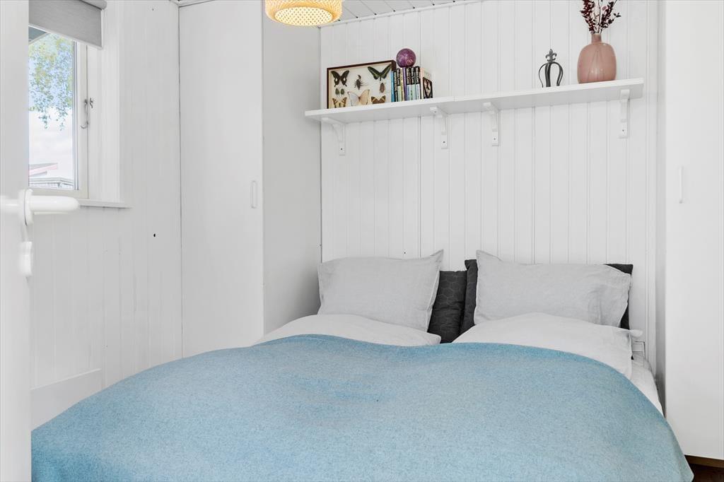 I stuen er der også adgang til sommerhusets andet soveværelse, der er hyggeligt indrettet med opbevaringsplads, sengelamper og en komfortabel dobbeltseng.
