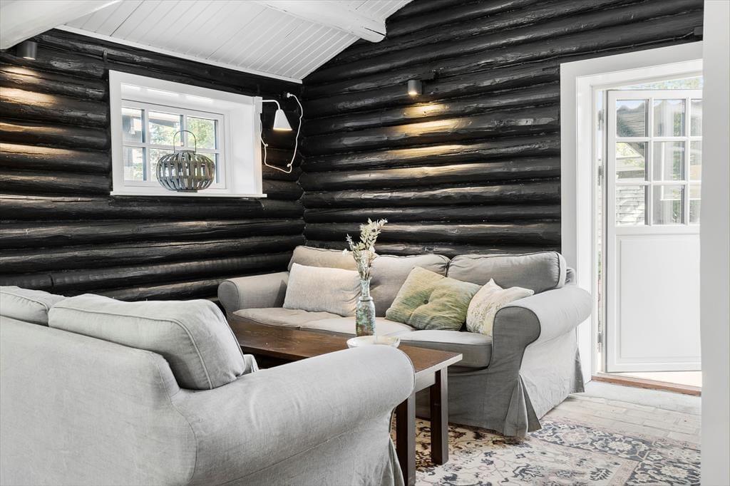 Fra køkkenet via entréen kommer man ind i husets store stue, hvor de originale bjælker er bevaret. De mørke vægge giver en helt særlig og meget hyggelig sommerhusstemning. Her er bløde sofaer og lænestole, hvor man kan sætte sig med en kop kaffe, læse en bog eller tænde for fjernsynet, der har en Chromecast, så det er muligt at se eget indhold via sin mobil/tablet og husets gratis WiFi. Når man vil skrue helt op for hyggen og varmen i stuen, kan man tænde op i kaminen.