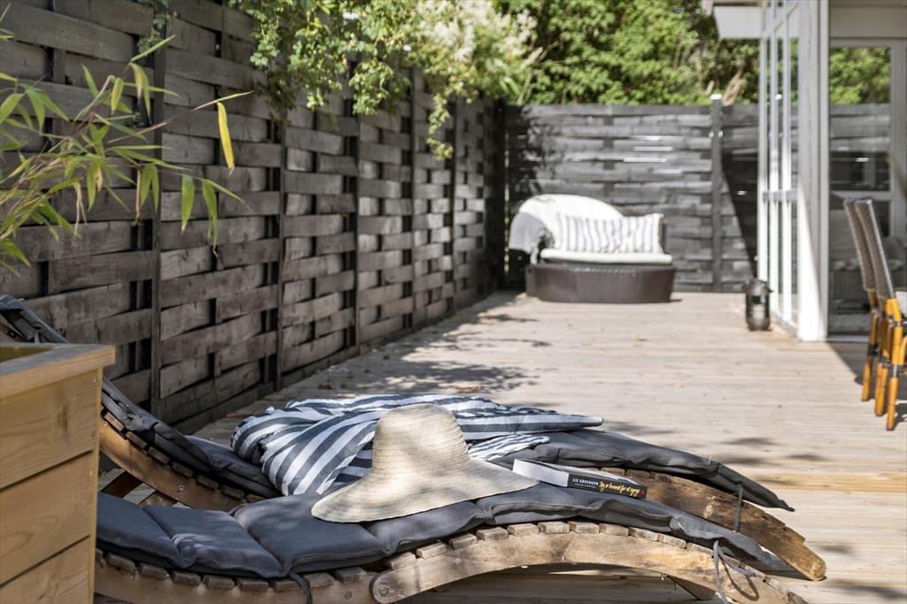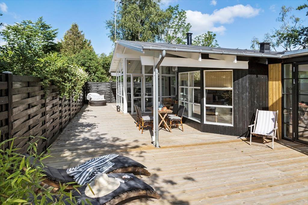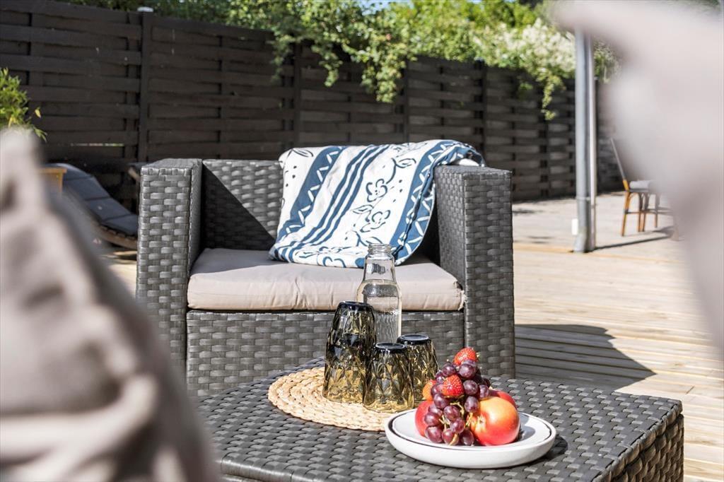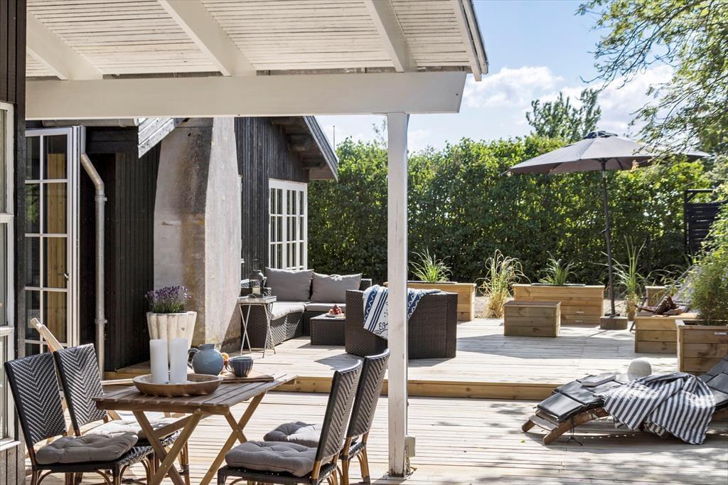Sommerhuset har en stor træterrasse i to niveauer, der går rundt om husets syd- og vestside, så der er gode muligheder for at finde både læ og sol her. Fra køkkenet og udestuen er der udgang til en overdækket terrasse, hvor det er ideelt at nyde feriens måltider. På den store terrasse findes flere komfortable havemøbler som solstole og loungemøbler, så man kan let tilbringe mange timer på den store terrasse. Her er også nyanlagte krukker og plantekasser, der giver et grønt og levende miljø.