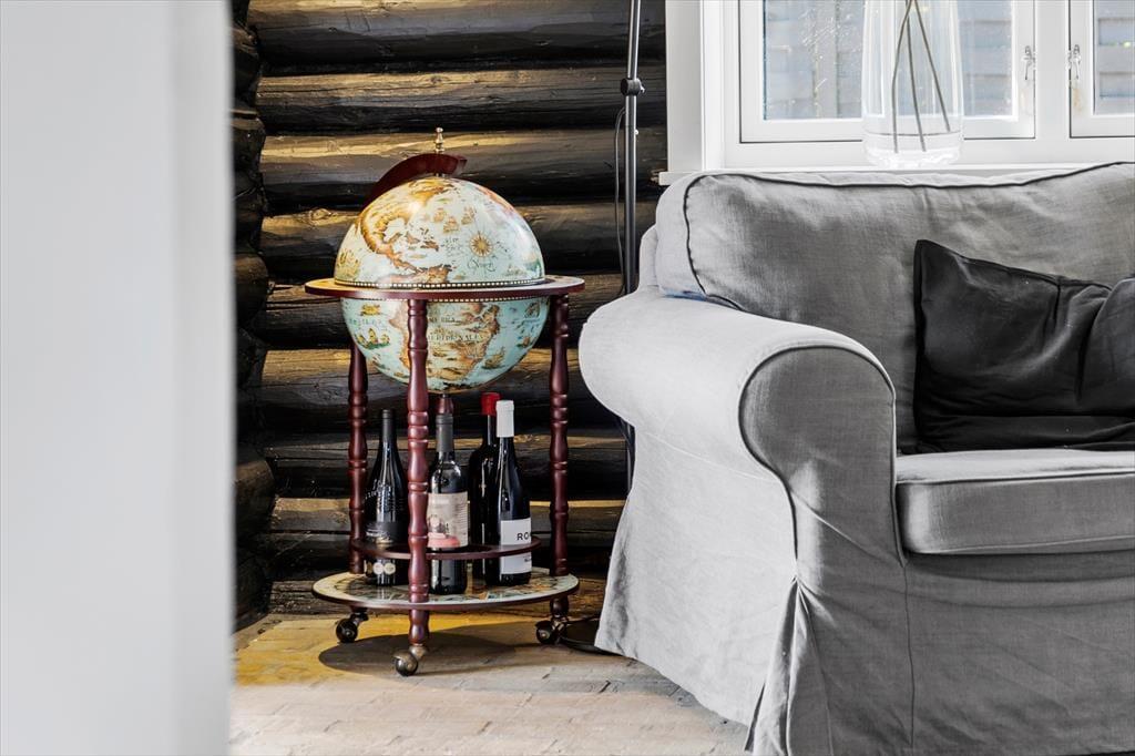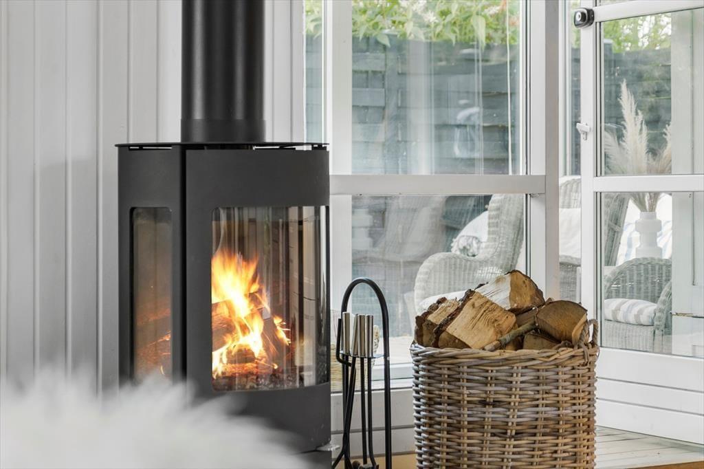Centralt i rummet er også en brændeovn, der giver varme og hygge i de kolde måneder.