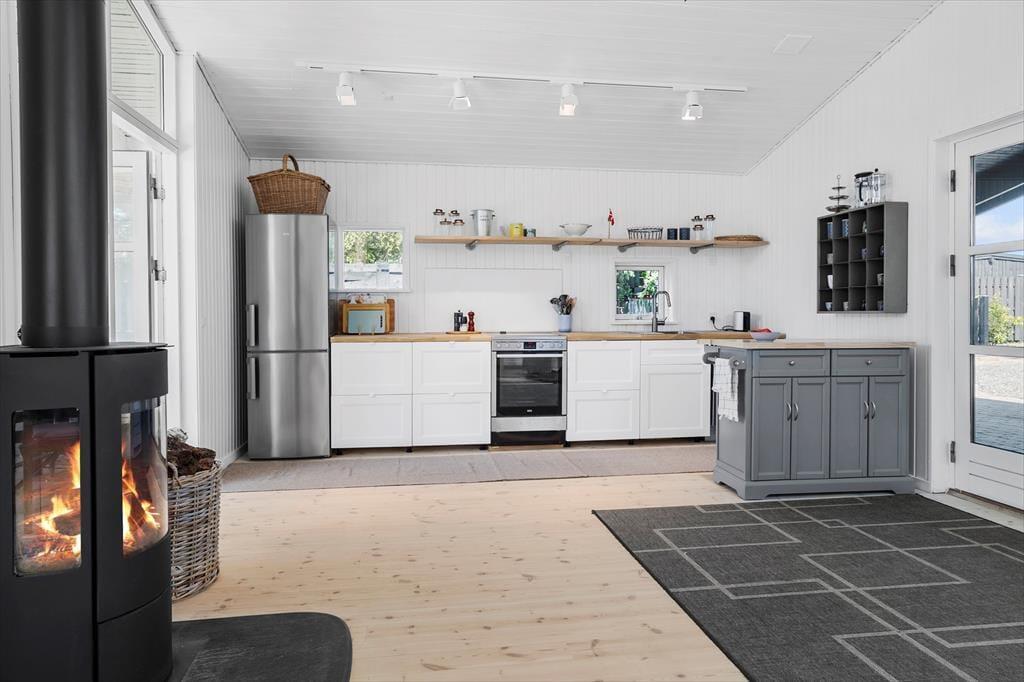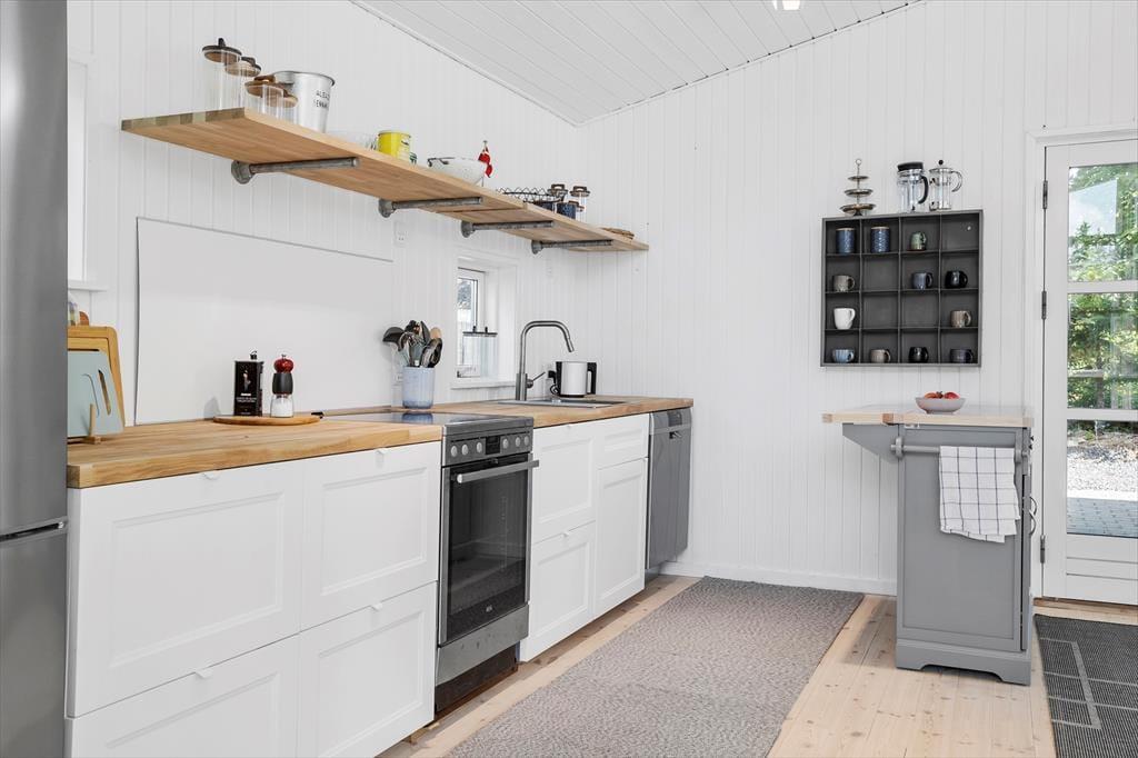 Køkkenet har alle de nødvendige faciliteter, man behøver på sommerhusferien. Her er b.la. ovn med komfur, køle/fryseskab, mikroovn og opvaskemaskine.