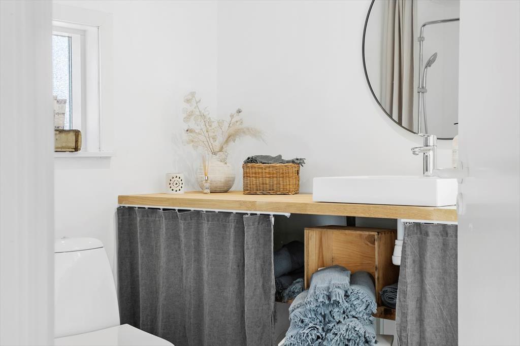 Soveværelset er ikke stort men har en komfortabel dobbeltseng og skabsplads, så her er plads til to af husets 4 gæster. Badeværelset er også lyst og nyrenoveret i en dejlig sommerhusstil med gulvvarme og en vaskemaskine.