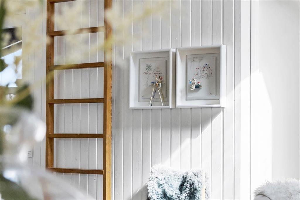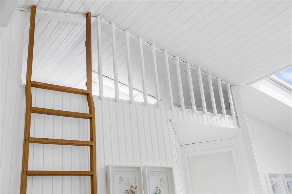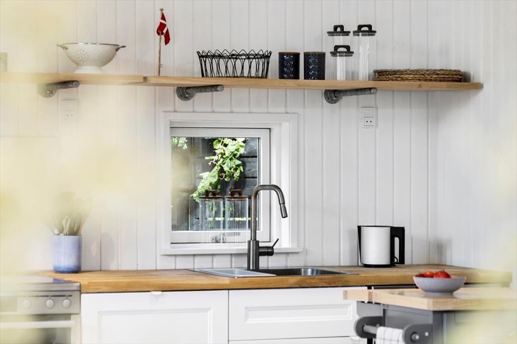 Herfra går man ind i husets køkkenalrum. Det åbne samlingsrum med køkken og spisebordsplads har loft til kip og en hyggelig hems med madrasser, hvor man kan kravle op og kigge ned eller slappe af lidt tilbagetrukket. De lyse trævægge og gulve er gennemgående i huset, hvilket er med til at gøre sommerhuset indbydende at holde ferie i.
