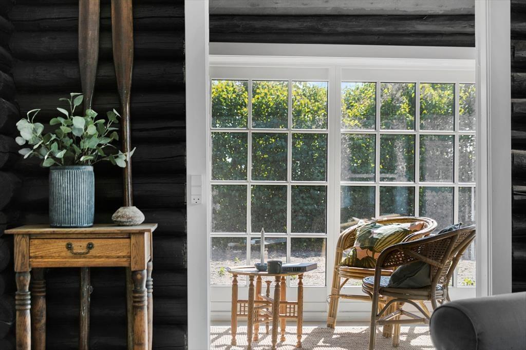 I stuens hjørne er der igen vinduer fra gulv til loft og udgang til terrassen, så man kan kigge ud på den fine terrasse og grønne have.