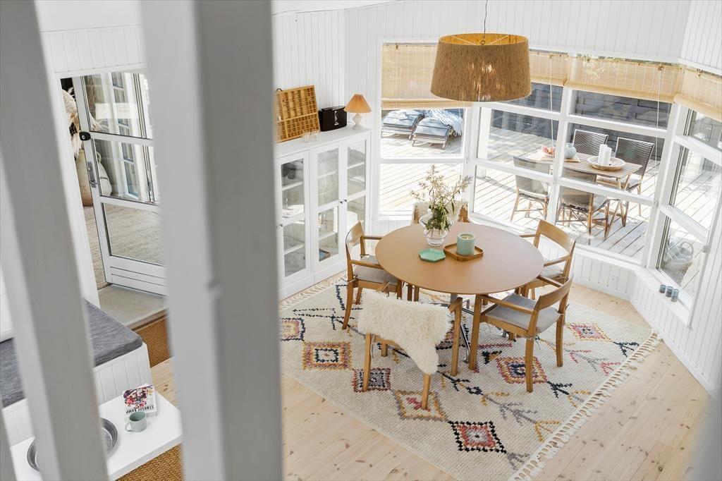 Spisebordet er placeret i en stor karnap i køkkenalrummet, hvor vinduerne giver et godt lysindfald og udsigt til terrassen. Ved det fine, runde spisebord, er der plads til, at alle husets gæster kan samles, og spisebordets gode placering i køkkenalrummet, giver anledning til mange gode timer her. Ved siden af spisebordet er indrettet en hyggekrog med en bænk og lænestol.