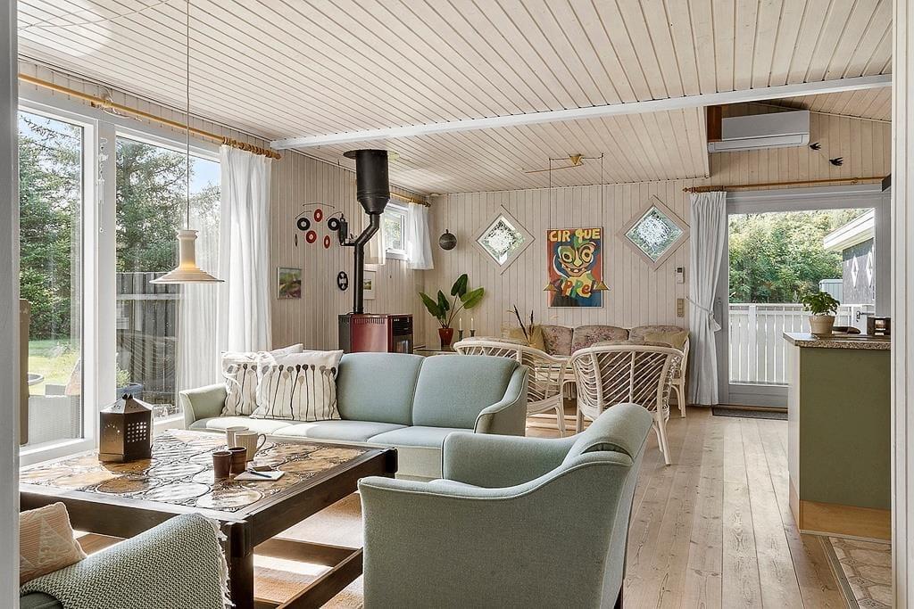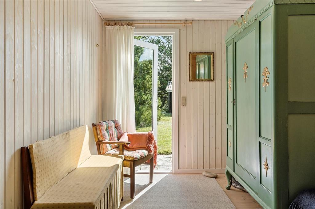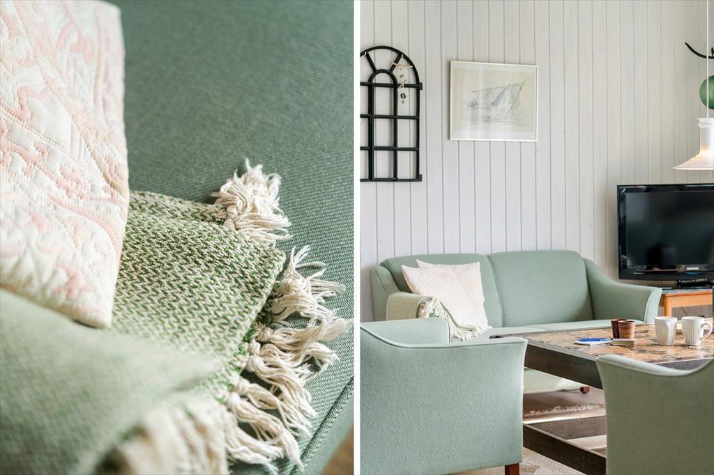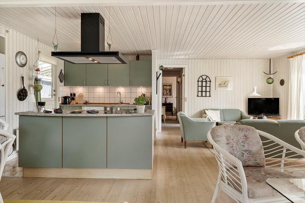 Når I træder ind i dette feriehus for første gang, vil I blive mødt at nøje udvalgte detaljer der giver feriehuset en helt fantastisk charme, de sarte farver der spiller op mod de lidt mere vovede giver feriehuset et fantastisk udtryk, her kan I virkelig nyde feriens afslappende ro og blot komme helt ned i gear. Det store køkkenalrum som er smukt prydet med de sarte grønne farver, giver jer mulighed for at være sammen på trods af at I laver forskellige ting, måske nogle spiller kort om spisebordet imens andre laver mad i det skønne køkken, ja mulighederne er mange. Garage med ekstra fryser, og mulighed for at parkere bil/trailer og evt. medbragte cykler