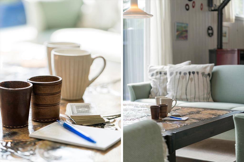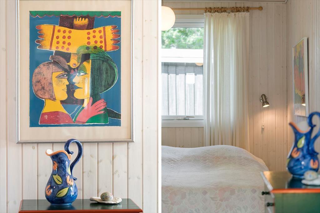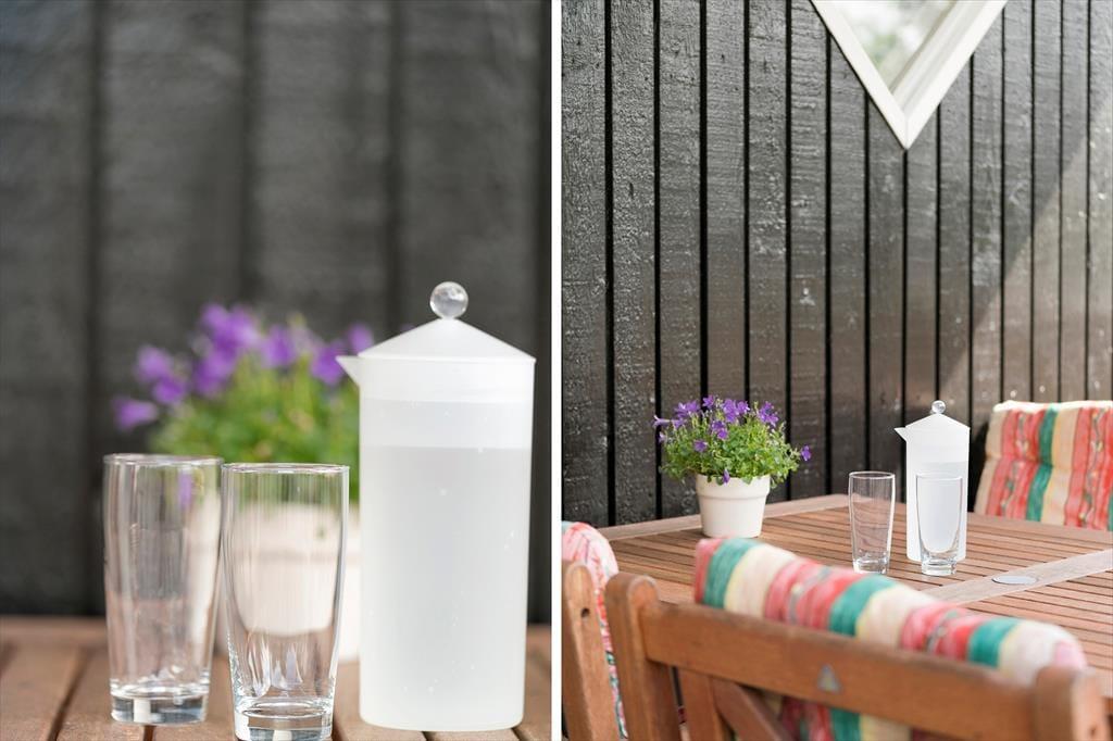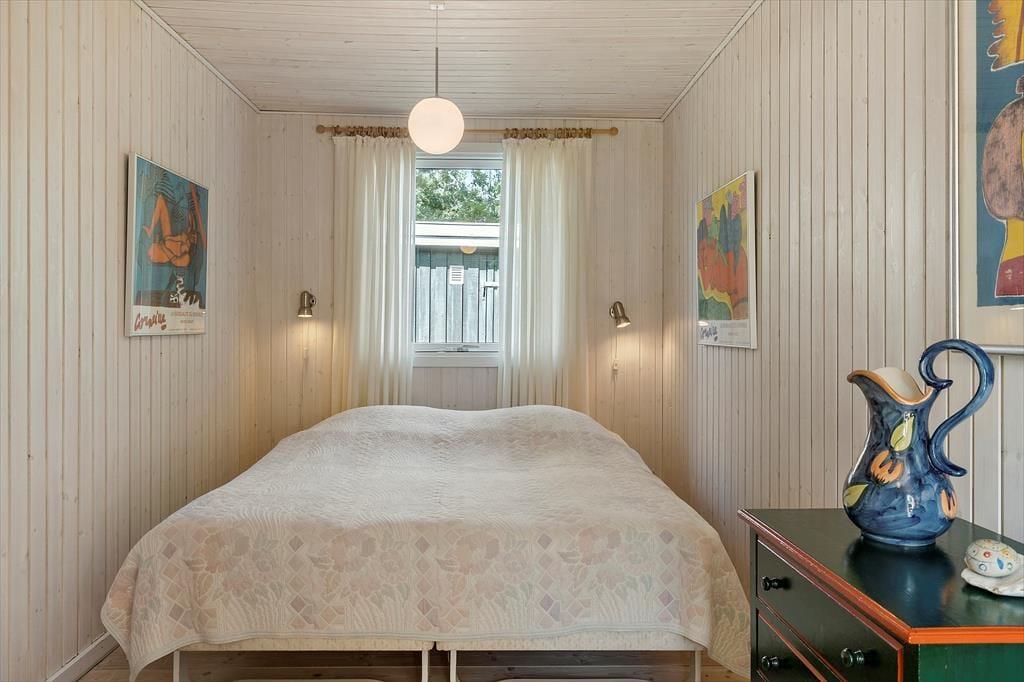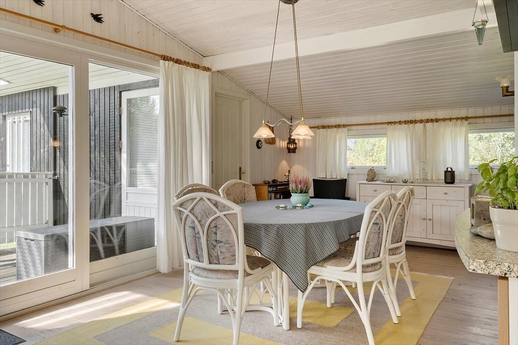Når I træder ind i dette feriehus for første gang, vil I blive mødt at nøje udvalgte detaljer der giver feriehuset en helt fantastisk charme, de sarte farver der spiller op mod de lidt mere vovede giver feriehuset et fantastisk udtryk, her kan I virkelig nyde feriens afslappende ro og blot komme helt ned i gear. Det store køkkenalrum som er smukt prydet med de sarte grønne farver, giver jer mulighed for at være sammen på trods af at I laver forskellige ting, måske nogle spiller kort om spisebordet imens andre laver mad i det skønne køkken, ja mulighederne er mange. Garage med ekstra fryser, og mulighed for at parkere bil/trailer og evt. medbragte cykler
