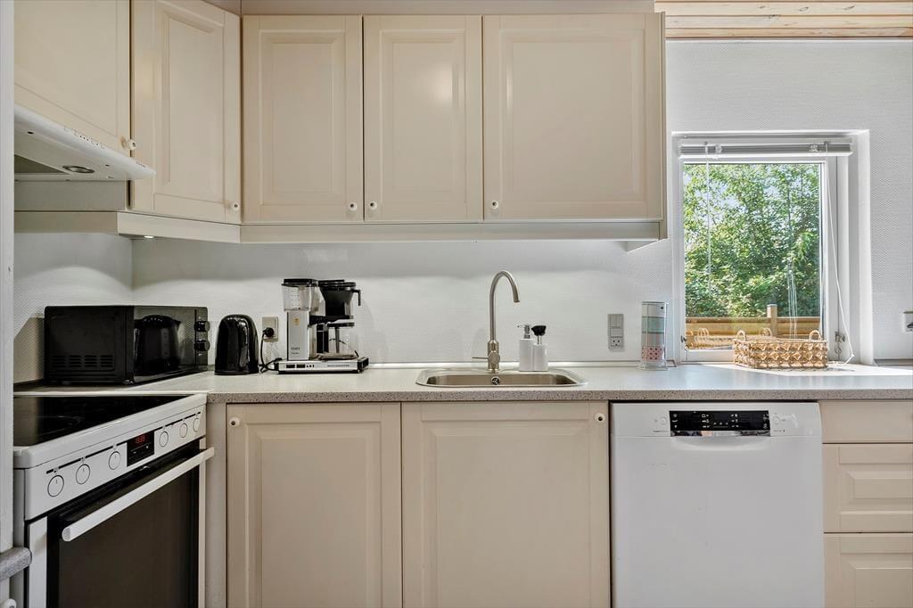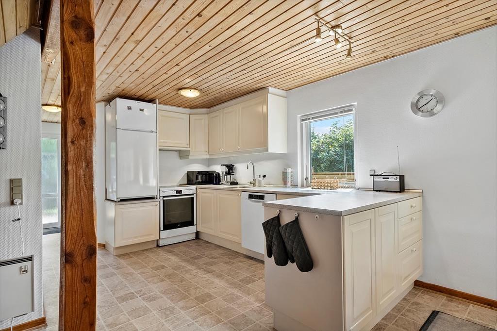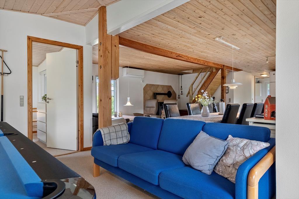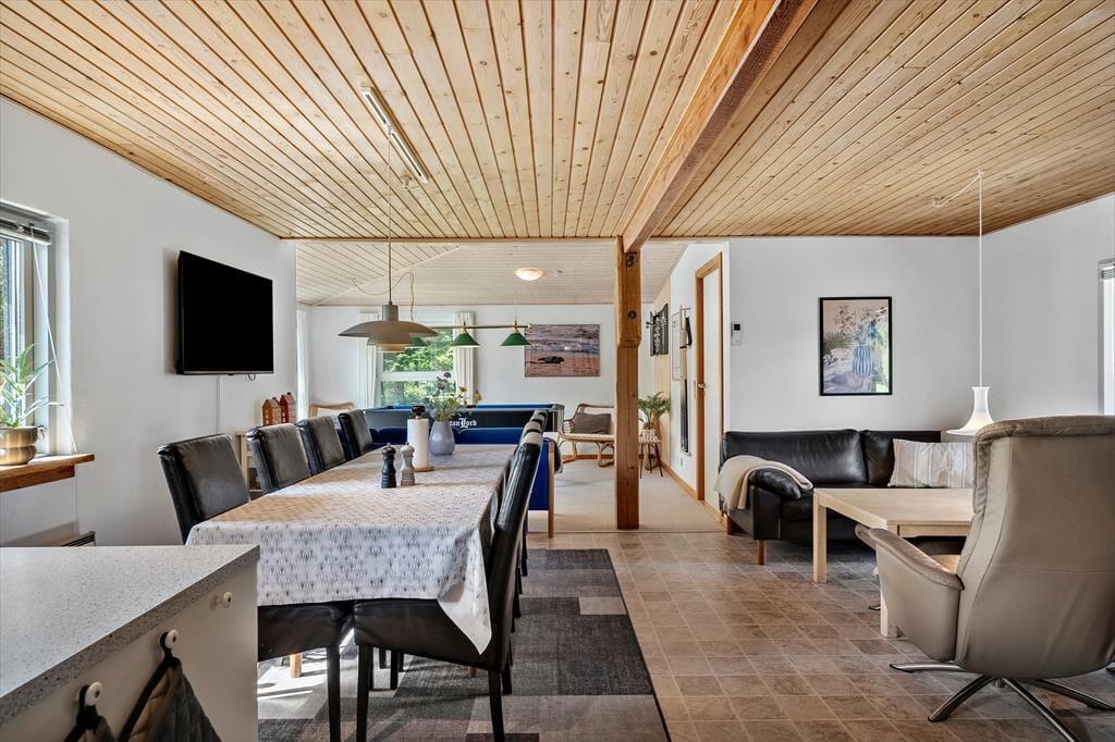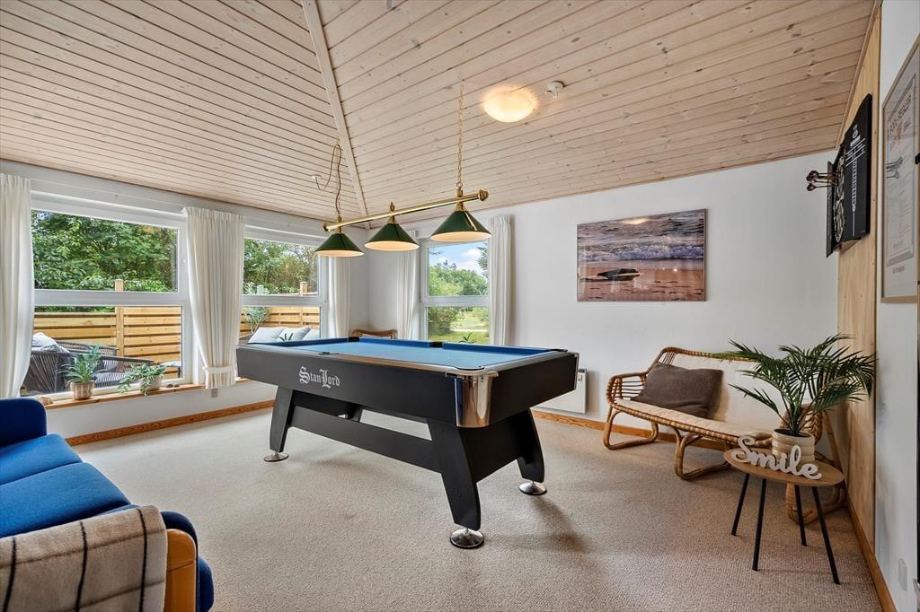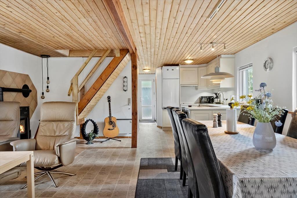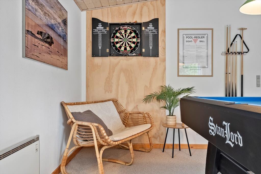 Her er rammerne sat til en ferie fyldt med hygge, samvær og gode oplevelser. Sommerhuset er bygget i træ og indrettet med fokus på både afslapning og sjov. Det store opholdsrum samler køkken, spiseplads og stue i ét, så alle kan være en del af fællesskabet – uanset om der laves mad, læses en bog eller hygges foran brændeovnen med en kop kaffe. For enden af stuen venter ekstra feriesjov, hvor der er indrettet et lille område med billard og dart, perfekt til både voksne og børn, der vil udfordre hinanden. Her er plads til hele familien, og atmosfæren er varm og indbydende.