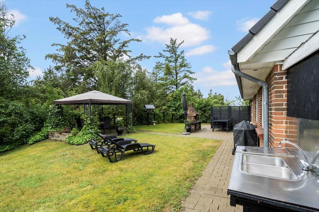 Dette dejlige feriehus ligger på en fortryllende grund hvor I har rig mulighed for at nyde livet udendørs, her er der plads til at spille fodbold eller blot nyde den dejlige sol i en af liggestolene på den skønne terrasse. Hvis regnen en dag trommer på taget kan I sætte jer ind under den dejlige pavillon og nyde lyden og duften af den kølige regn en skøn sommerdag. Når aftensmaden skal laves så smid bøfferne og grøntsagsspydende på grillen og nyd den lækre duft af mad der blander sig med den dejlige varme fra den skønne udendørs pejs. Sæt jer op på den smukke balkon og nyd den fantastiske udsigt som man ikke kan andet end at synes om.