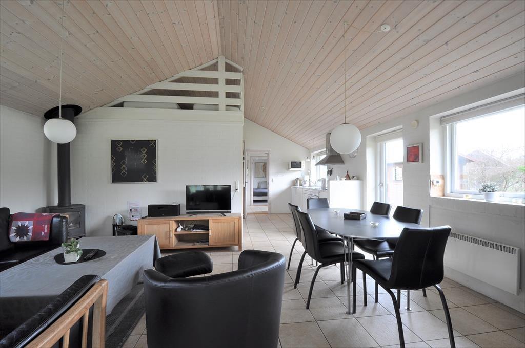 Glæd jer til et hyggeligt og indbydende feriehus, hvor I straks føler jer hjemme. Her er der indrettet med komfortable møbler og en varm atmosfære, der indbyder til ægte feriehygge. Det veludstyrede køkken ligger i åben forbindelse med stuen – perfekt til fælles madlavning, brætspil eller bare afslapning foran brændeovnens knitrende ild. I får et stort soveværelse med TV, komfortable elevationssenge og direkte udgang til terrassen, samt et ekstra soveværelse med dobbeltseng og eget toilet. Børnene vil elske den hyggelige hems med madrasser, og den skønne udestue med havemøbler giver jer ekstra plads til afslapning året rundt.