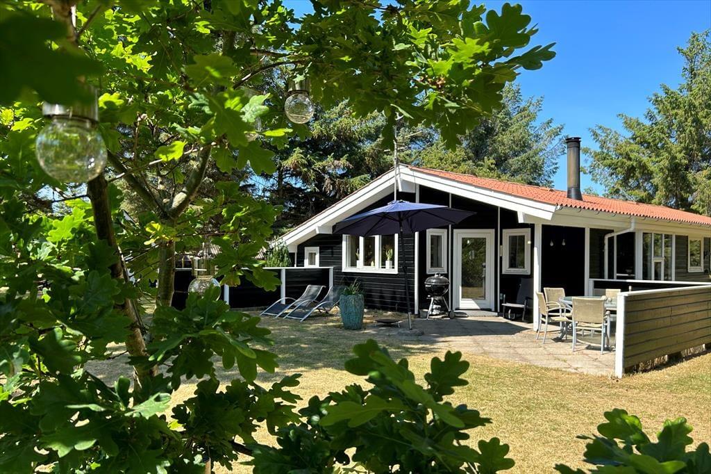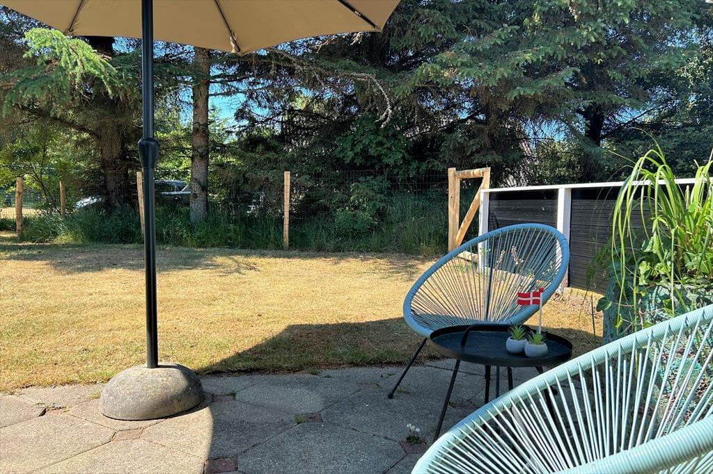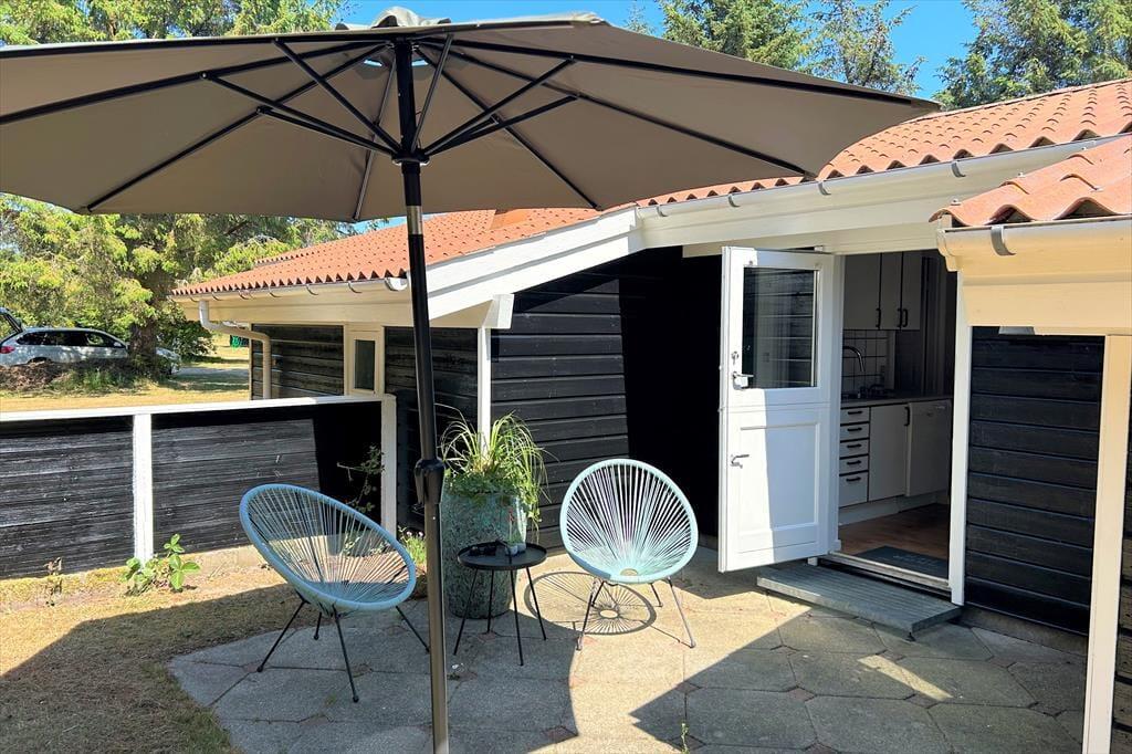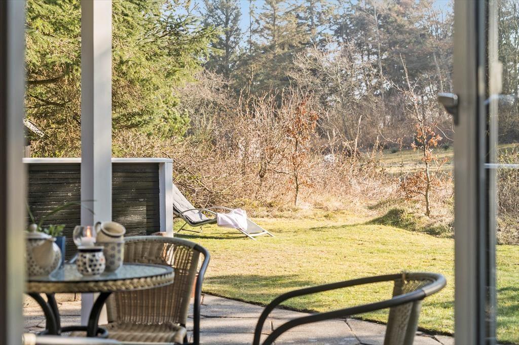 I vil elske dette charmerende træferiehus, der er smukt placeret på en naturgrund med masser af læ og privatliv. Her kan I virkelig koble af og nyde ferien i rolige omgivelser, hvor fuglesang og den friske luft er en del af hverdagen. Fra den hyggelige stue træder I direkte ud på en sydvendt, delvist overdækket terrasse – perfekt til solrige morgenstunder, lange frokoster eller aftener med grill og god vin. Her står komfortable havemøbler klar til jer. På husets vestside finder I endnu en dejlig terrasse, hvor I kan nyde solen helt til den, går ned. Et ideelt sted til både afslapning og samvær midt i naturen.