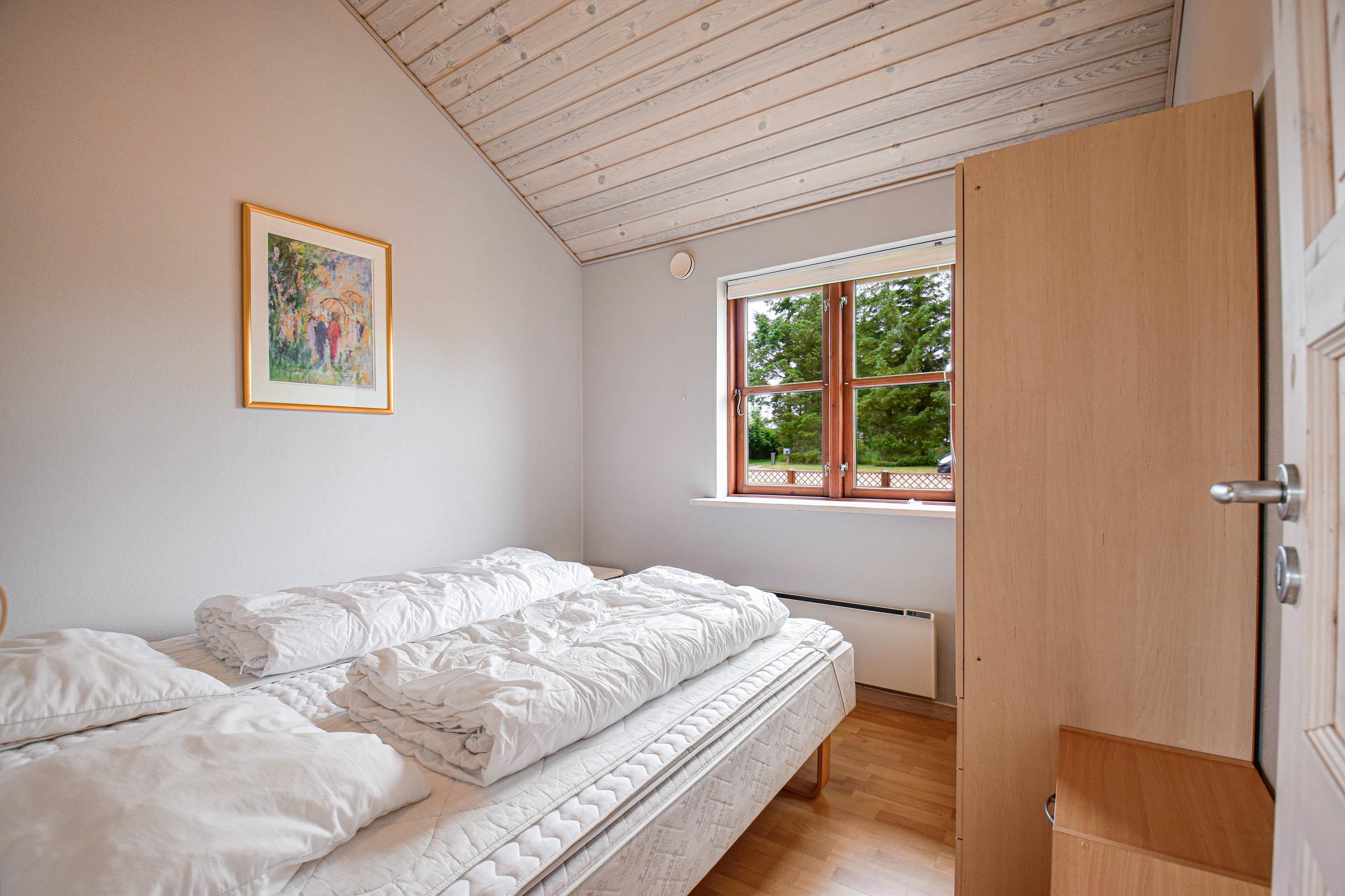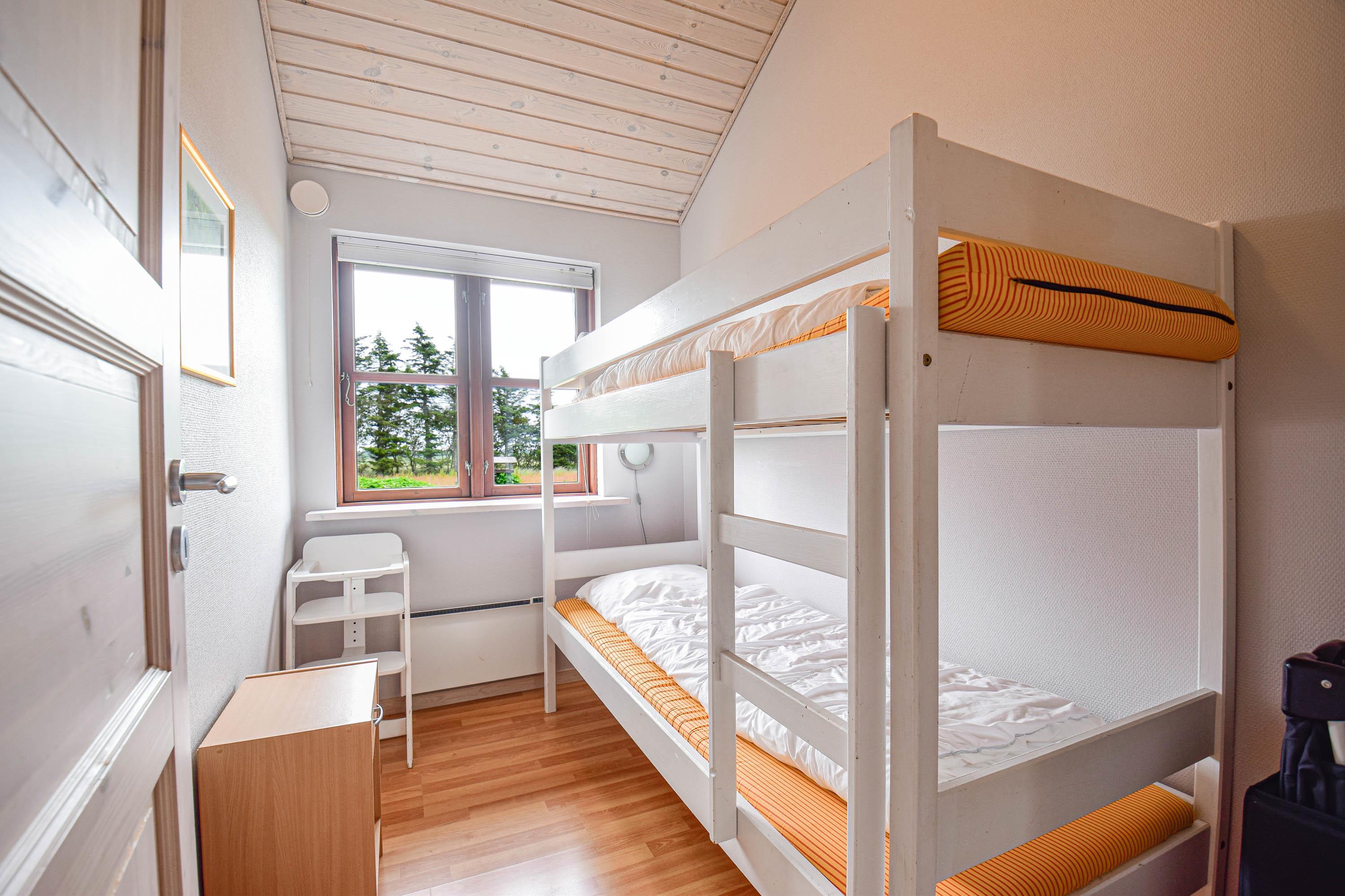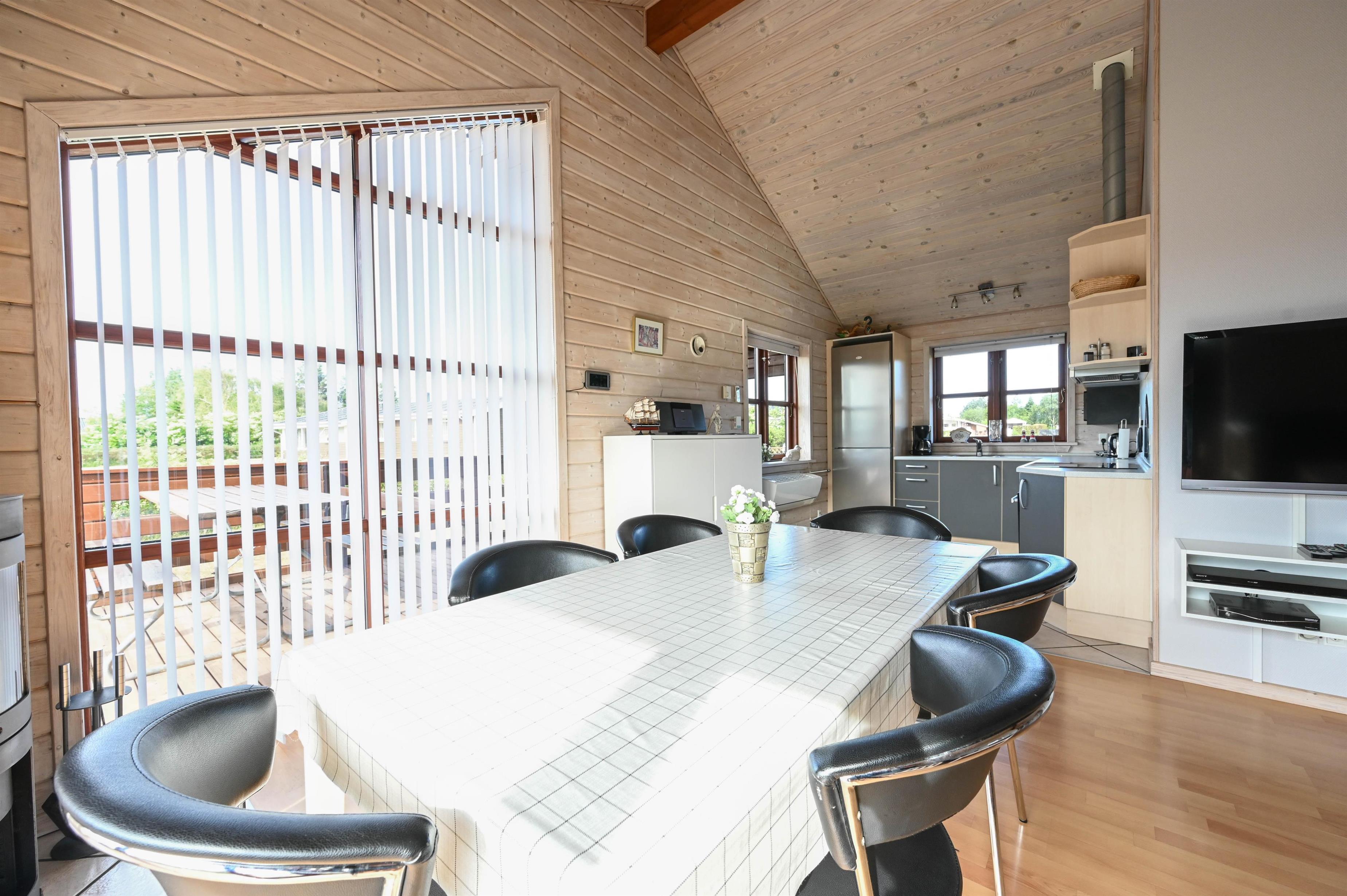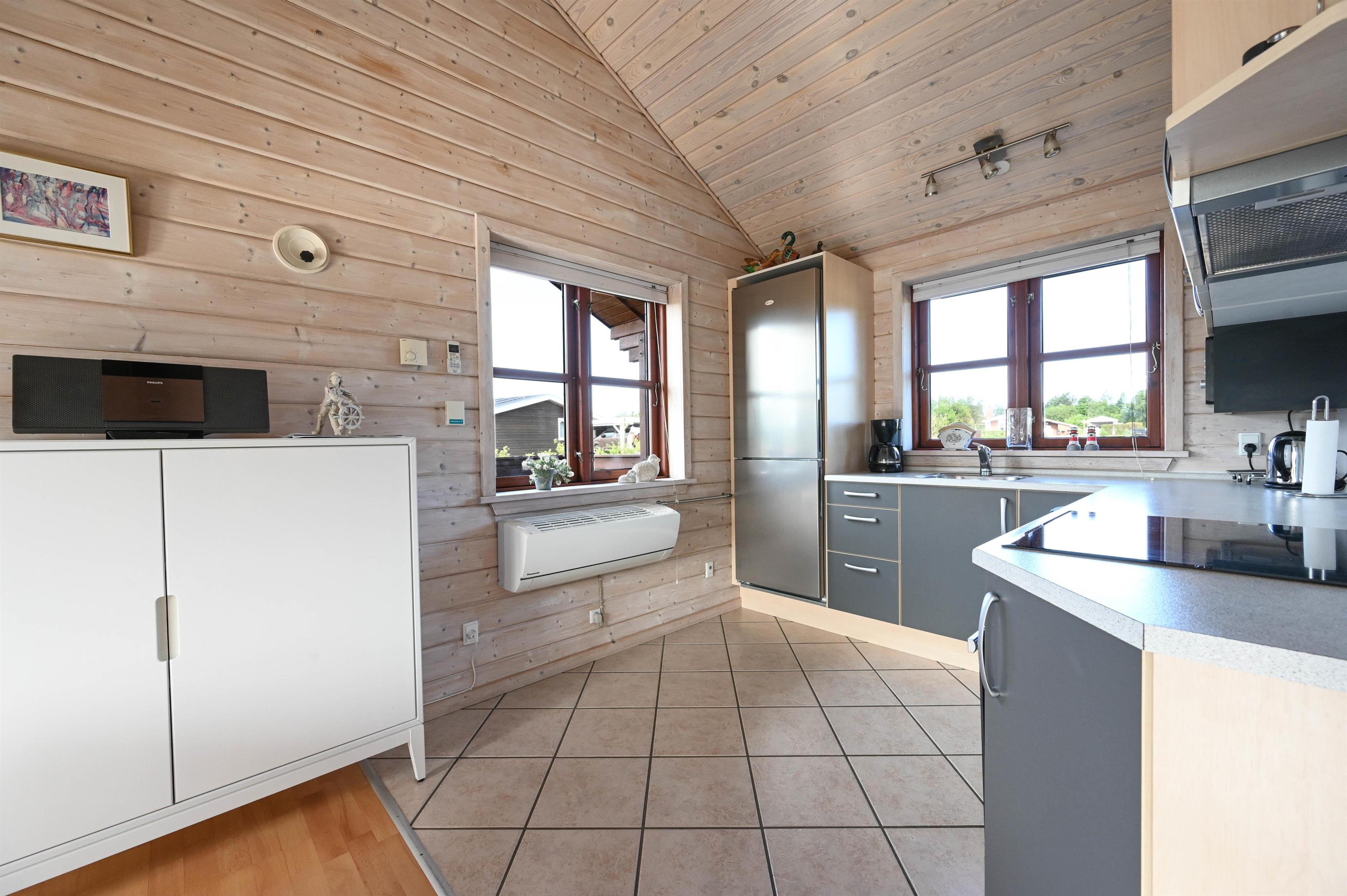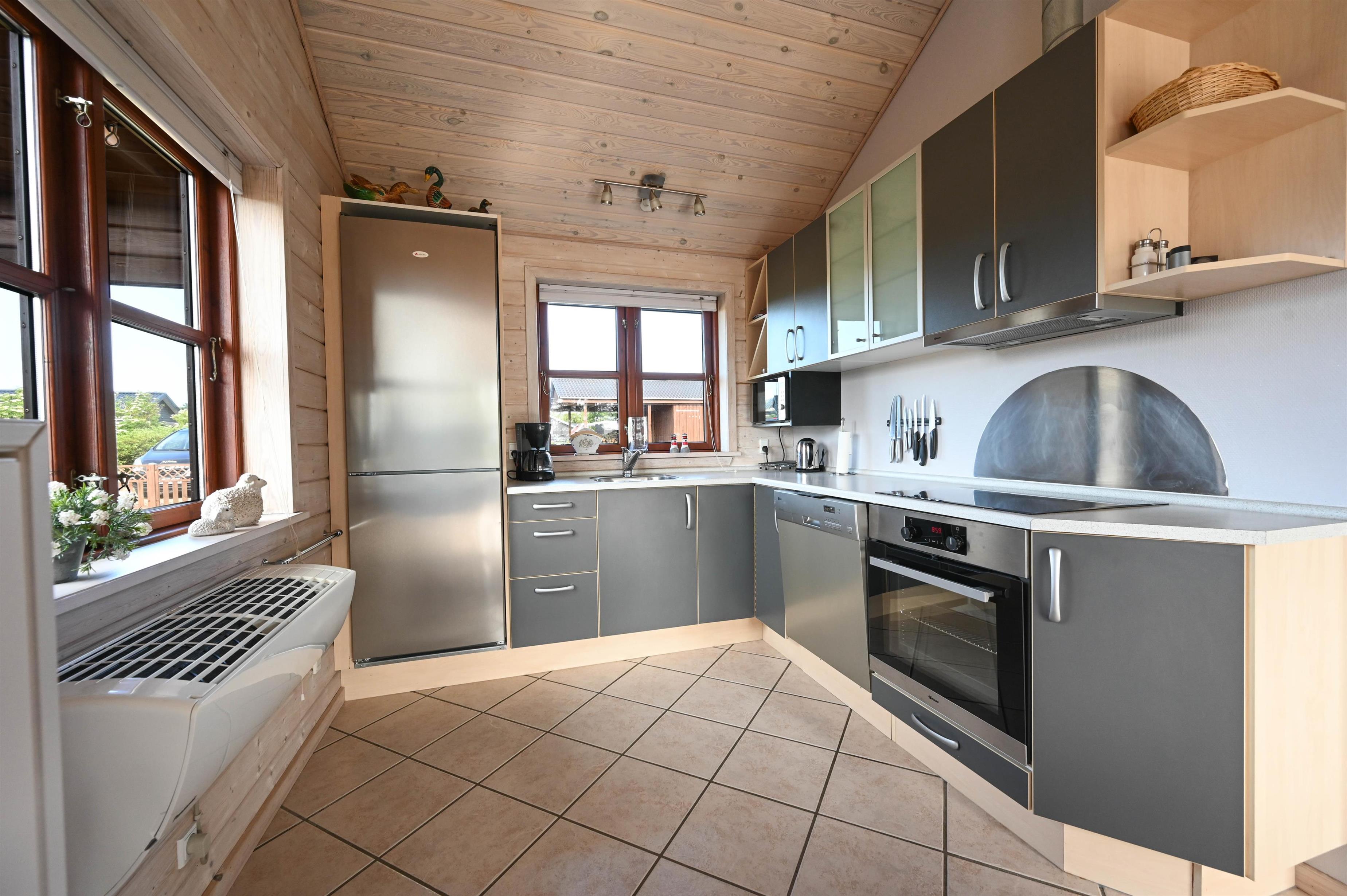 Indretning: Feriehuset er hyggeligt og smagfuldt indrettet, med dejlig stue i forbindelse med køkkenet, gulvene er belagt med klinker og fra køkkenet er der udgang til dejlig sydvendt terrasse. 2 gode soveværelser med dobbeltsenge, samt værelse med etagesenge, gulvene i soveværelserne er belagt med træ. Flot badeværelse med spa og adgang til sauna, samt lille badeværelse med bruser. Fryser ca. 100 l.