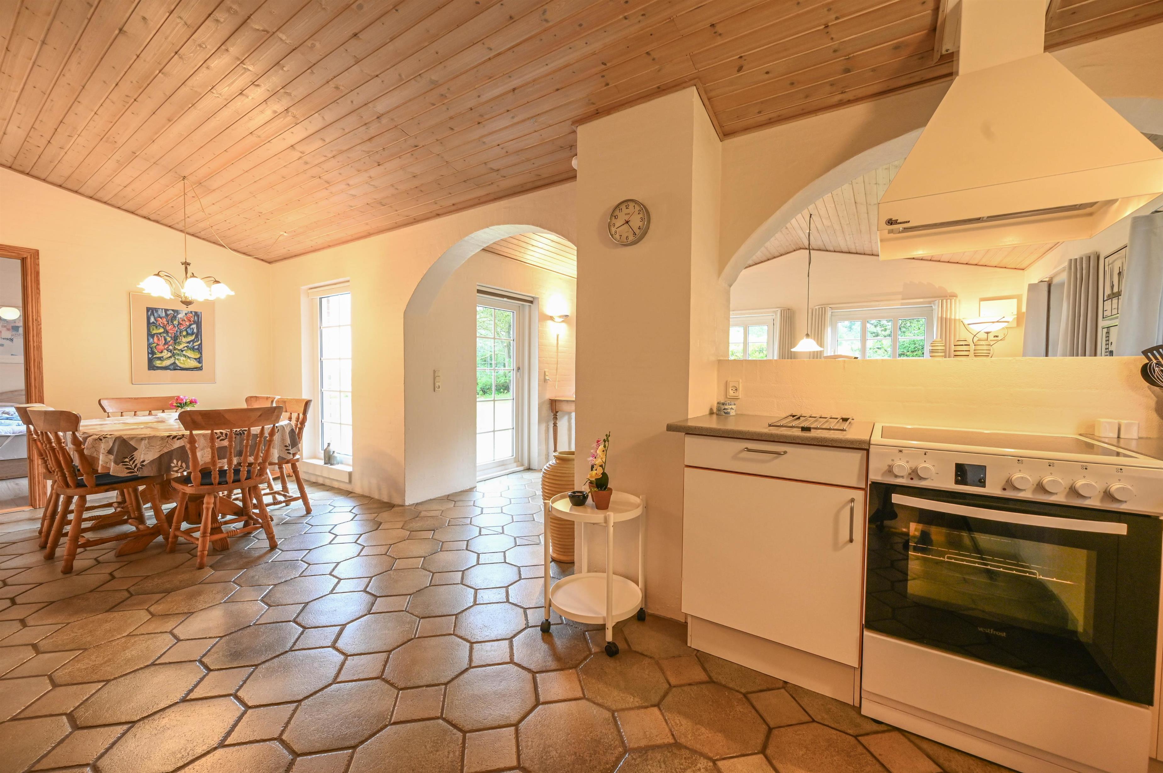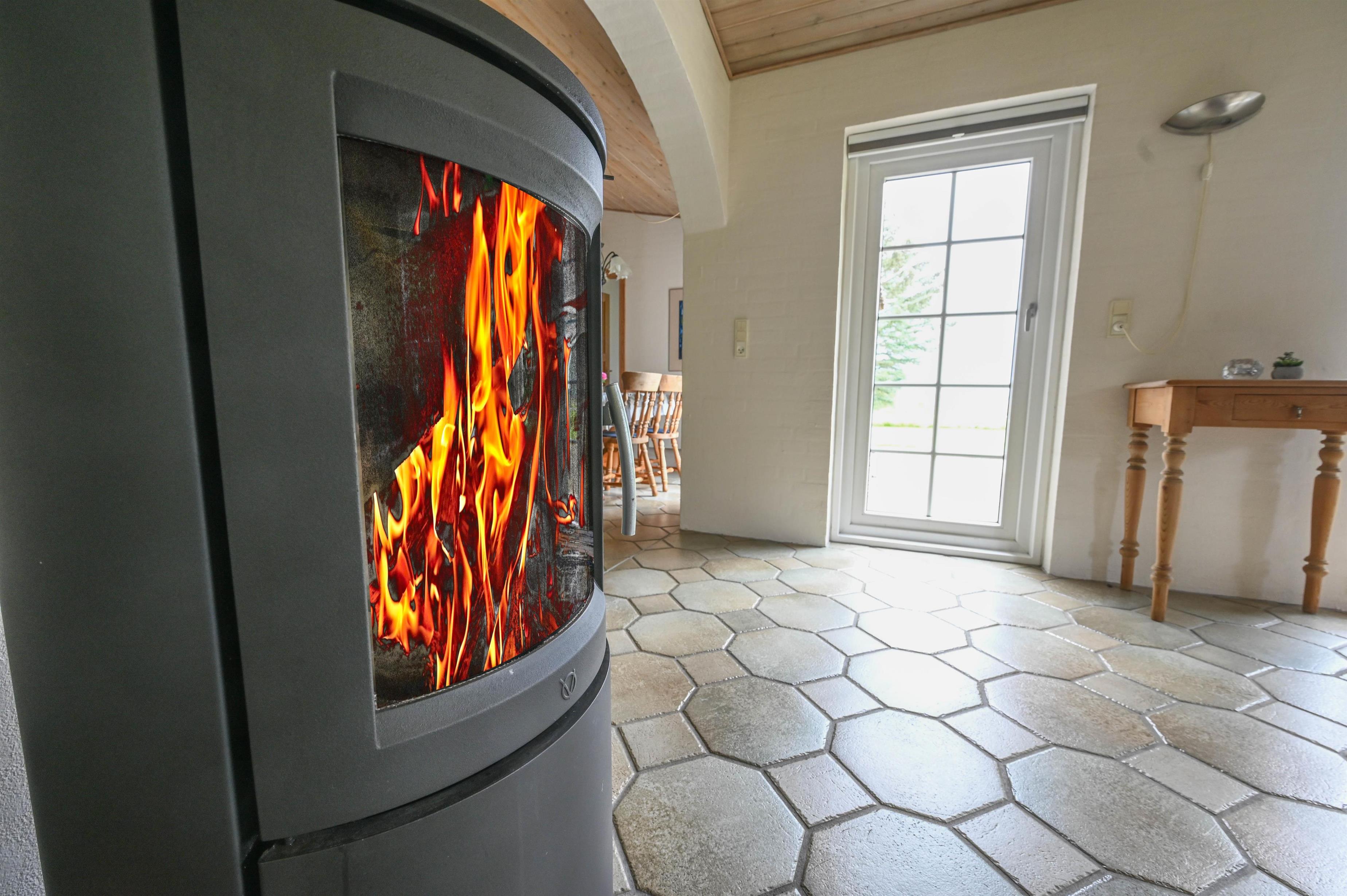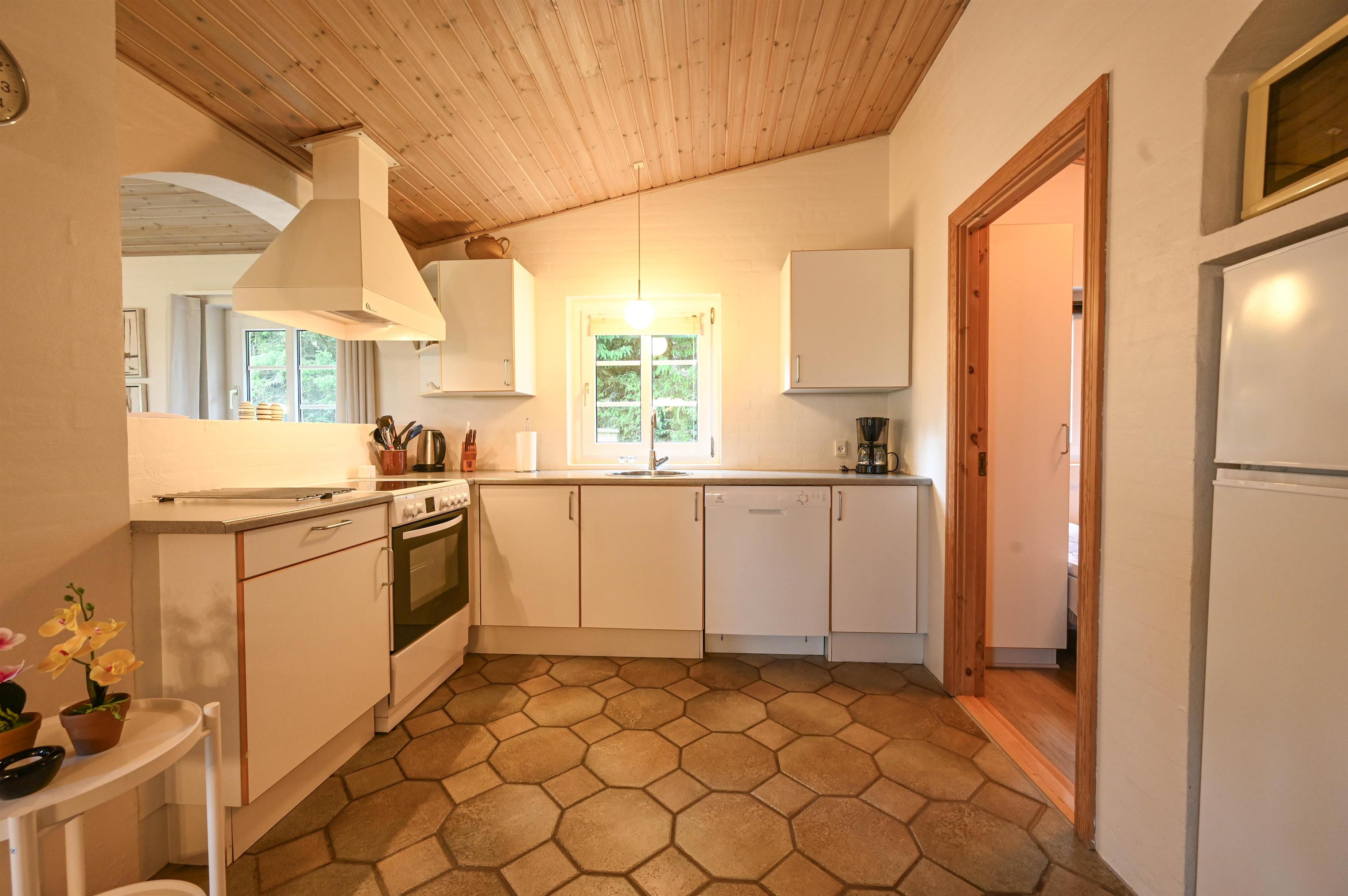 Det flotte og veludstyrede køkken har bl.a. opvaskemaskine og ligger i åben forbindelse med stuen, hvor du finder spiseplads, en komfortabel sofagruppe, brændeovn og udgang til terrassen, hvorfra der er et lille glimt af fjorden.
