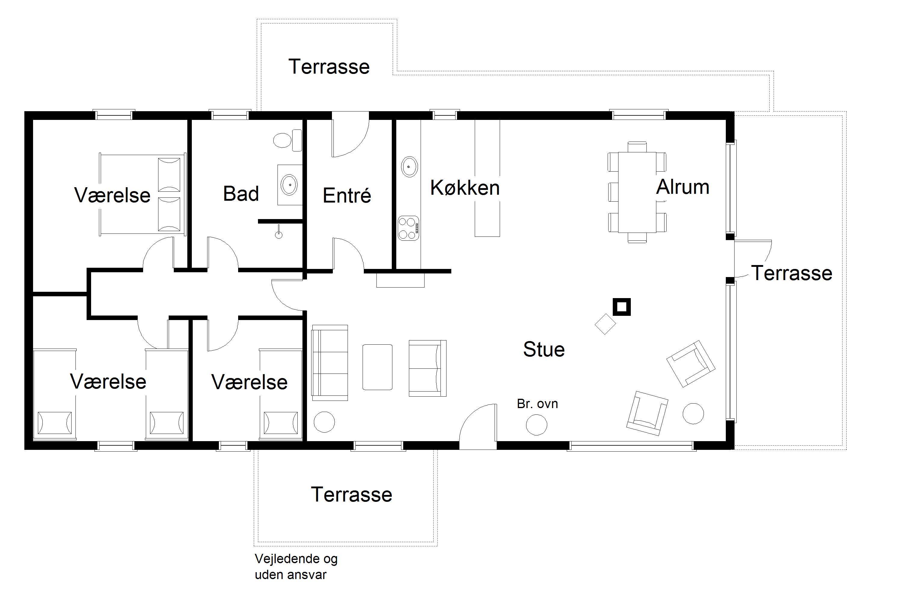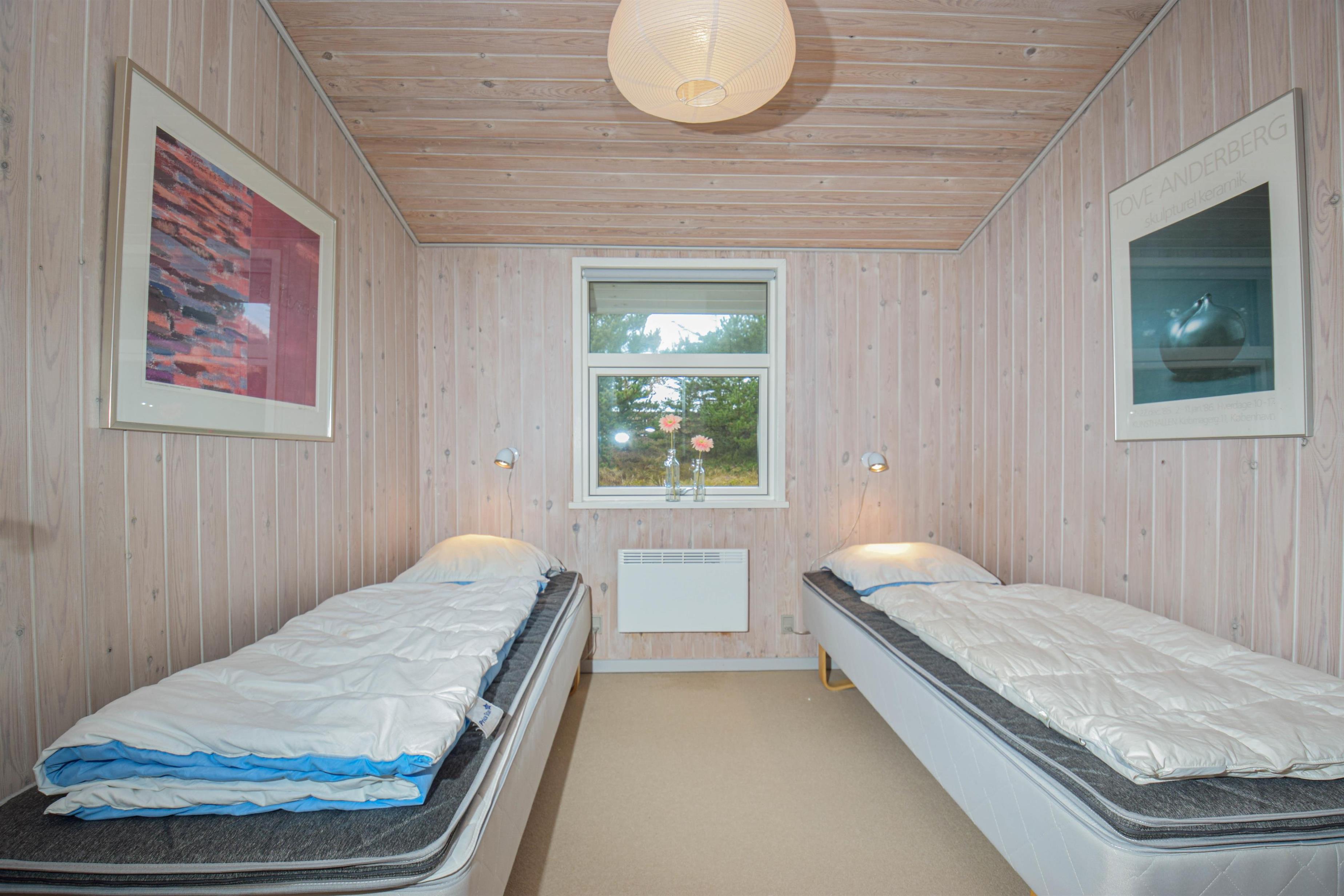 De tre soveværelser er indrettet med en god dobbeltseng, to enkeltsenge og en køjeseng, så der er plads til både par og familie.