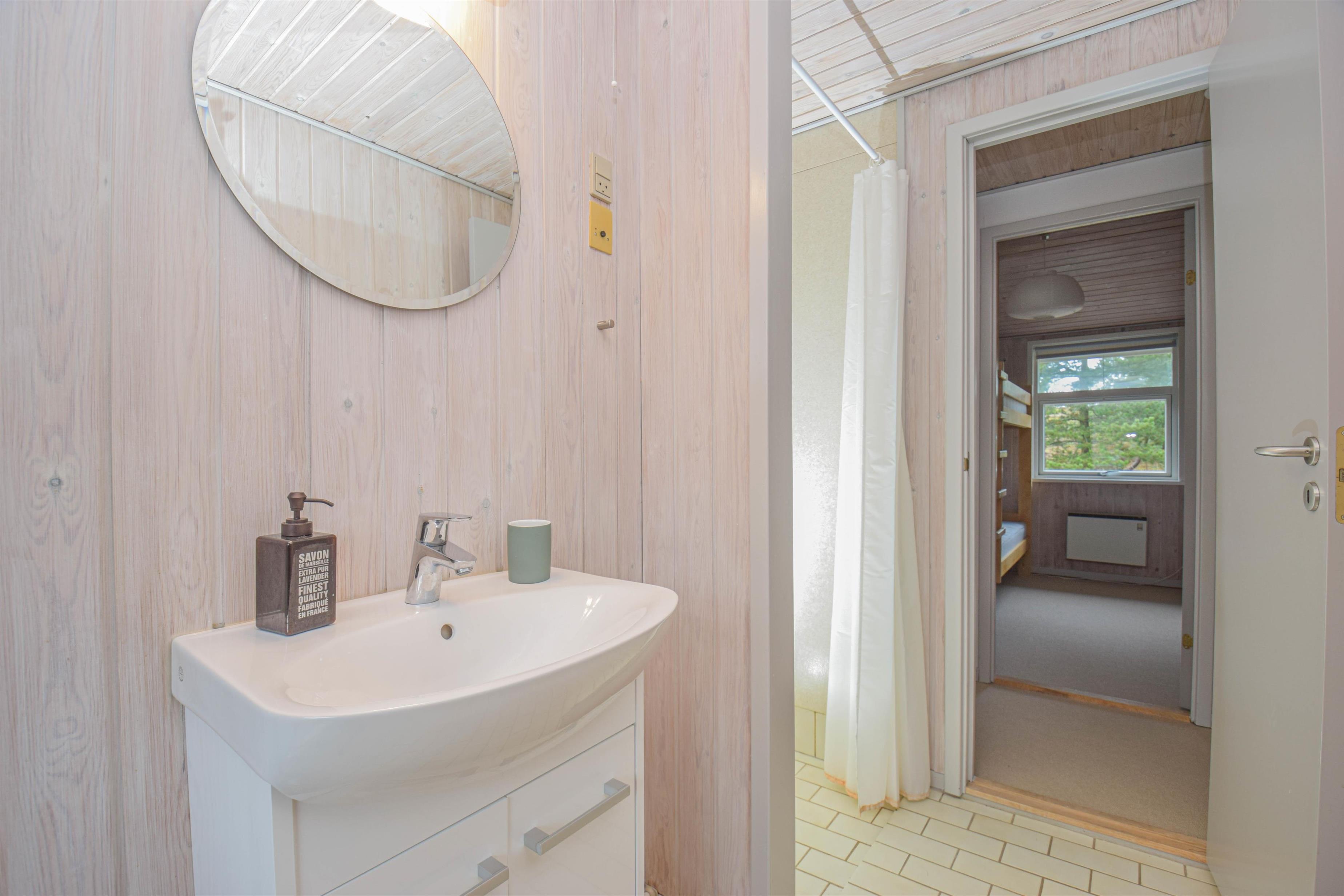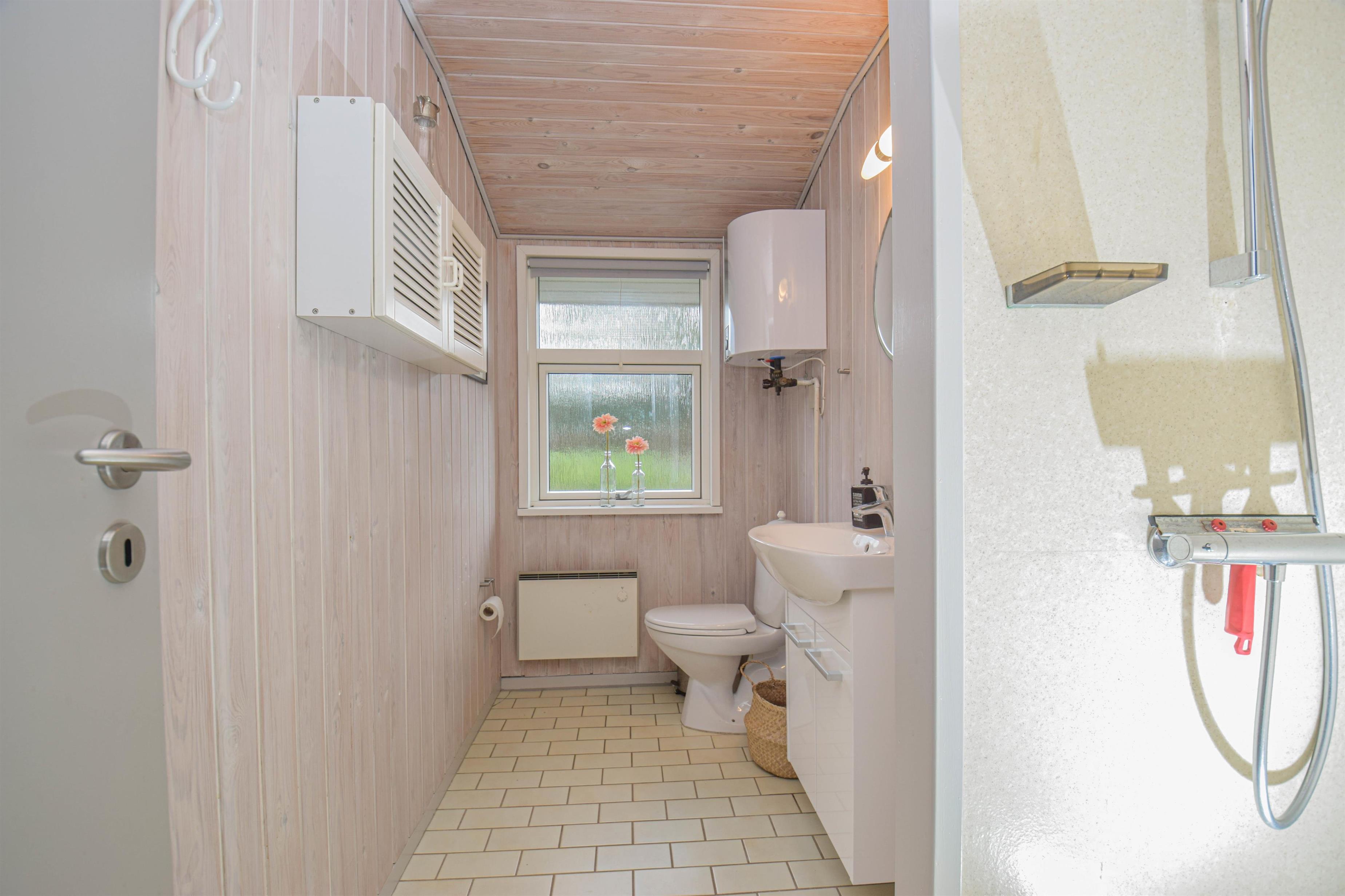 Badeværelset er lyst og pænt med god brusekabine.