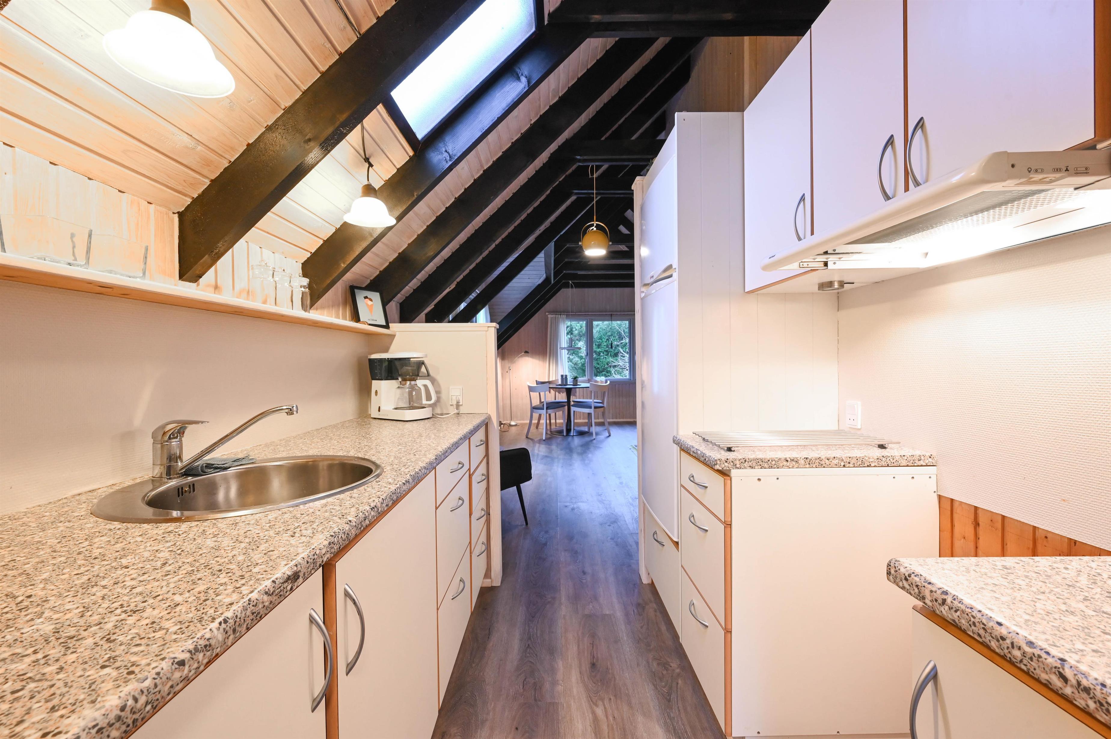 Feriehuset er af ældre dato, men bliver i løbet af foråret 2026 renoveret ude og inde, så husets oprindelige charme er bevaret, samtidig med at komforten er i orden. Det lille, funktionelle køkken ligger i åben forbindelse med stuen og danner rammen om rolige feriestunder med madlavning, brætspil eller en stille stund med en god bog.