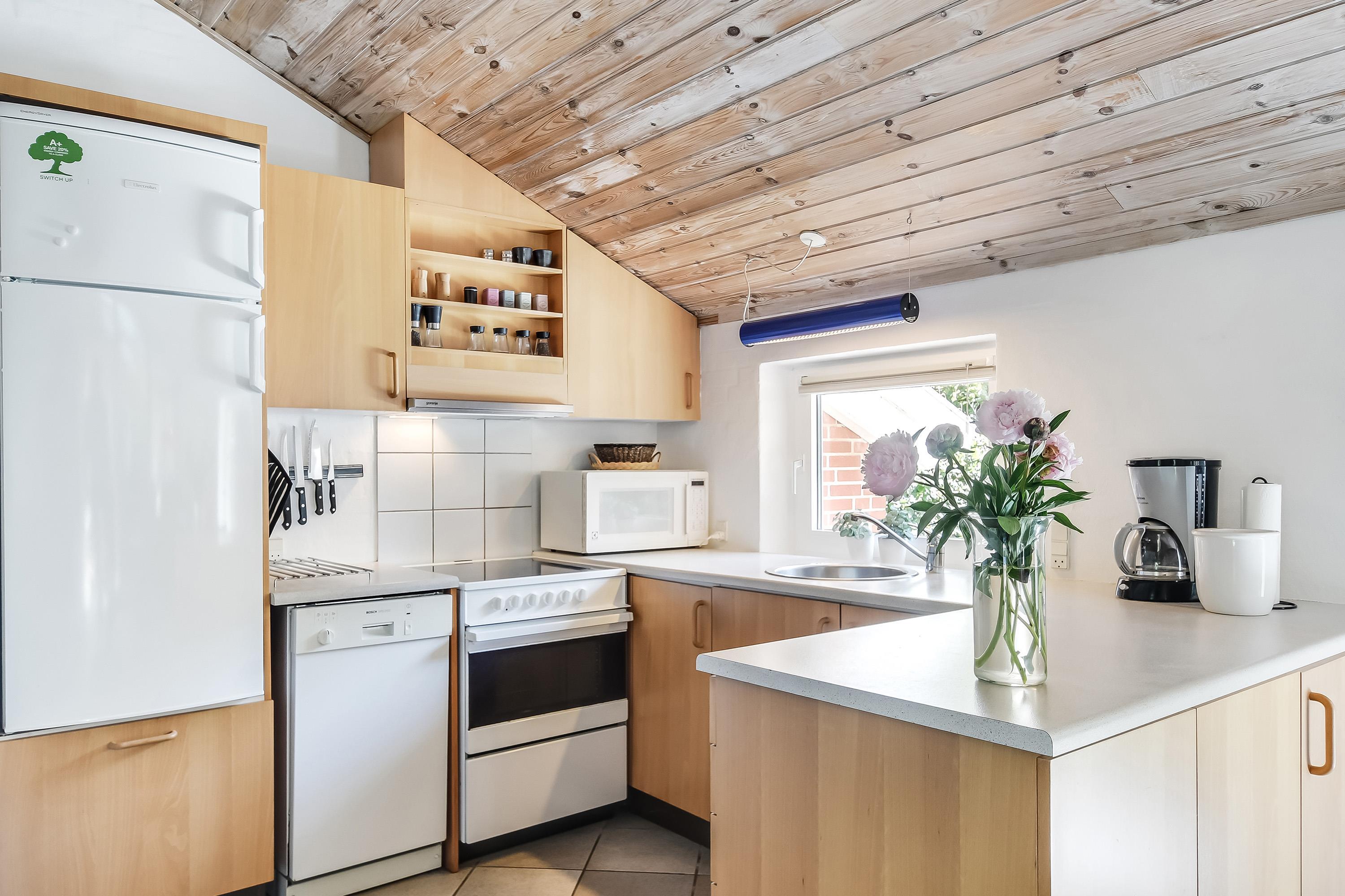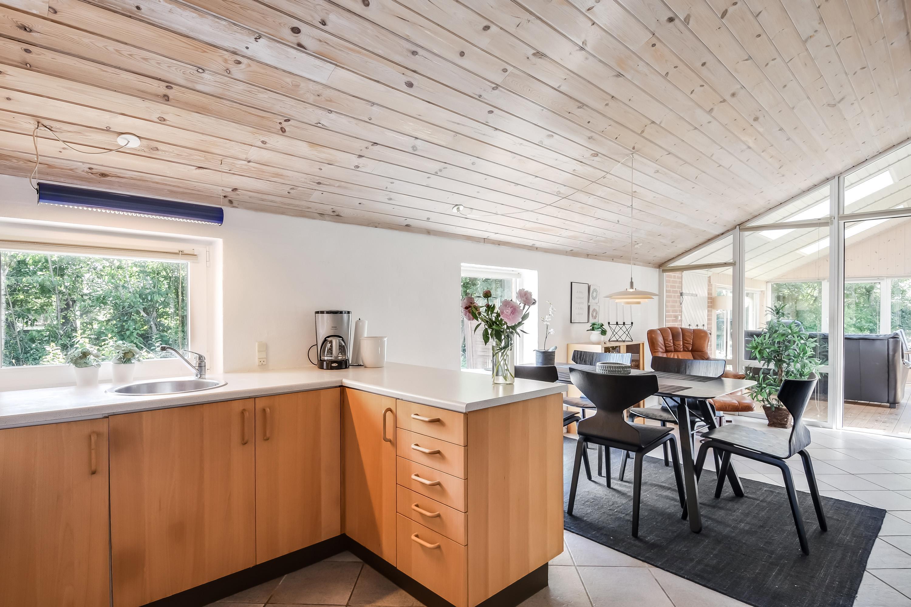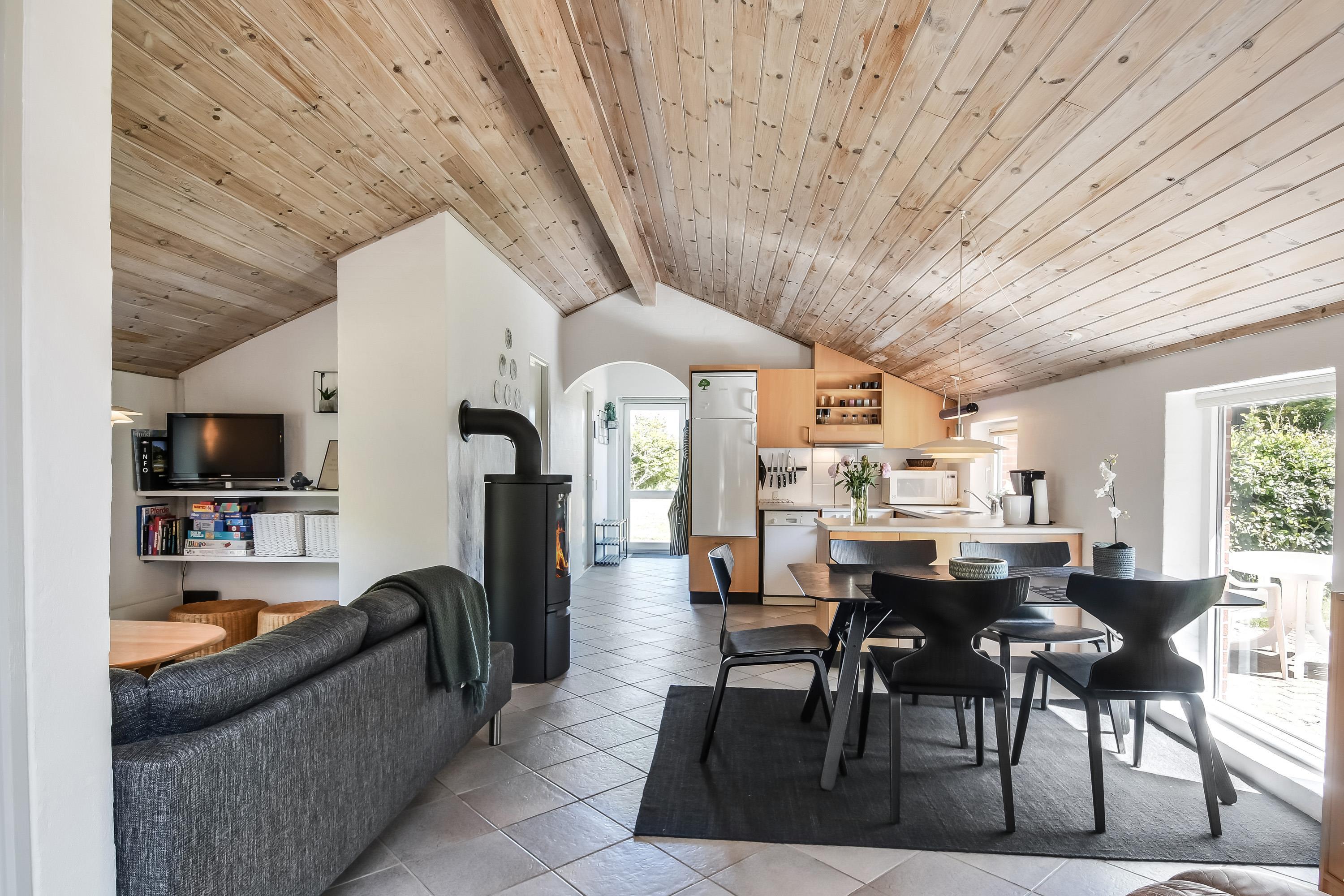 Køkkenet ligger i åben forbindelse med spiseplads og stue, hvor brændeovnen og fladskærms-TV skaber den helt rigtige feriestemning.