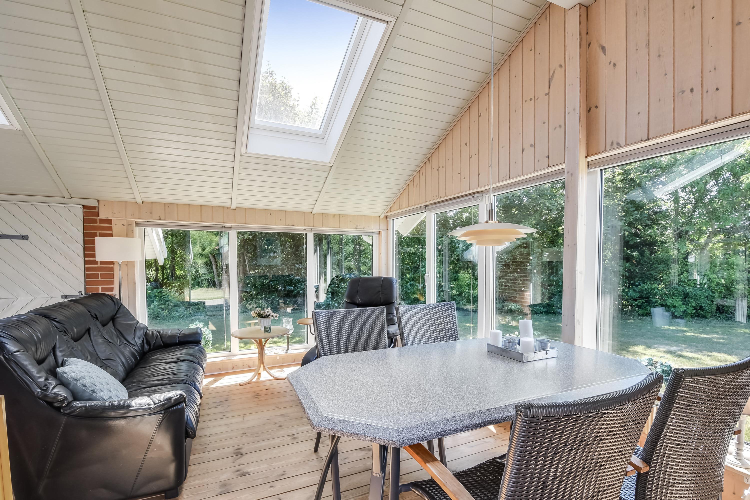 Fra stuen er der udgang til den skønne havestue, indrettet med sofa og spisebord – et perfekt sted at nyde aftenskaffen, uanset årstid.