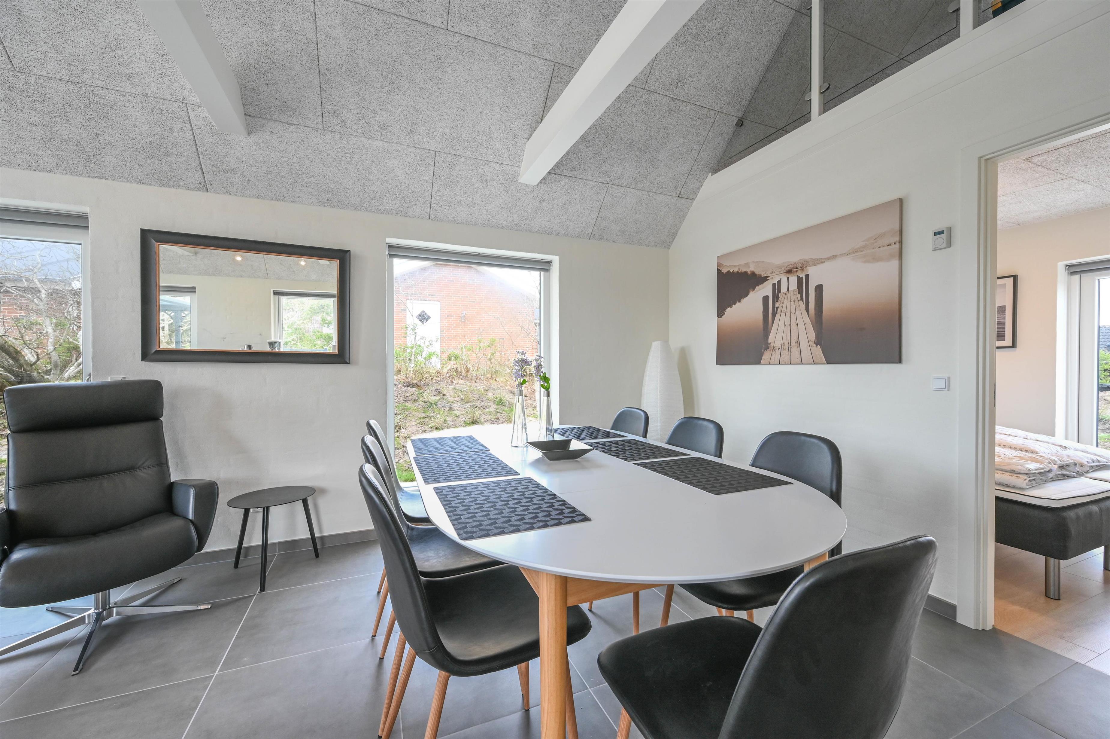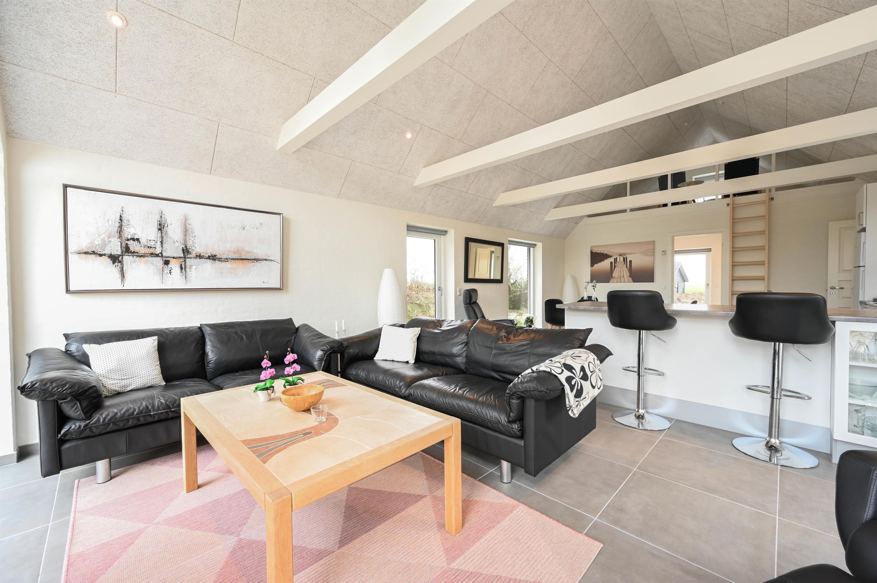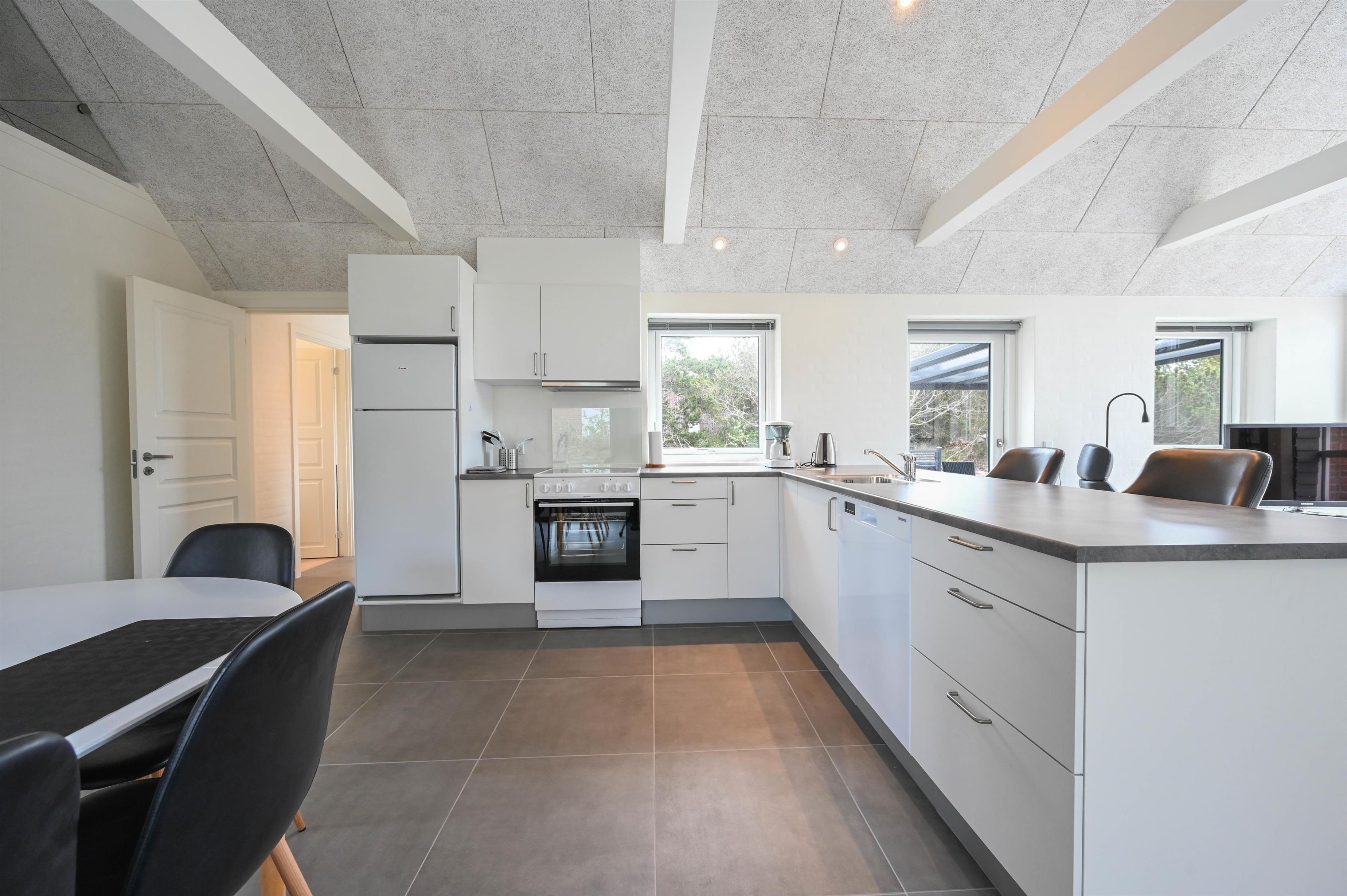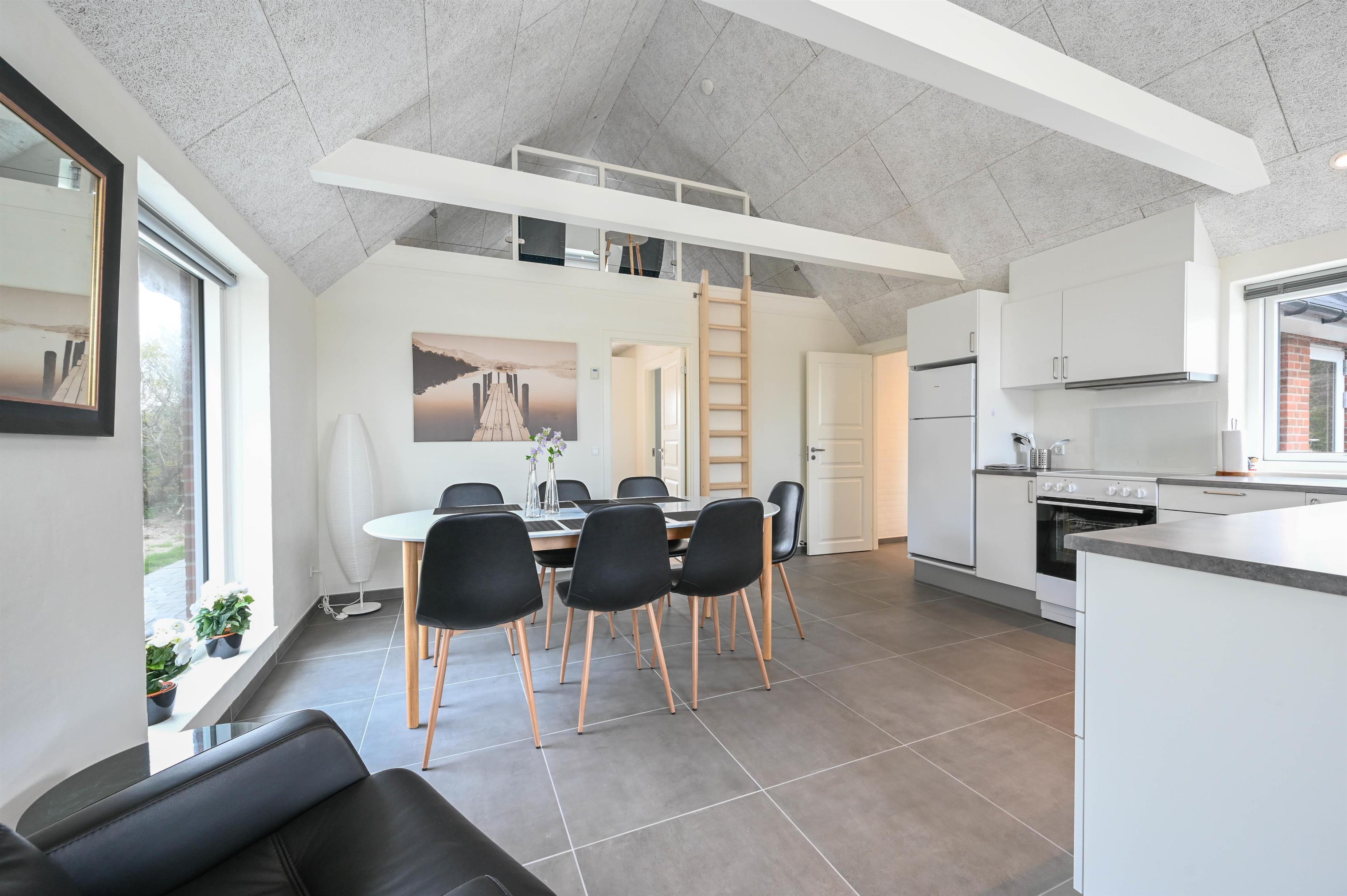 Det moderne feriehus byder på en lys og åben planløsning, hvor køkken, spiseplads og stue smelter naturligt sammen.